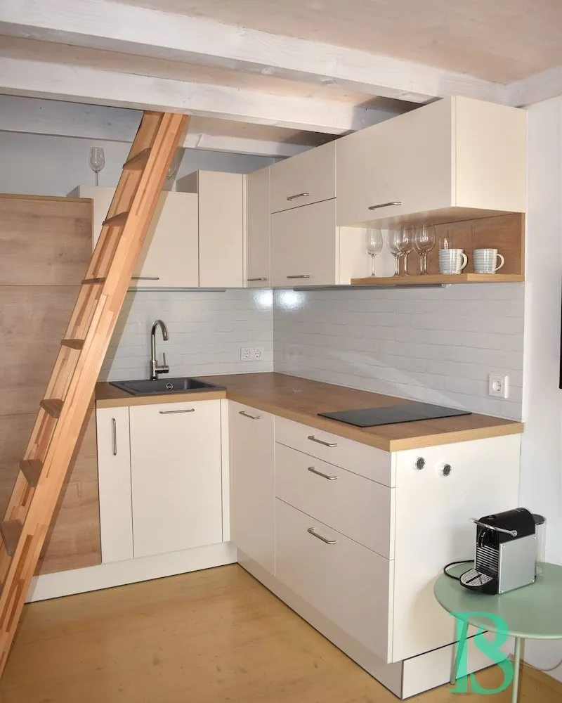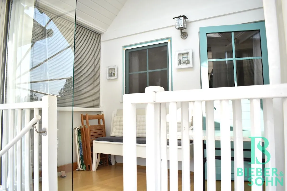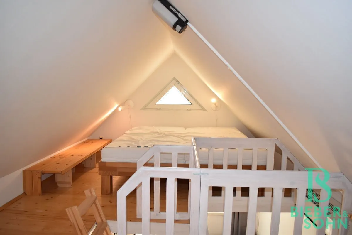 Das Obergeschoss (Galerie) mit Fenstern dient als Schlafplatz und kann über eine Leiter erreicht werden.