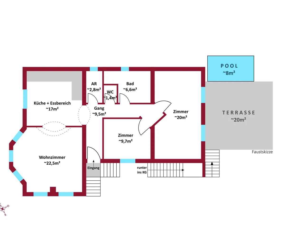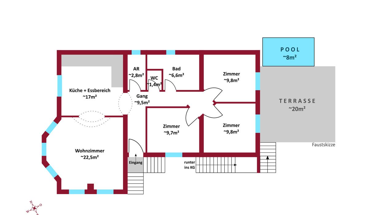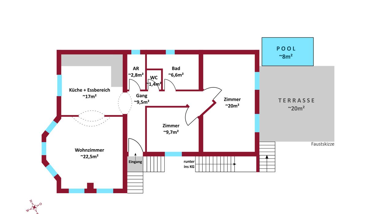 Auf der wunderschönen, großzügigen Terrasse befindet sich ein eingebautes Schwimmbecken mit den Maßen 4 x 2 Mete r, das sich ideal für eine erfrischende Abkühlung nach dem Saunagang eignet – beispielsweise, wenn im Keller eine Sauna eingerichtet wird. Im Garten stehen zudem zwei Stellplätze sowie ein gebohrter Brunnen zur Verfügung.