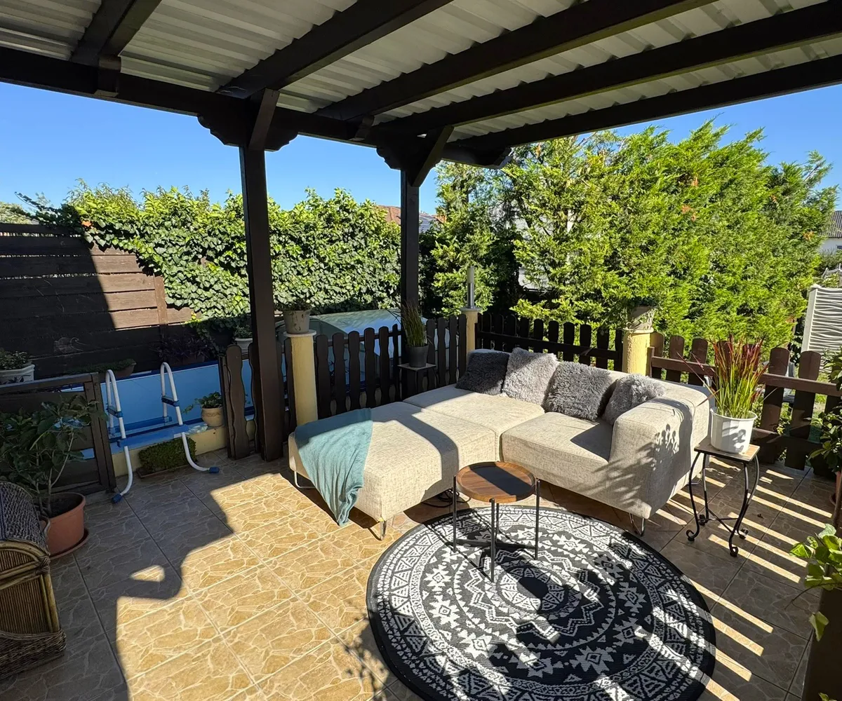 A gyönyörű, tágas teraszon egy 4x2 méteres, beépített medence kapott helyet, amely tökéletes lehet egy frissítő csobbanásra a szaunázást követően – például, ha a pincében szauna kerül kialakításra . A kertben két kocsibeálló és egy fúrt kút is rendelkezésre áll.