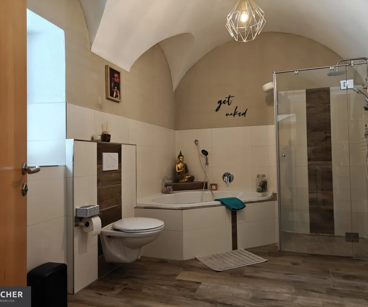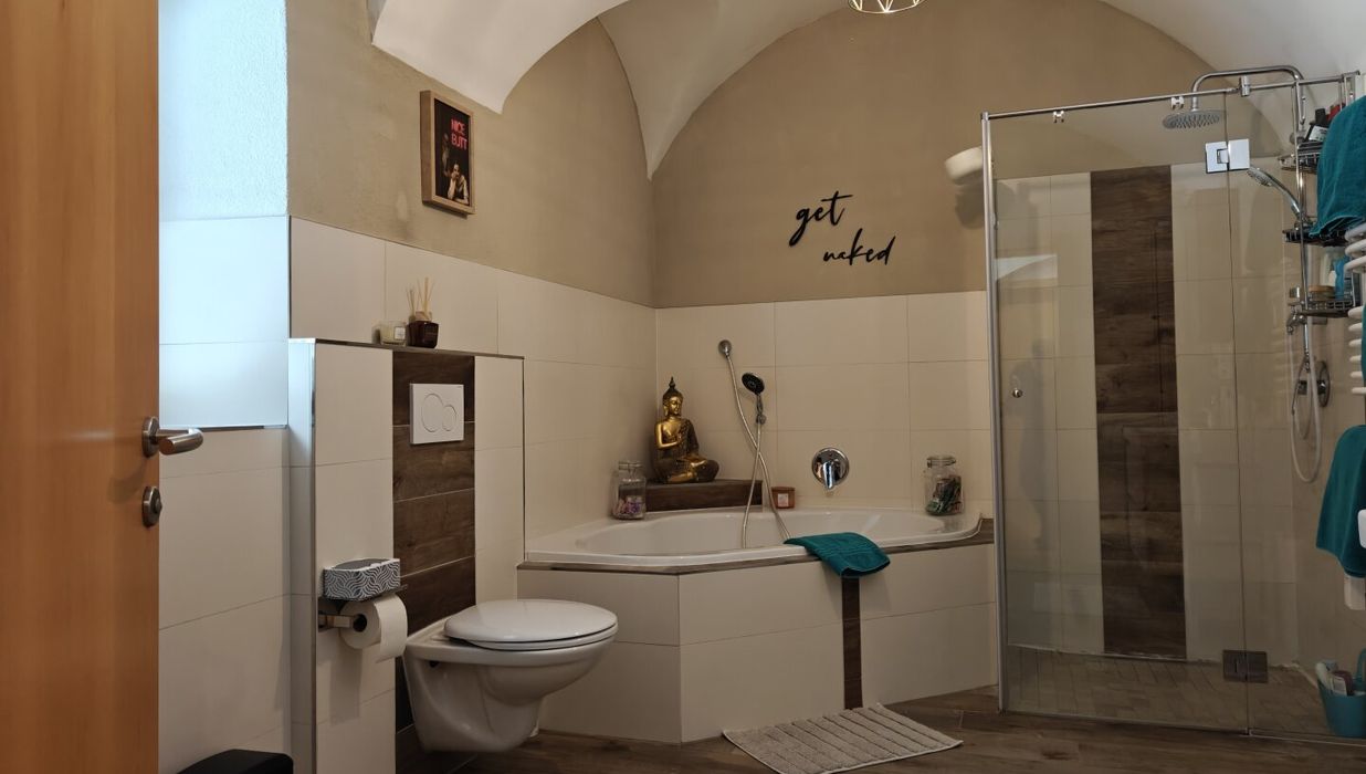 Das Badezimmer ist mit einem Fenster ausgestattet, sodass Tageslicht hereinströmt und eine angenehme Atmosphäre schafft. Hier finden Sie sowohl eine Badewanne als auch eine Dusche, die Ihnen die Möglichkeit bieten, sich nach einem langen Tag zu erholen und neue Energie zu tanken.