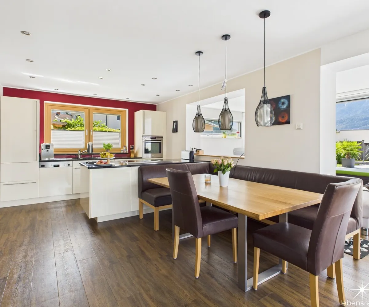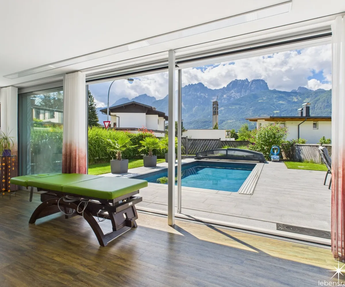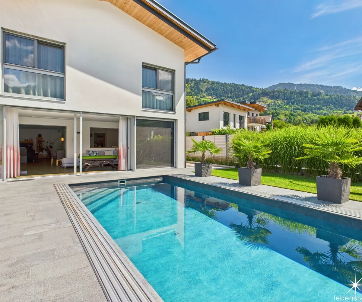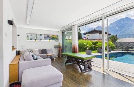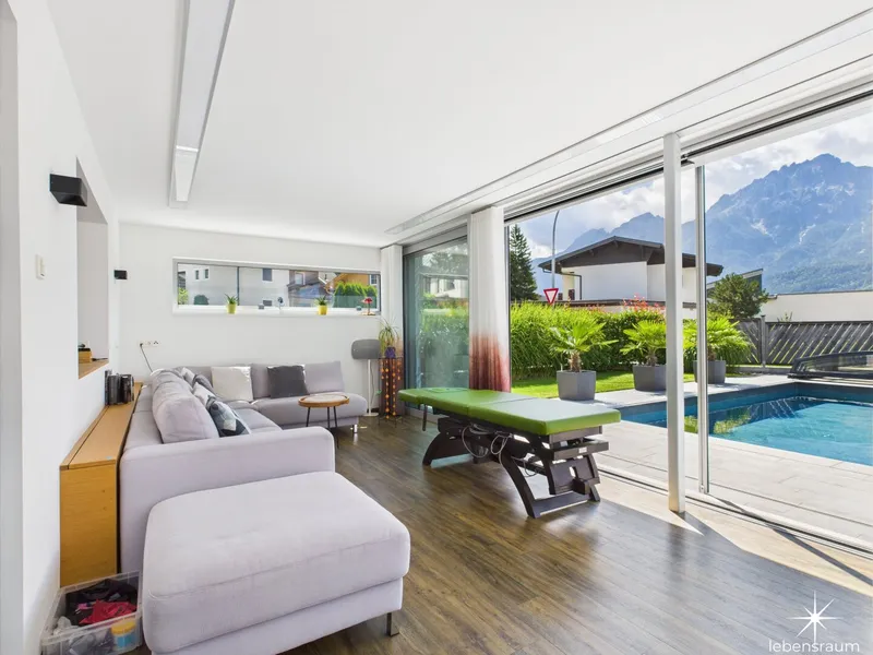 Bereits beim Betreten des Hauses spürt man: Hier wurde mit Liebe zum Detail geplant und hochwertig umgesetzt. Der lichtdurchflutete Wohn- und Essbereich mit Wintergarten (ca. 48 m²) bietet einen traumhaften Blick ins Grüne und direkten Zugang zur sonnigen Terrasse sowie dem überdachten Swimmingpool (7 m x 3,5 m) – perfekt für entspannte Sommertage.