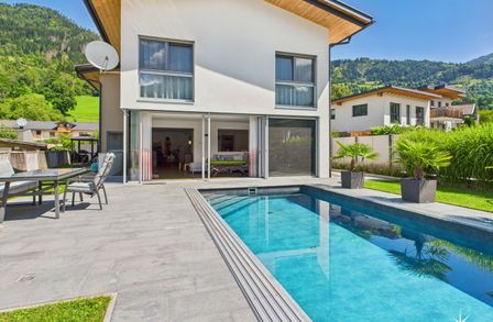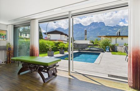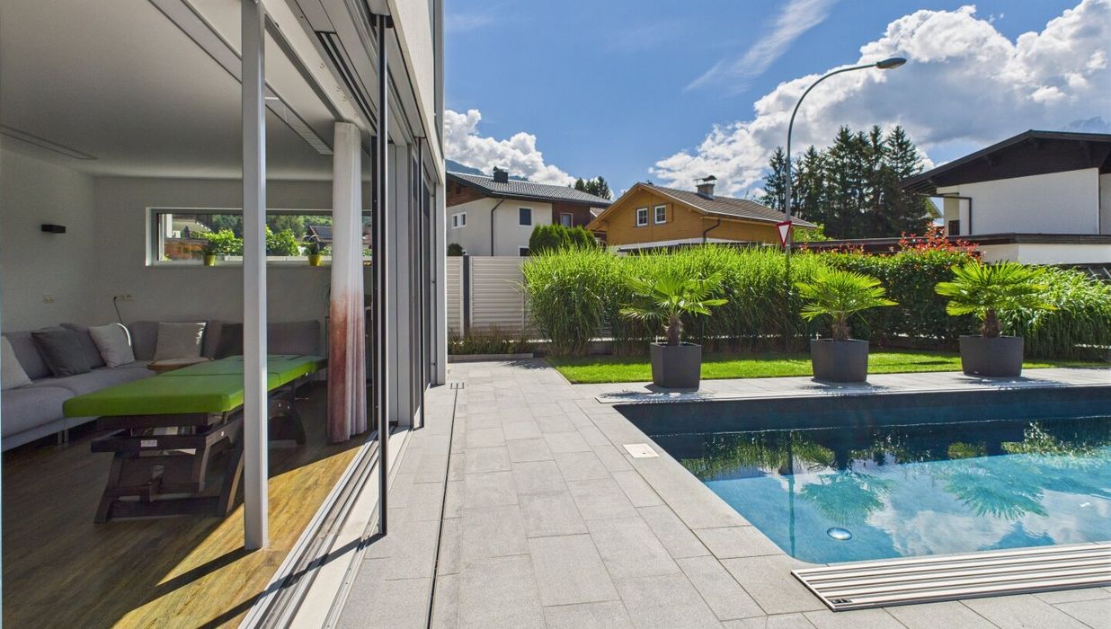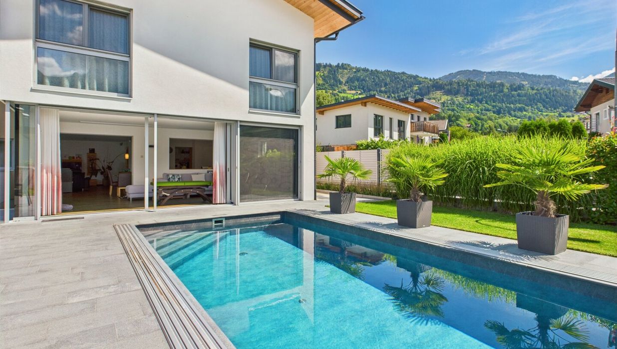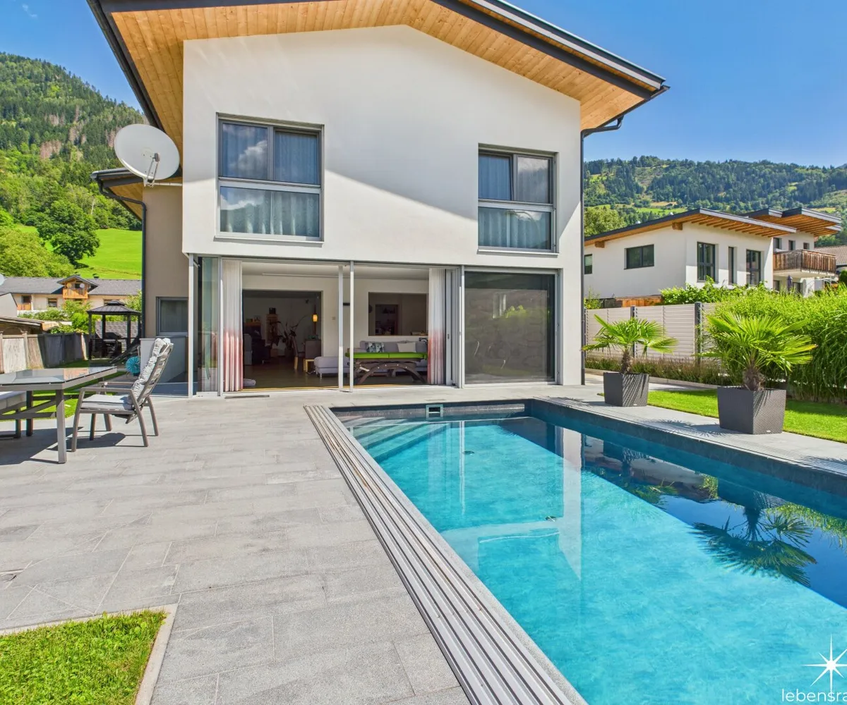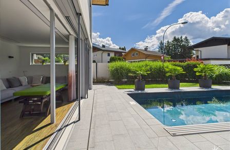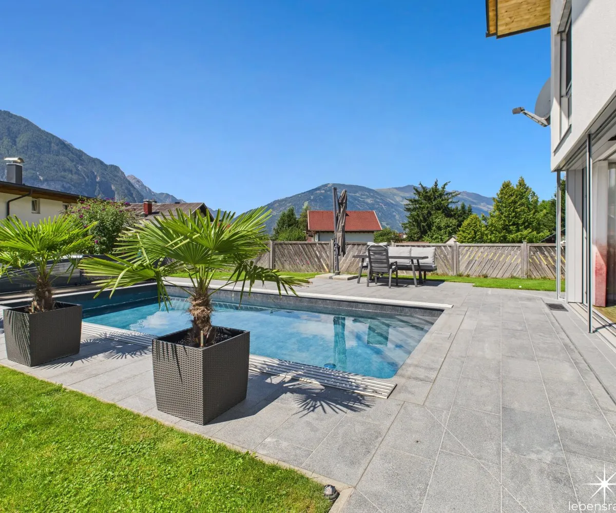 Bereits beim Betreten des Hauses spürt man: Hier wurde mit Liebe zum Detail geplant und hochwertig umgesetzt. Der lichtdurchflutete Wohn- und Essbereich mit Wintergarten (ca. 48 m²) bietet einen traumhaften Blick ins Grüne und direkten Zugang zur sonnigen Terrasse sowie dem überdachten Swimmingpool (7 m x 3,5 m) – perfekt für entspannte Sommertage.