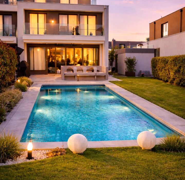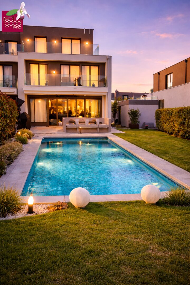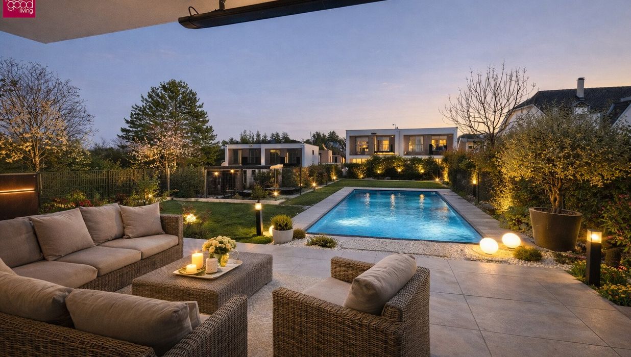 Klar gestalteter Außenraum mit Pool, großzügigen Terrassenflächen und ausgewählter Bepflanzung.