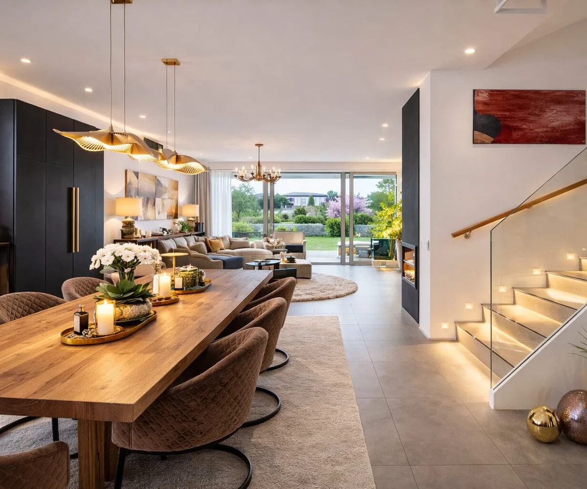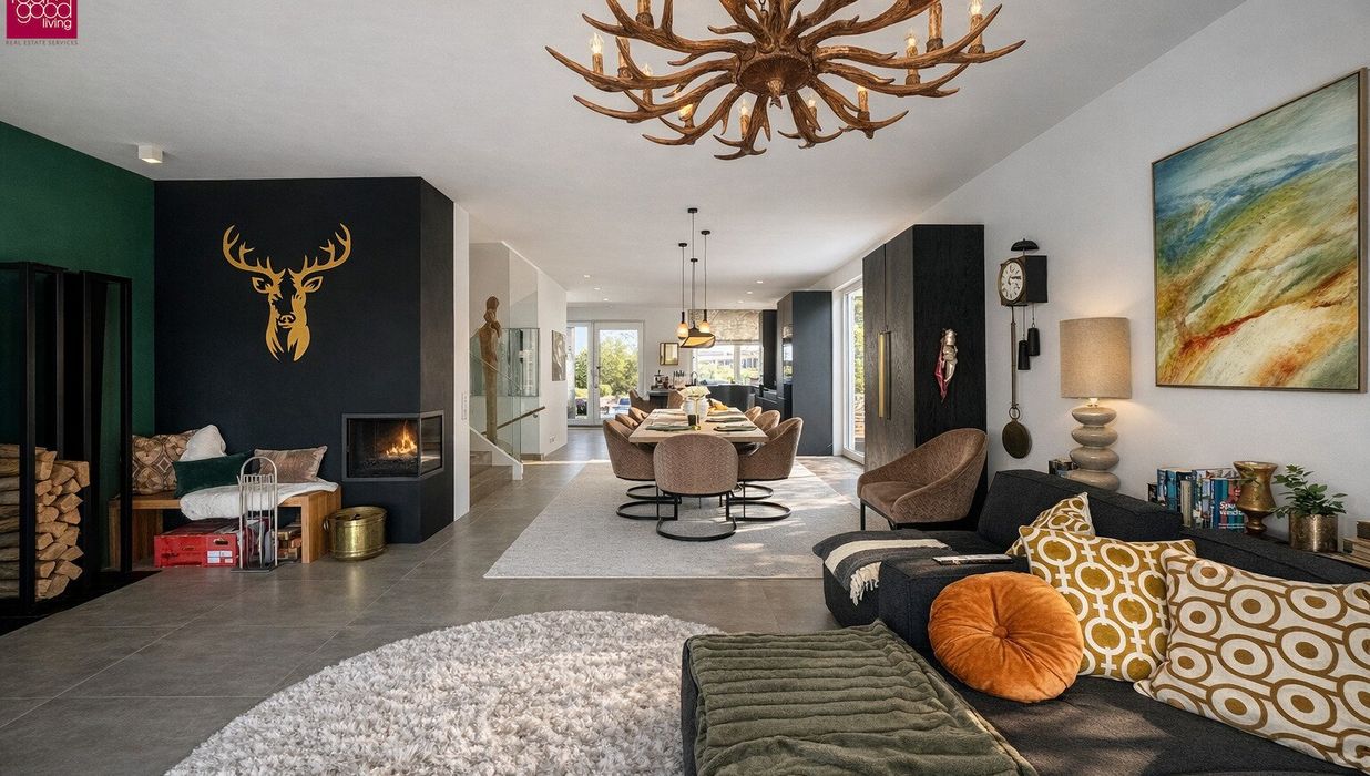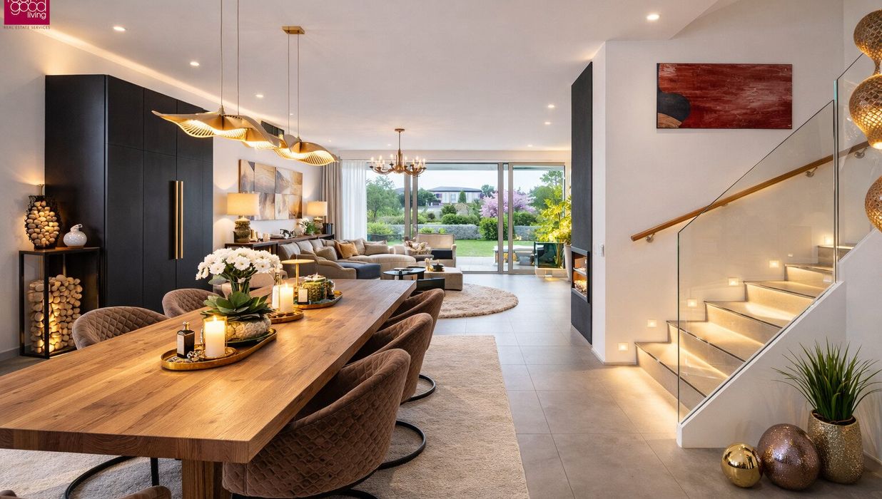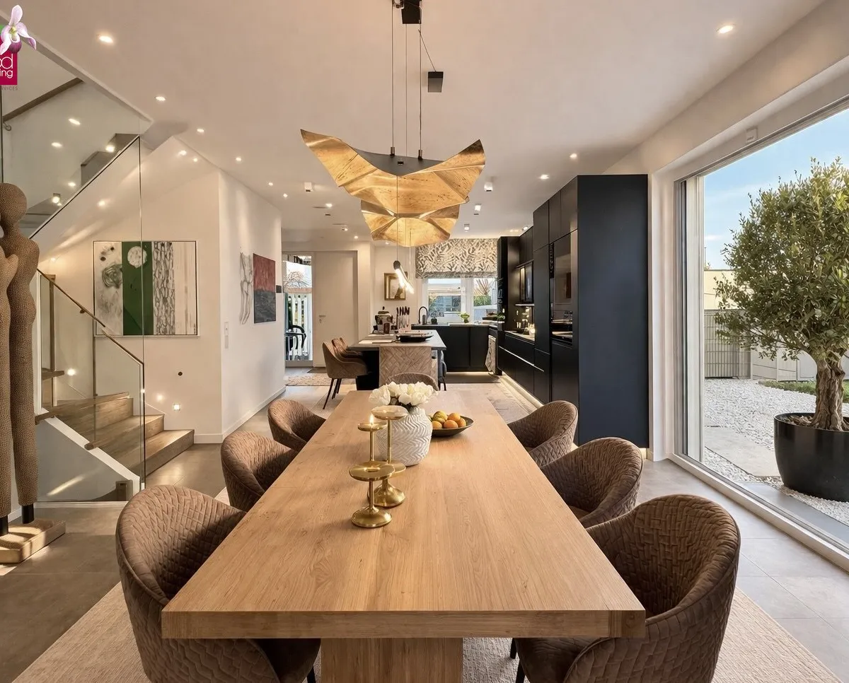 Offener Wohnbereich mit Designküche, Essplatz & stilvoller Wohnzone