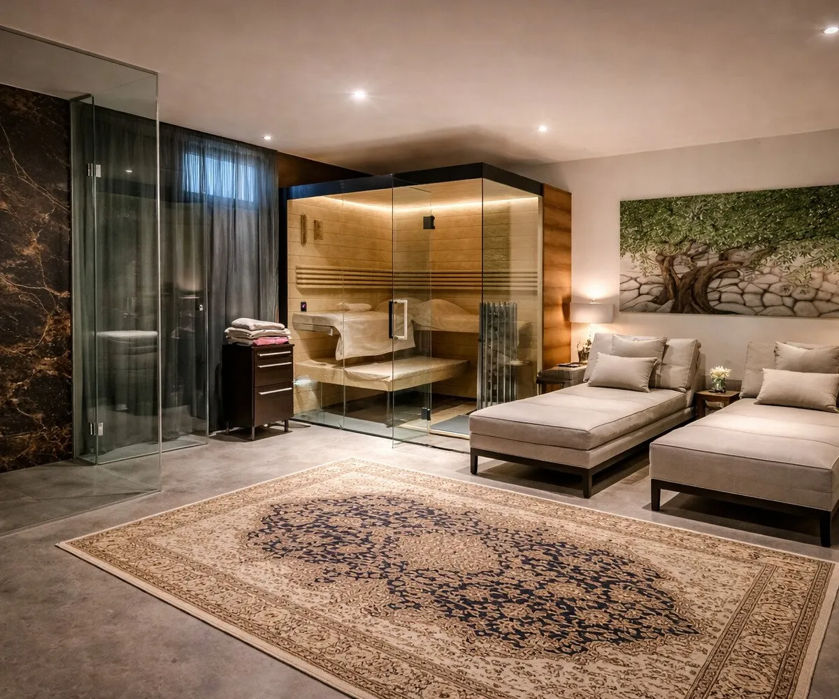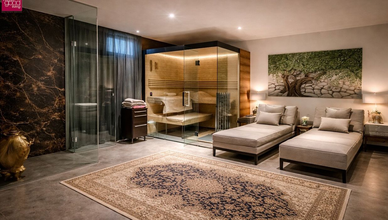 Privater Wellnessbereich im Untergeschoss: Glassauna, Ruhezone & Glasdusche