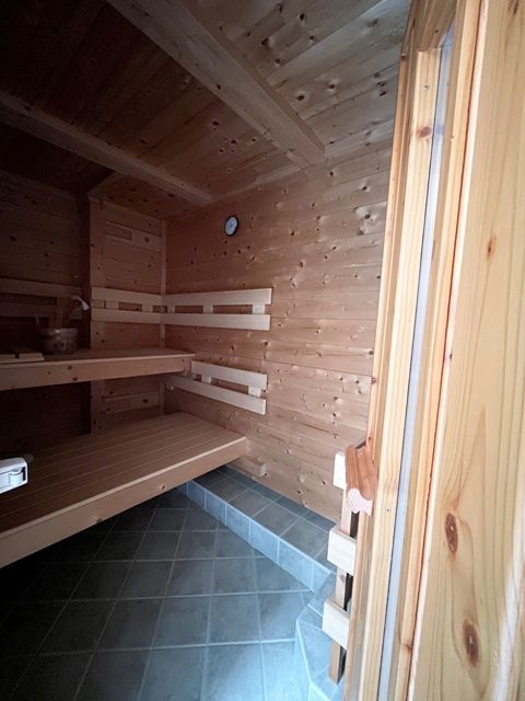 befindet sich ein separat begehbarer Bereich mit zwei hellen und freundlichen Räumen, einem WELLNESSBEREICH mit Sauna und viel Stauraum.