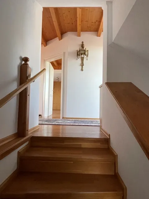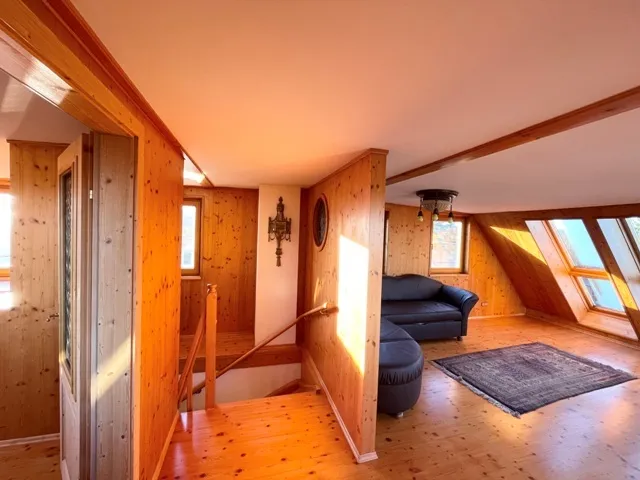 Ein Halbstock darüber befinden sich drei weitere Zimmer, eines verfügt über einen eigenen Schrankraum mit Wandtresor und eines der Zimmer hat eine Zugang zu einer sehr großzügigen Terrasse mit herrlichen Ausblick. Ebenso auf verfügt die Etage über ein großzügiges Badezimmer.
