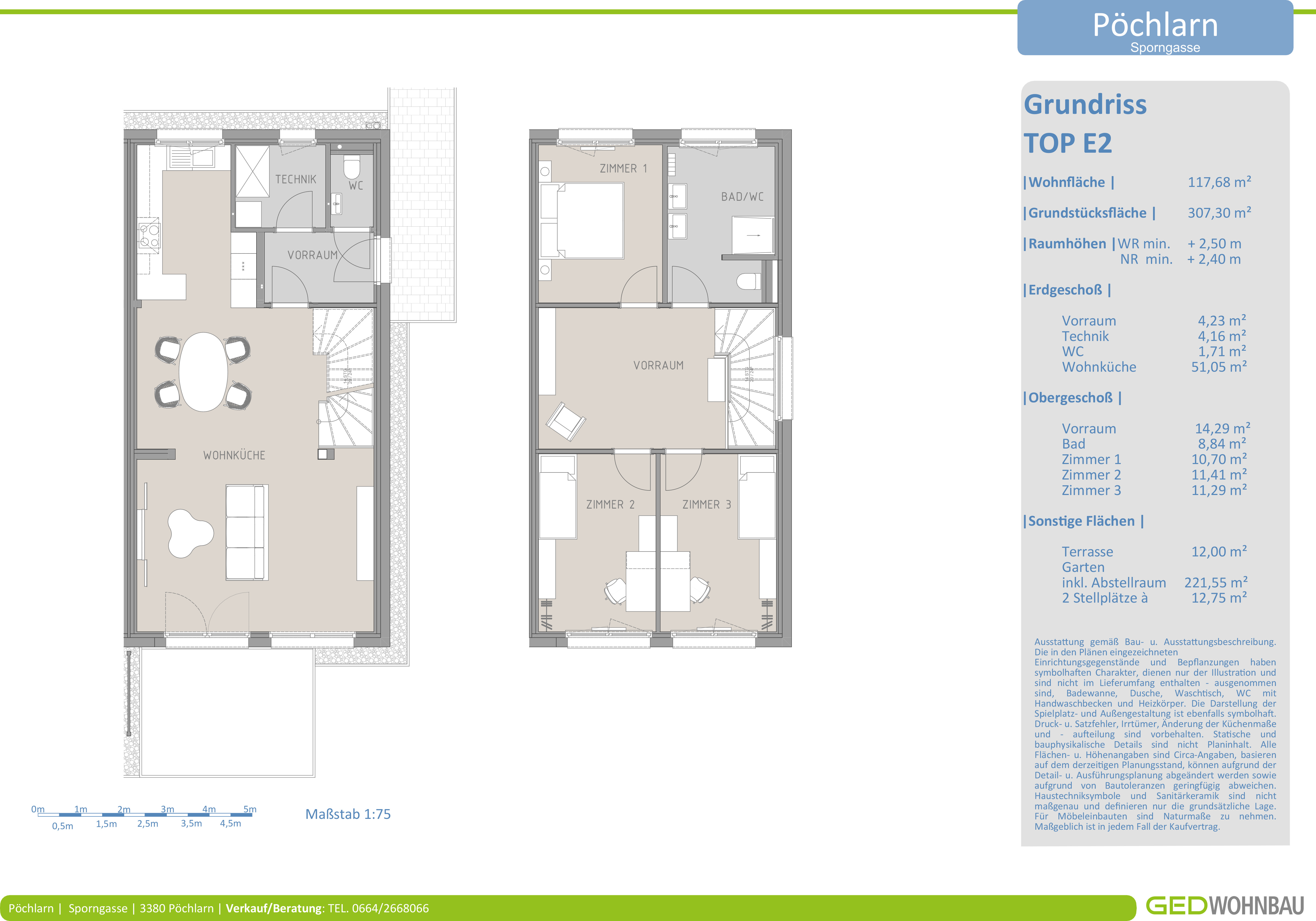 Das Erdgeschoss besteht aus einem lichtdurchfluteten offenen Wohn-, Koch- und Essbereich mit Zugang auf die Terrasse und in den Garten. Auf dieser Ebene befinden sich das Vorzimmer, ein Gäste-WC, der Technikraum und ein zusätzlicher Abstellraum, der auch gut als Büro genutzt werden kann. Im Obergeschoss befinden sich drei getrennt begehbare Schlafzimmer mit einer Galerie (Option für Schrankraum), sowie ein großzügiges Badezimmer mit Fenster. Die Terrasse und der südseitig ausgerichtete Garten laden zum Entspannen und Seele baumeln lassen ein.