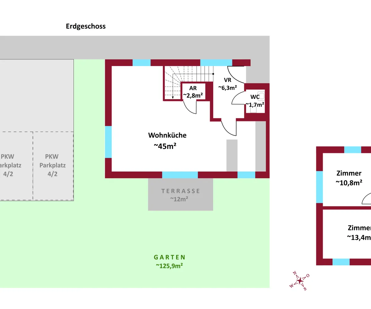 Zu jeder Wohneinheit werden 2 KFZ-Abstellplätze um jeweils 8.000,-- Euro mitverkauft.