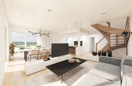 Die südseitig ausgerichteten Doppelhäuser werden in umweltschonender und energieeffizienter Massivholzbauweise errichtet. Geheizt wird mit einer Wärmepumpe. Die Energiewerte entsprechen dem Gold Standard. Bei den Fenstern handelt es sich um hochwertige 3-fach verglaste Kunststoff-Alu-Fenster. Es werden durchwegs nur hochwertigste Materialien verwendet, um maximale Qualität und Wohngenuss zu erzielen. Alle Doppelhaushälften verfügen über fünf geräumige Zimmer. Im Erdgeschoß befinden sich eine große Wohnküche, ein Wirtschaftsraum, ein WC, ein Technikraum sowie ein Vorraum. Aus dem Wohnzimmer gelangt man über eine