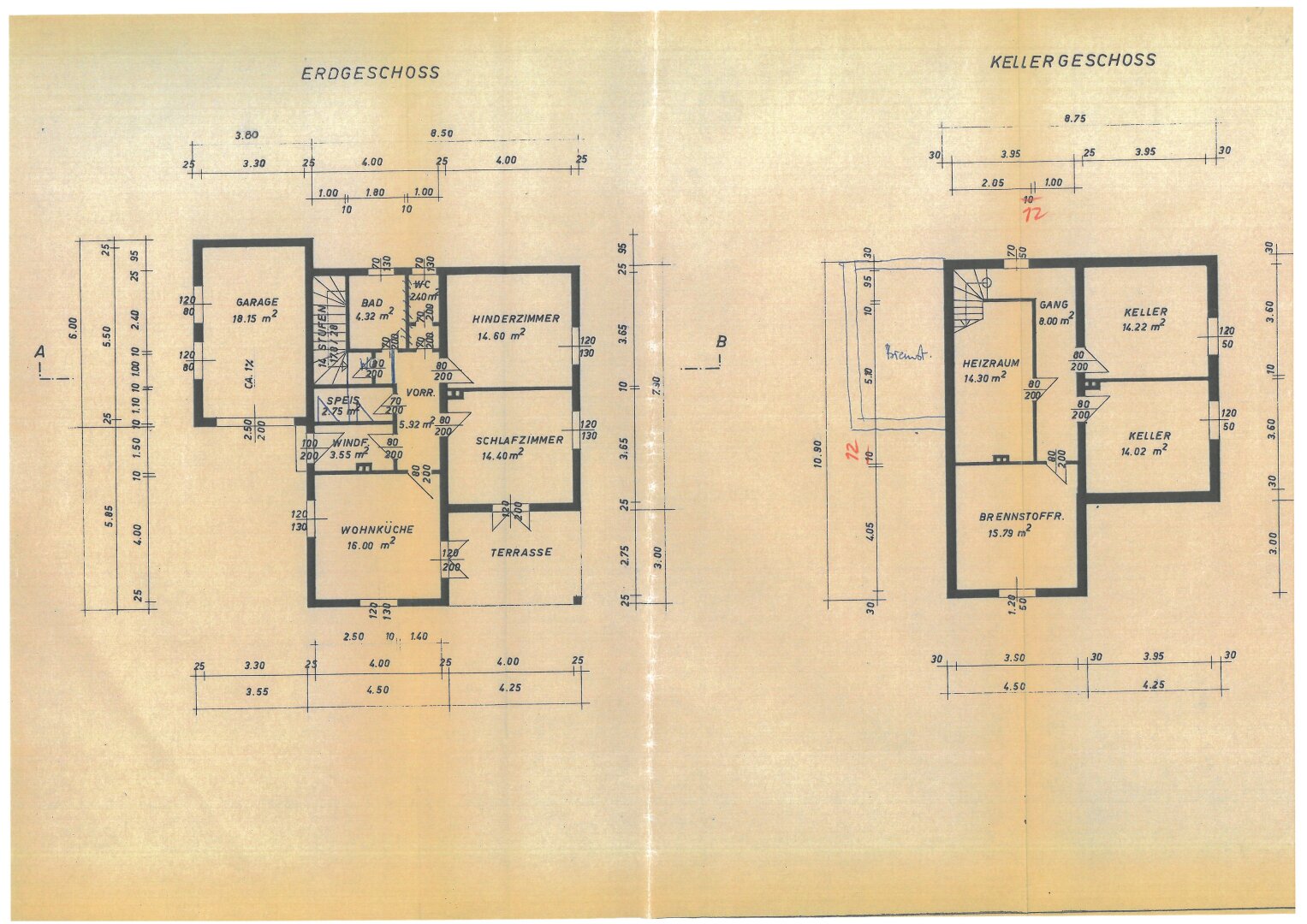 ERDGESCHOSS : ca. 60,00m² bestehend aus Windfang (3,55m²), Vorraum (5,92m²), Schlafzimmer/Wohnzimmer (14,40m²) mit Ausgang zur Terrasse, Schlafzimmer (14,60m²), neue Wohnküche (16,00m²) mit Ausgang zur überdachten Terrasse 10,00m² plus offener Terrasse 38,00m², Speis (1,18m²), Bad (4,32mm²) und WC (1,06m²).