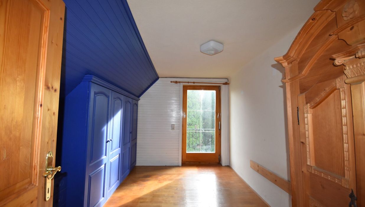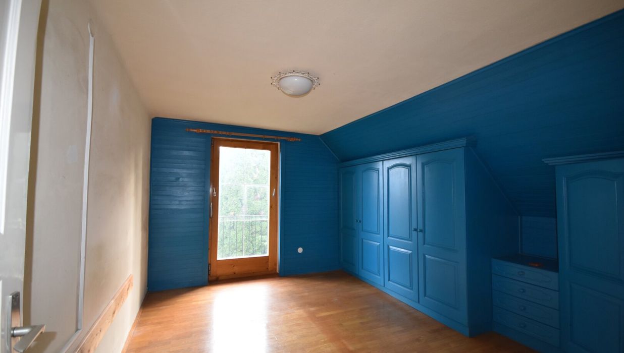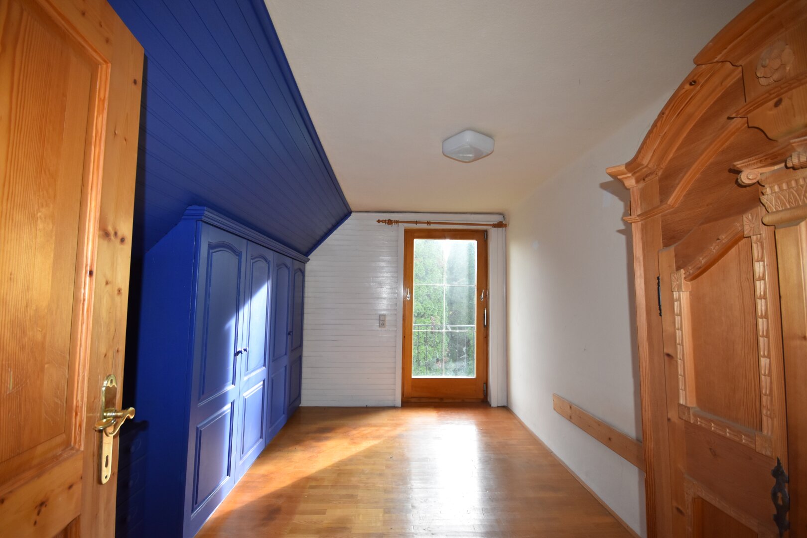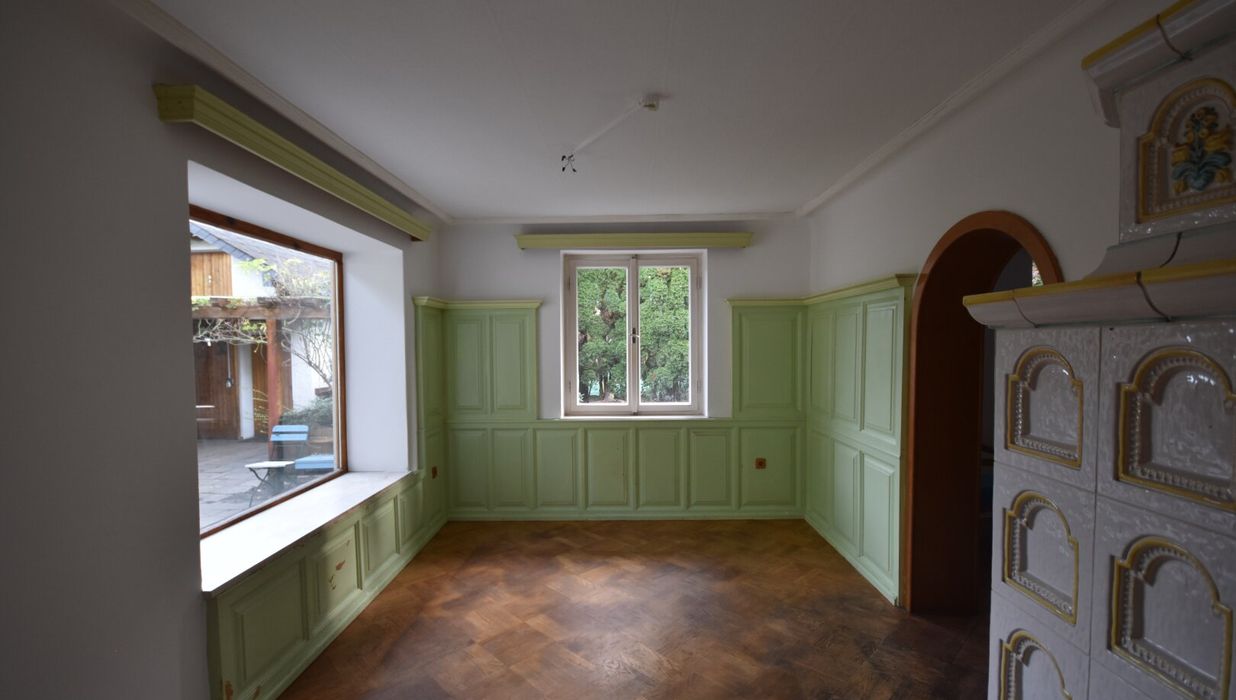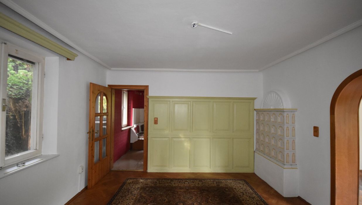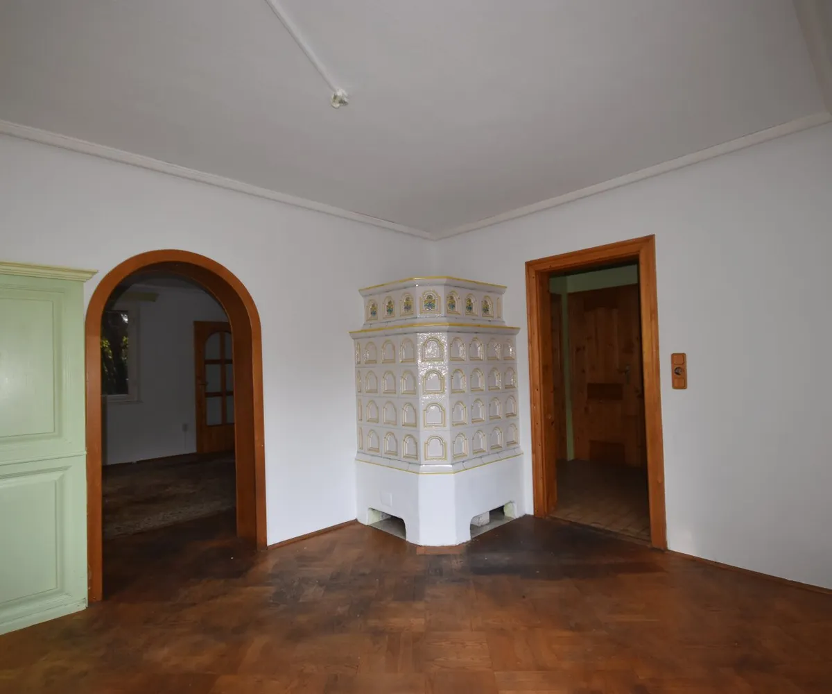 Die Raumaufteilung gliedert sich in Vorraum, Badezimmer mit Dusche und separaten WC, kleinen Abstellraum, sowie Küche mit Stube und einem Esszimmer mit Kachelofen, der ebenso vom Wohnzimmer aus genutzt werden kann. Im ersten Stock befinden sich zwei Schlafzimmer, wobei das eine kleinere Zimmer auch als Büro zu Verfügung stehen könnte. Beide Zimmer haben Zugang zu einem Balkon, der circa 6m² groß ist. Ebenso befindet sich auf dem Grundstück eine ca. 30 m² große Doppelgarage sowie ein separater Einzelstellplatz. Der noch unberührte Garten lädt zur kreativen Gestaltung ein.