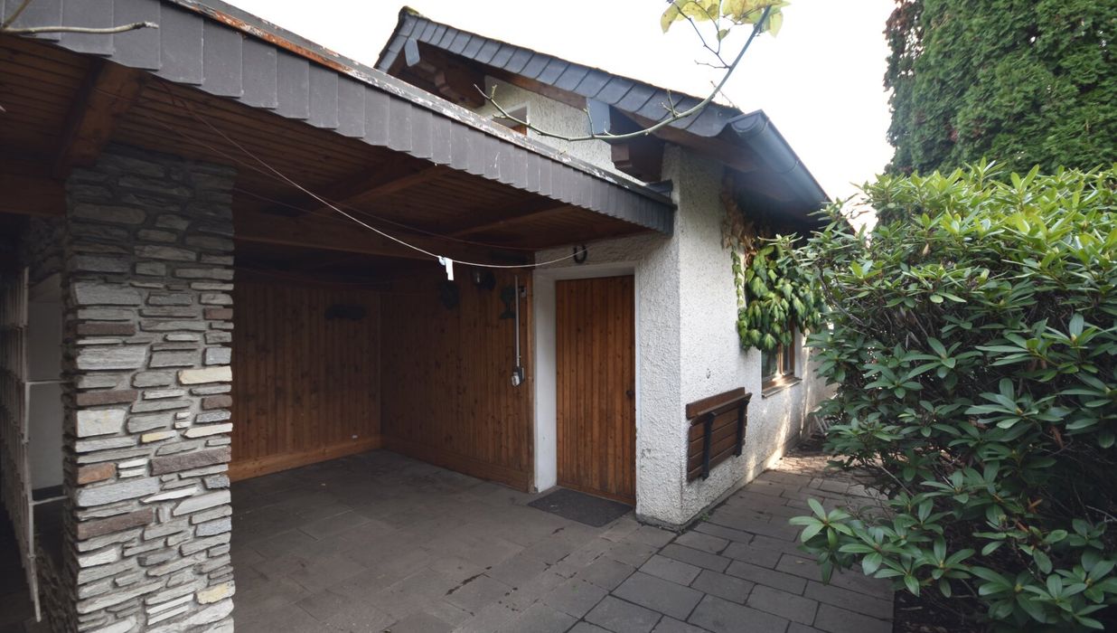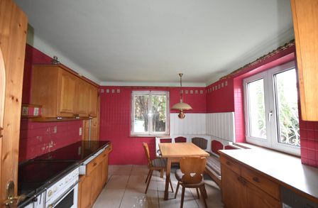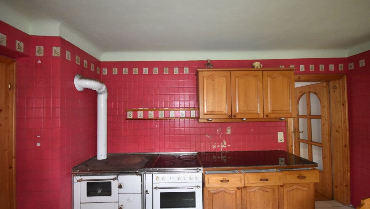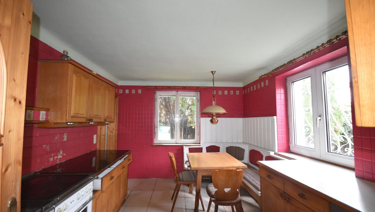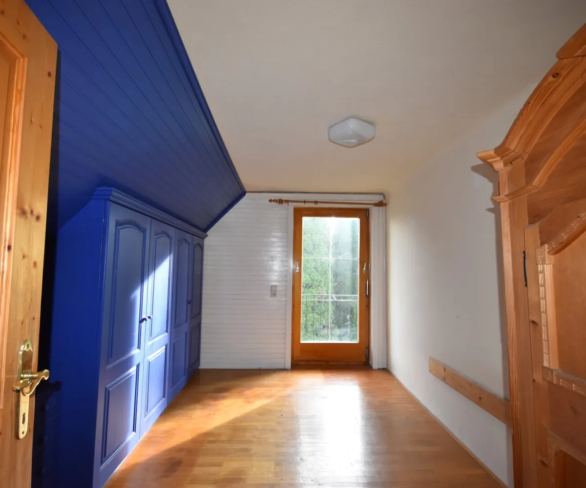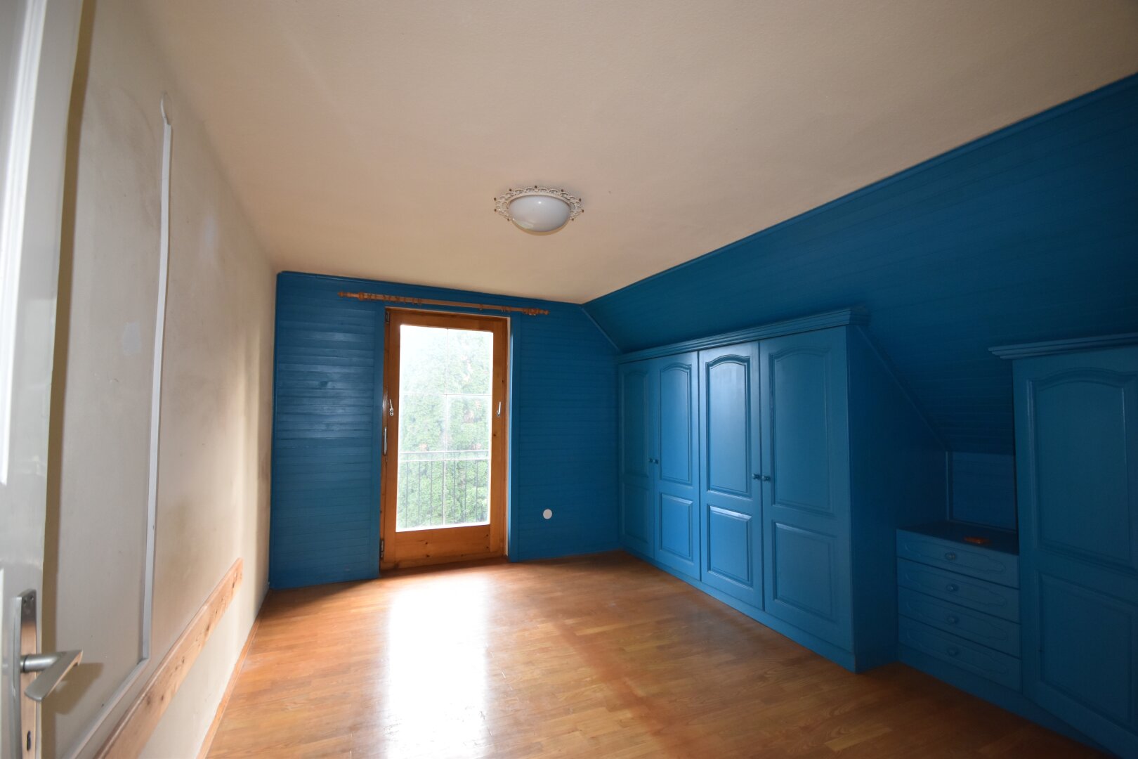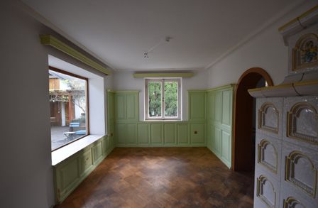 Die Raumaufteilung gliedert sich in Vorraum, Badezimmer mit Dusche und separaten WC, kleinen Abstellraum, sowie Küche mit Stube und einem Esszimmer mit Kachelofen, der ebenso vom Wohnzimmer aus genutzt werden kann. Im ersten Stock befinden sich zwei Schlafzimmer, wobei das eine kleinere Zimmer auch als Büro zu Verfügung stehen könnte. Beide Zimmer haben Zugang zu einem Balkon, der circa 6m² groß ist. Ebenso befindet sich auf dem Grundstück eine ca. 30 m² große Doppelgarage sowie ein separater Einzelstellplatz. Der noch unberührte Garten lädt zur kreativen Gestaltung ein.