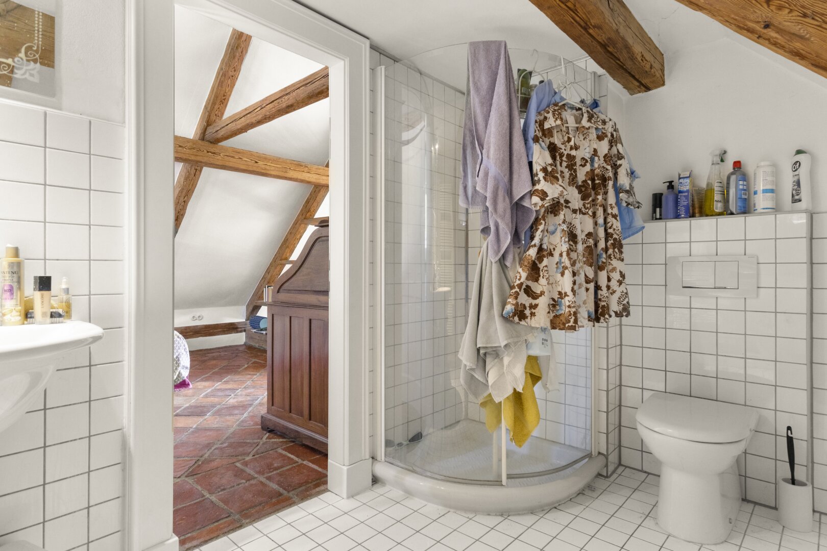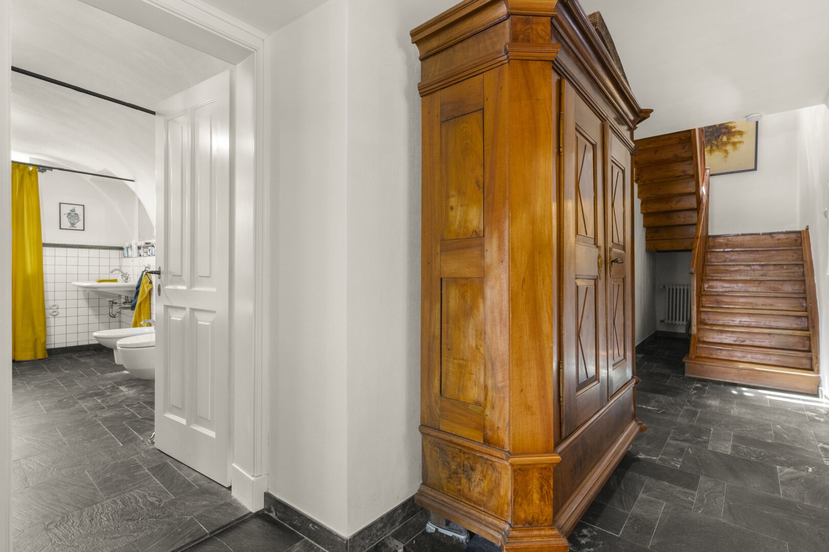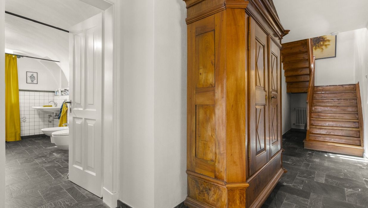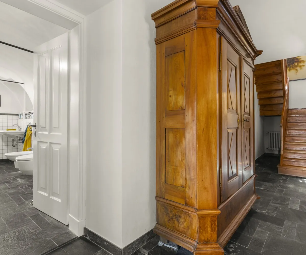 ² Wohnfläche, die sich auf drei Etagen verteilen. Im durchgehend mit Naturstein gefliesten Erdgeschoss befinden sich eine große Küche mit maßgefertigten Tischlerelementen, Arbeitsflächen aus Naturstein, einem Holzofen und einem Essbereich aus Apfelholz, ein Bad mit Badewanne, Bidet und WC sowie eine Diele mit Windfang. Von der Küche führt eine Tür auf die steingeflieste, rund um das Haus laufende, von Büschen und Bäumen umrahmte große Terrasse – im Sommer ein „Extra-Zimmer“, von dem aus man einen herrlichen Blick auf die 800 Jahre alte Burg hat. Die alten Lärchenböden und -treppen im oberen Bereich des Hauses wurden fachgerecht aufgearbeitet, Fenster, Fensterläden und Türen sind hochwertige Einzelanfertigungen. Im ersten Obergeschoss liegen drei helle Zimmer, die als Schlaf-, Arbeits- oder Gästezimmer genutzt werden können. Das loftartig gestaltete Dachgeschoss besticht durch Sichtbalken, historischen Ziegelboden und einen Balkon mit Aussicht ins Grüne. Außerdem befinden sich hier ein kleines Bad mit Dusche und Bidet sowie ein begehbarer gemauerter Schrank.