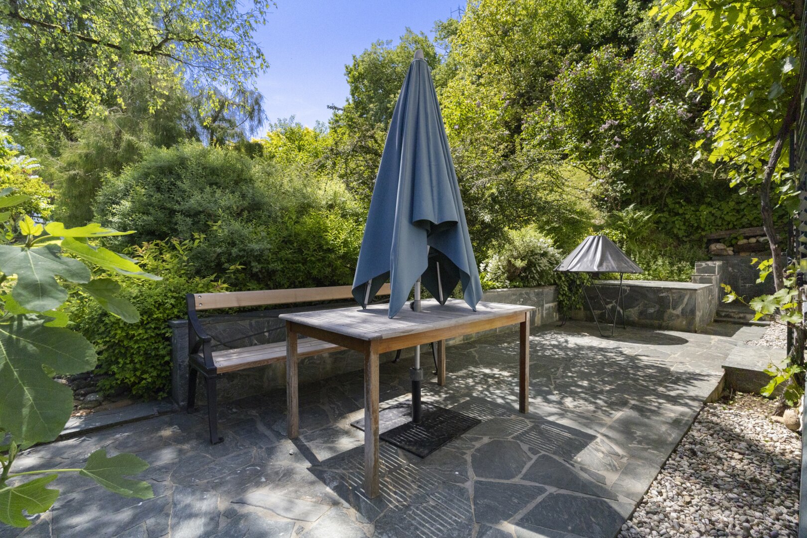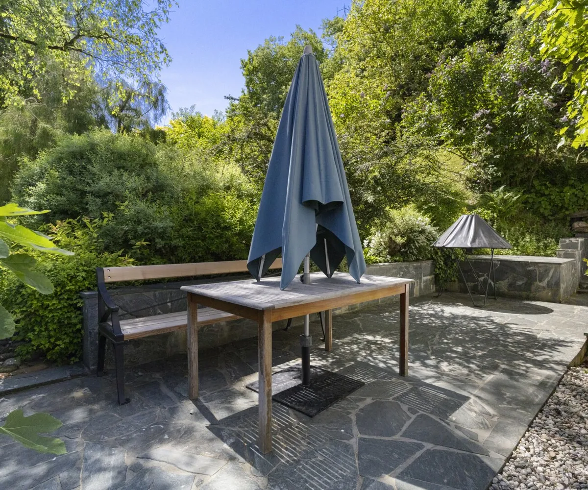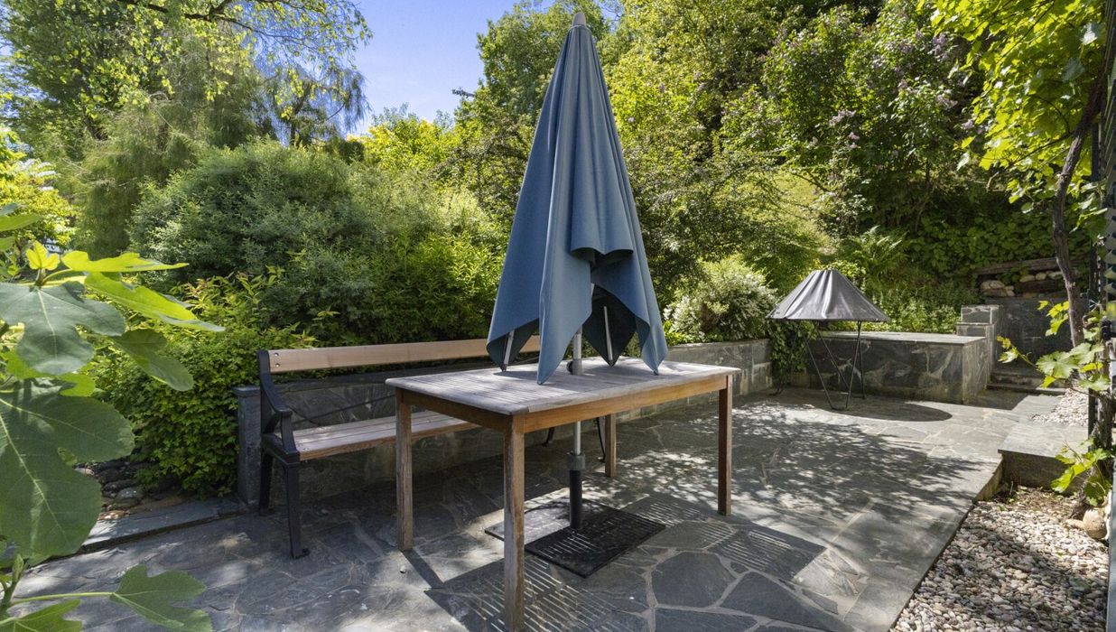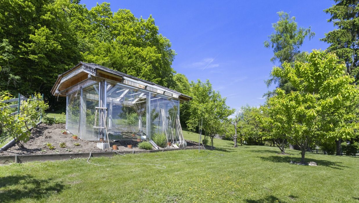 stilvoll, ökologisch und funktional gestaltet. Neben Rhododendren, Hortensien, Rosen und alten Bäumen gibt es ein fruchtbares Gemüsebeet, das seit vielen Jahren mit natürlichem Dünger angereichert wird. Auf dem Beet steht ein belüftetes, schindelgedecktes Gewächshaus, in dem besonders Tomaten hervorragend gedeihen. Zwei Wasseranschlüsse auf dem Gelände erleichtern die Bewässerung.