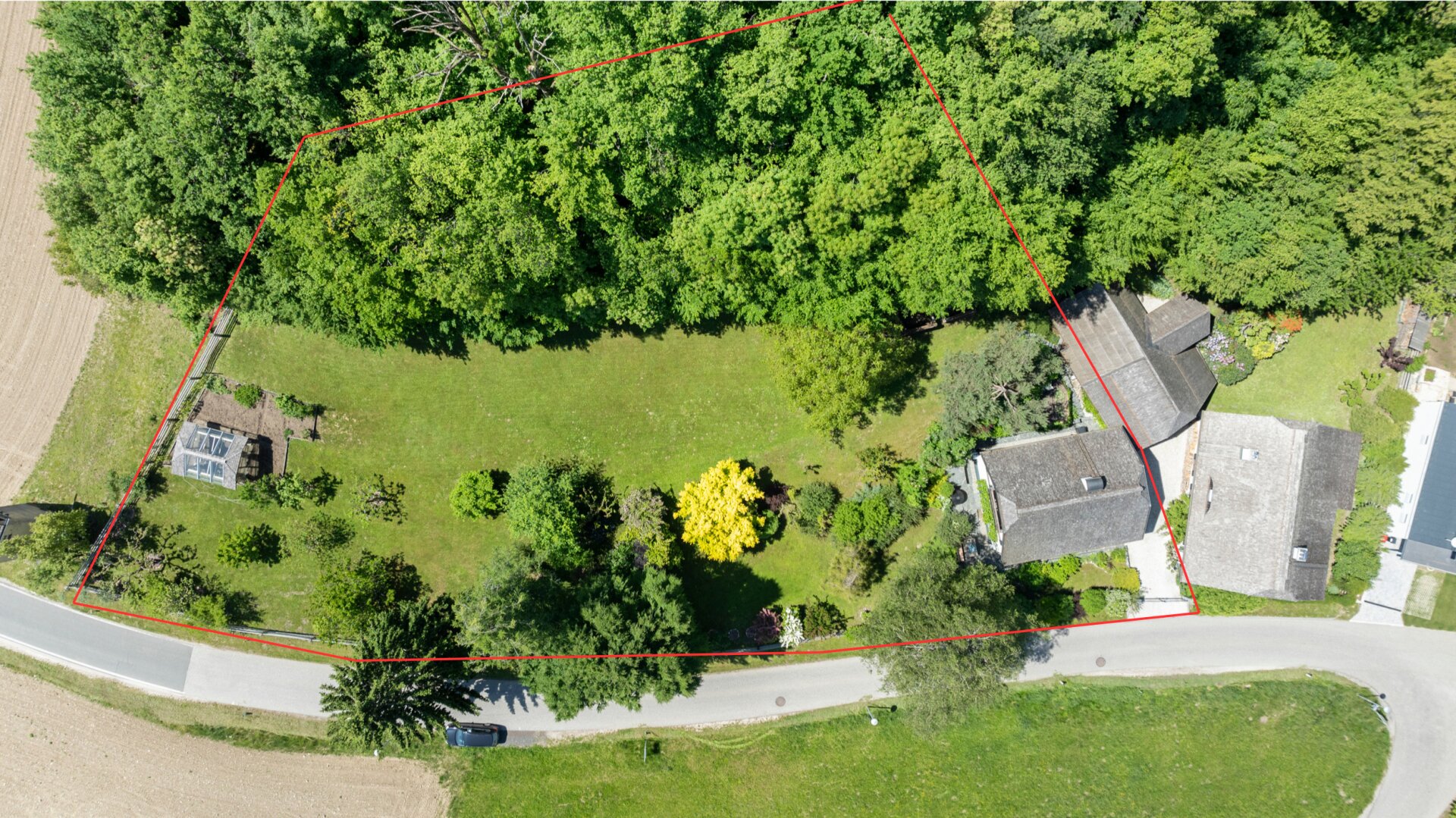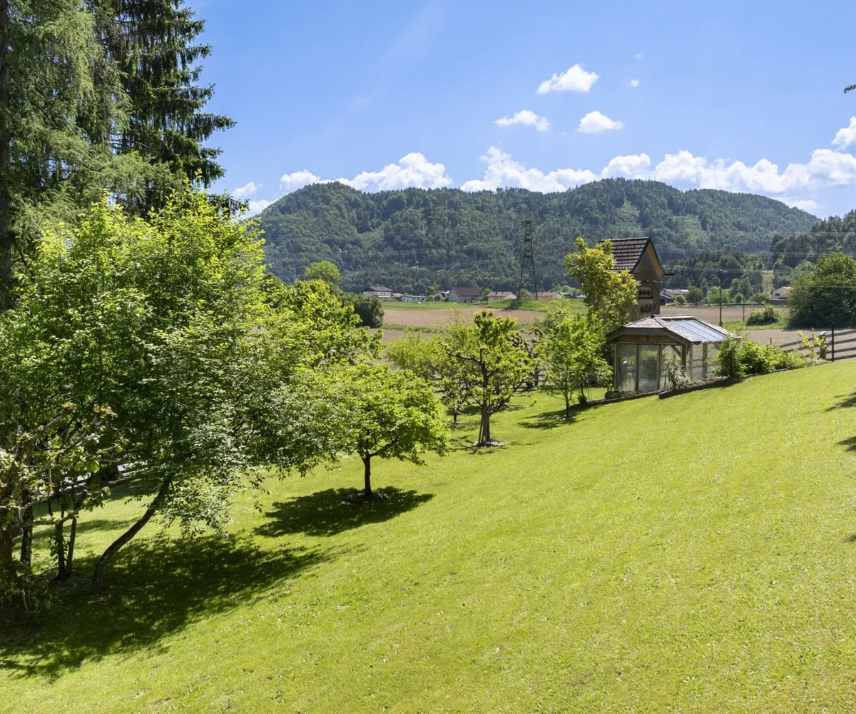 ück steht ein dreistöckiges Wohnhaus als Hauptgebäude, eine in den Hang gebaute Scheune mit Naturstein- und Holzelementen sowie ein modernes Gewächshaus aus Holz und Glas. Dazu kommen ein ertragreicher Nutzgarten, zahlreiche Obstgehölze, alles eingebettet in eine hügelige Landschaft mit Blick auf den Hochobir.