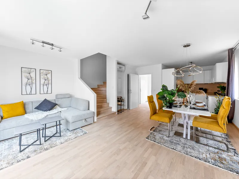 Die Ausstattung der Häuser lässt keine Wünsche offen. Die behagliche Fußbodenheizung mittels Luft-/Wasserwärmepumpe sorgt für Komfort und angenehme Raumtemperaturen. Eine effiziente Photovoltaikanlage ermöglicht grüne und kosteneffiziente Energieversorgung. Die dreifach verglasten Kunststoff- und Alufenster mit außenliegendem Sonnenschutz bieten optimalen Schutz vor Lärm und Sonneneinstrahlung. Die Innenräume beeindrucken durch exquisite Holzböden und Designerfliesen, die die Räume warm und einladend wirken lassen.
