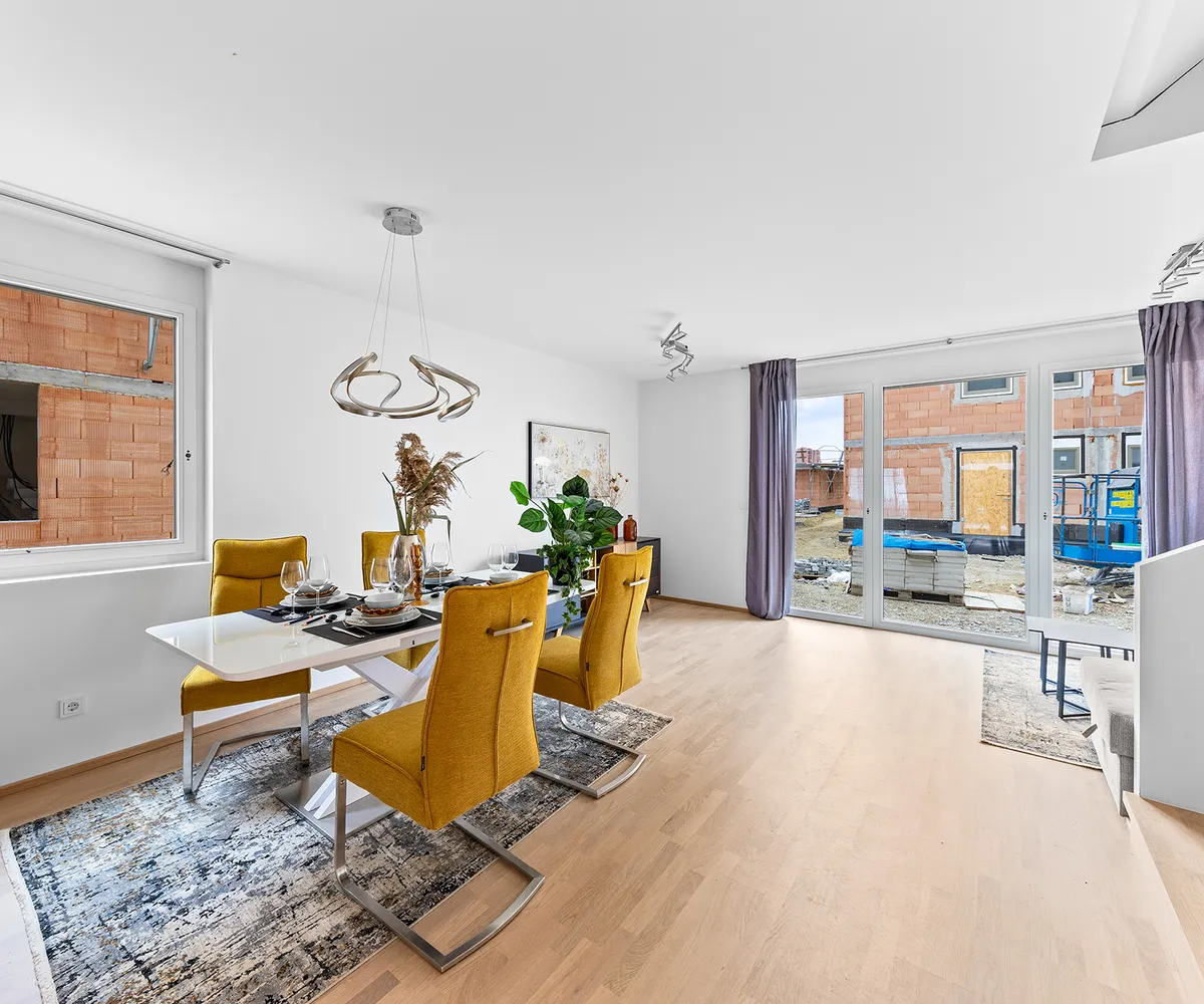 Die Ausstattung der Häuser lässt keine Wünsche offen. Die behagliche Fußbodenheizung mittels Luft-/Wasserwärmepumpe sorgt für Komfort und angenehme Raumtemperaturen. Eine effiziente Photovoltaikanlage ermöglicht grüne und kosteneffiziente Energieversorgung. Die dreifach verglasten Kunststoff- und Alufenster mit außenliegendem Sonnenschutz bieten optimalen Schutz vor Lärm und Sonneneinstrahlung. Die Innenräume beeindrucken durch exquisite Holzböden und Designerfliesen, die die Räume warm und einladend wirken lassen.