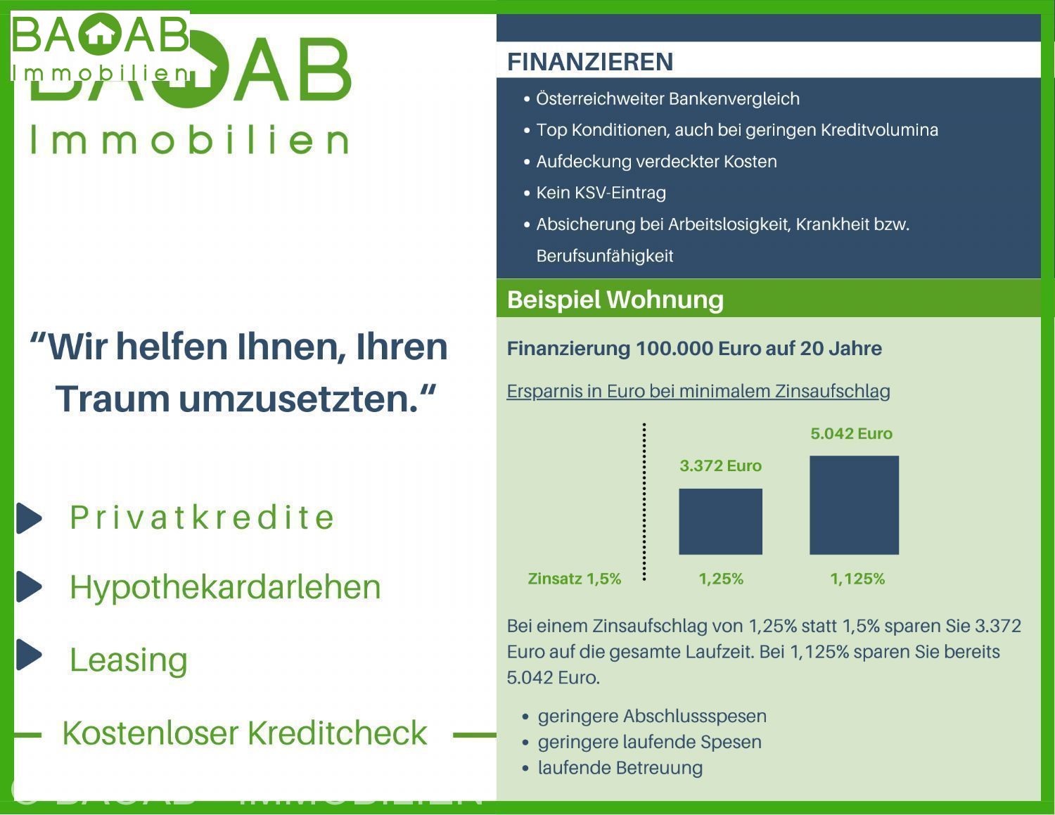 Bei jedem Kauf einer Immobilie oder eines Grundstücks ist es wichtig, die passende Finanzierung zu finden. Mit seiner eigenen Vertriebsorganisation ist Infina als Wohnbau-Finanz-Experte an über 100 Standorten in ganz Österreich vertreten und vermittelt Finanzierungen an über 150 Banken und Bausparkassen. Nutzen Sie unseren kostenlosen Kreditvergleich für den passenden Wohnkredit: