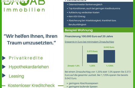 *Der Vertrag kommt nicht mit der INFINA Credit Broker GmbH zustande. Das Objekt wird von einem externen Immobilienunternehmen angeboten. Allfällige aus dem Vertragsabschluss resultierende Rechte sind ausschließlich gegenüber dem anbietenden Immobilienunternehmen geltend zu machen. Wir weisen Sie darauf hin, dass die gemachten Angaben und Informationen lediglich unverbindliche Vorabinformationen sind und daher ohne Gewähr erfolgen. Der Vermittler ist als Doppelmakler tätig.