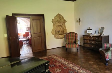 Das dreigeschossige Schloss beeindruckt mit vier charakteristischen Ecktürmen, prachtvollen Kassettendecken, original erhaltenen Holz- und Stuckelementen sowie einer barocken Kapelle aus dem Jahr 1669.