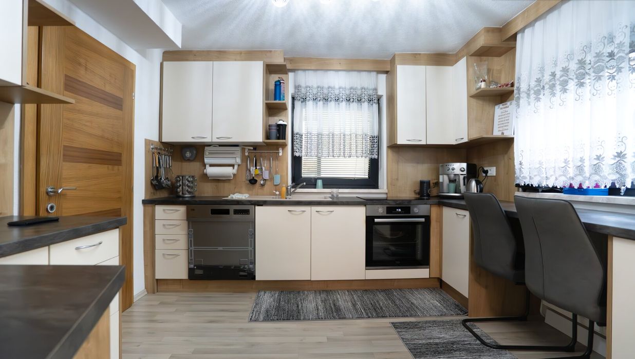 Im Erdgeschoss erwarten Sie ein einladender Eingangsbereich, ein zentraler Vorraum, eine voll ausgestattete Küche, ein gemütliches Wohnzimmer, ein weiteres Zimmer sowie ein Badezimmer mit WC.
