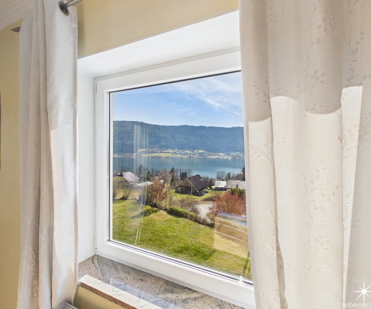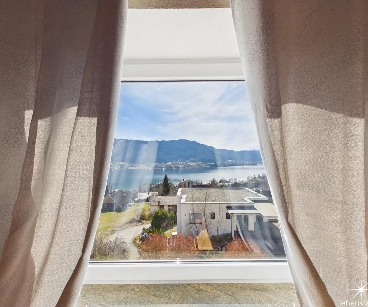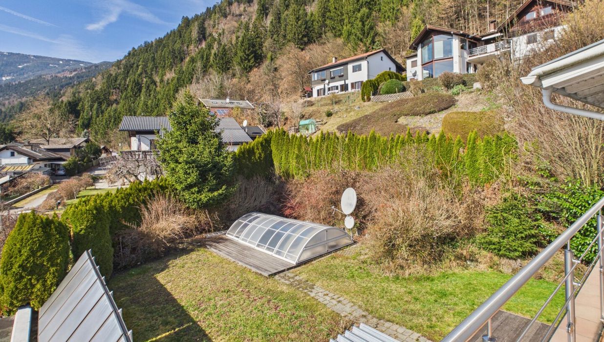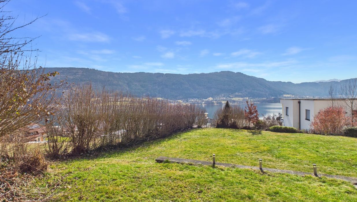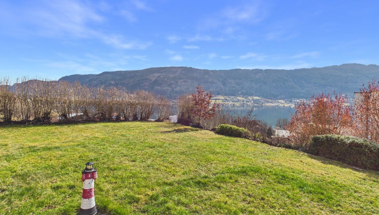 Attraktive, abgeschlossene Hauptwohnung mit sehr großzügigem Wohnzimmer mit einem gemauerten Ofen und teilintegrierter Küche sowie Zugang auf die Terrasse. Der direkte Blick auf den Ossiachersee und die umliegende Bergwelt des Dreiländerecks Österreich, Italien und Slowenien. 3 Schlafzimmer, der Sanitärbereich und ein attraktiver Wintergarten mit schönem Seeblick sind ebenfalls Bestandteil des Geschoßes. Der südwestliche Teil des Gartens inklusive dem Swimmingpool mit Entsalzungsanlage ist über die Terrasse direkt begehbar.