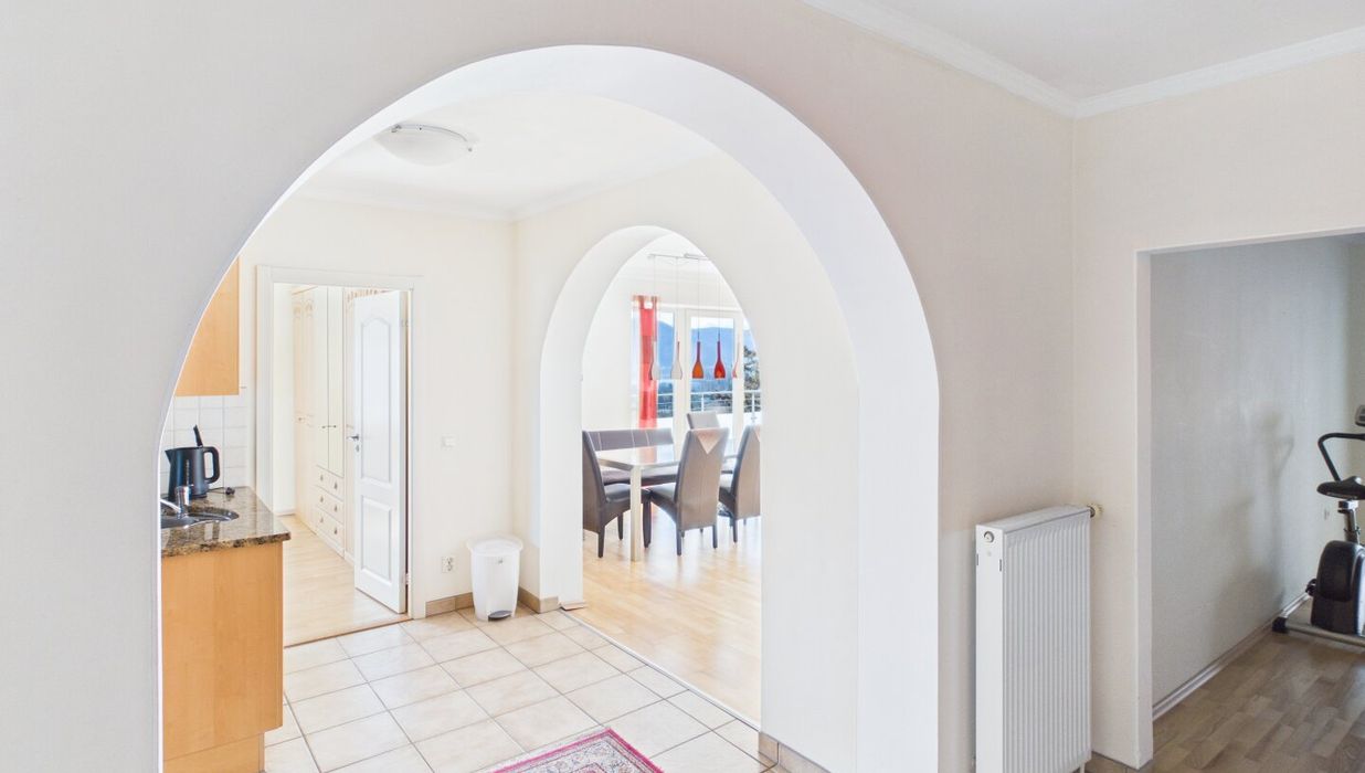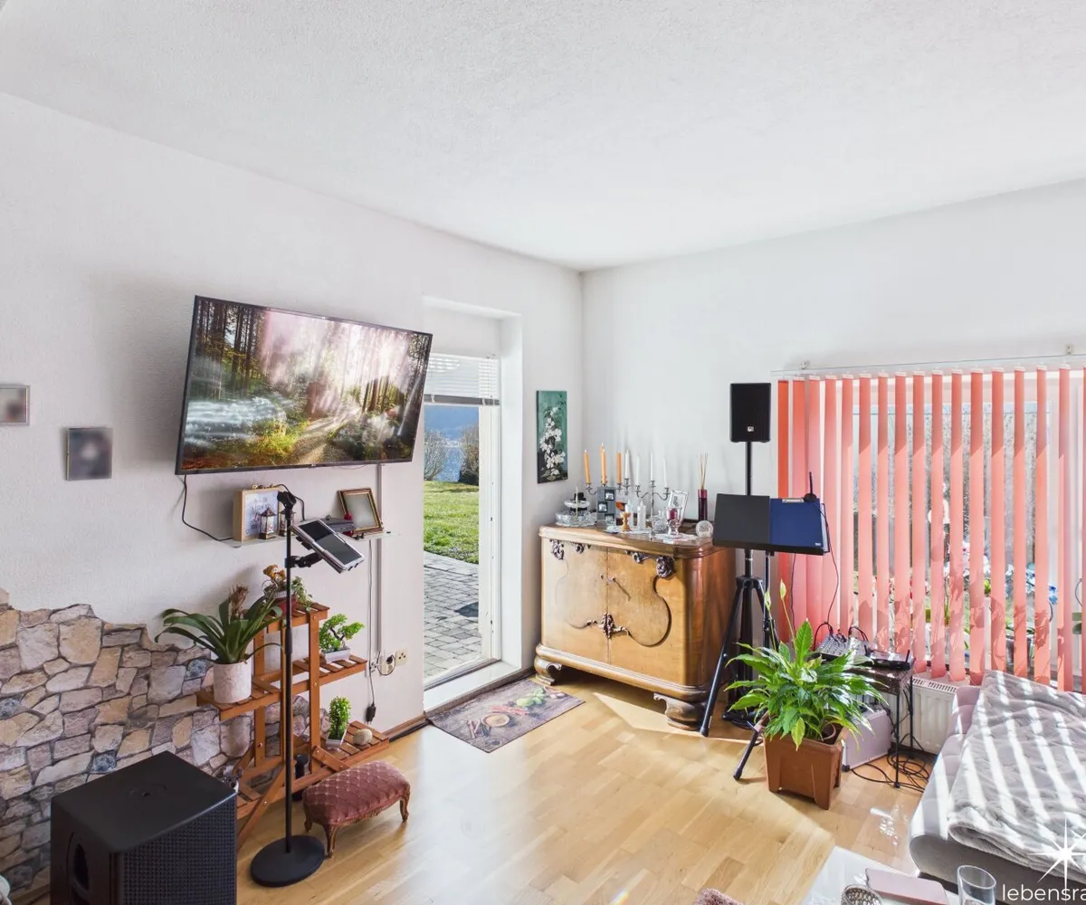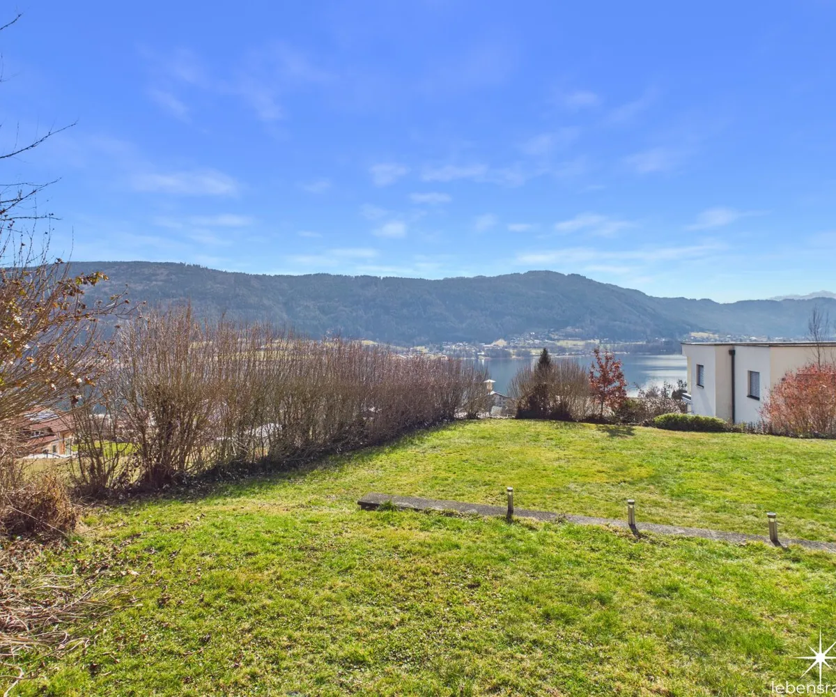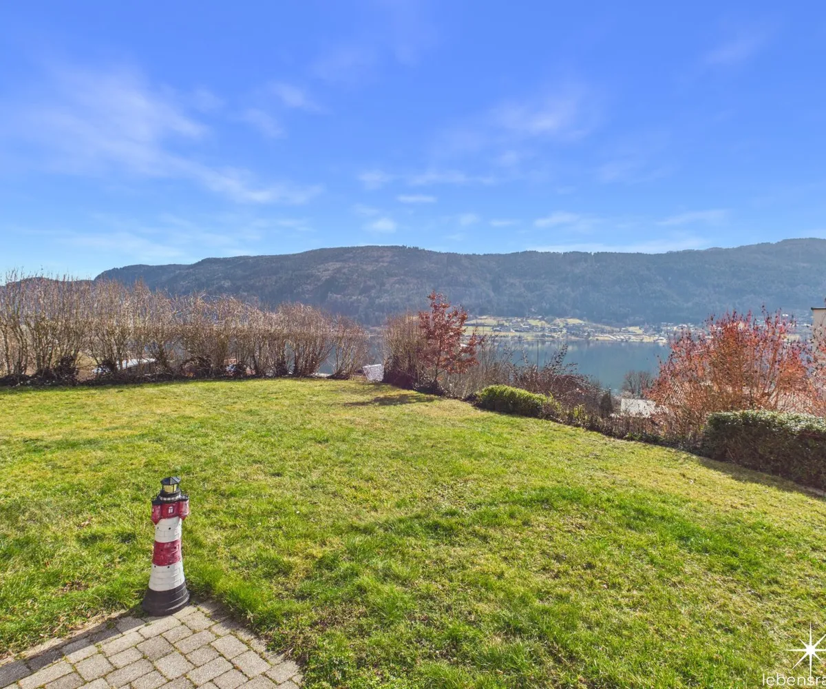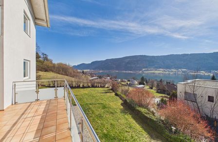 Attraktive, abgeschlossene Hauptwohnung mit sehr großzügigem Wohnzimmer mit einem gemauerten Ofen und teilintegrierter Küche sowie Zugang auf die Terrasse. Der direkte Blick auf den Ossiachersee und die umliegende Bergwelt des Dreiländerecks Österreich, Italien und Slowenien. 3 Schlafzimmer, der Sanitärbereich und ein attraktiver Wintergarten mit schönem Seeblick sind ebenfalls Bestandteil des Geschoßes. Der südwestliche Teil des Gartens inklusive dem Swimmingpool mit Entsalzungsanlage ist über die Terrasse direkt begehbar.