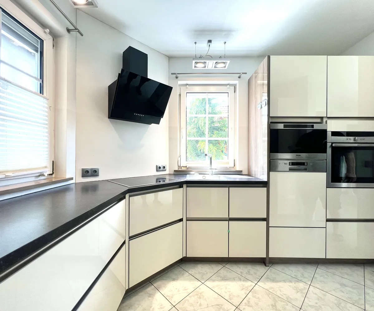 Für zusätzlichen Wohnkomfort sorgt eine Fußbodenheizung im Erdgeschoss . Die maßgefertigte Einbauküche vom Tischler überzeugt mit hochwertigen Markengeräten und einem modernen amerikanischen Kühlschrank .