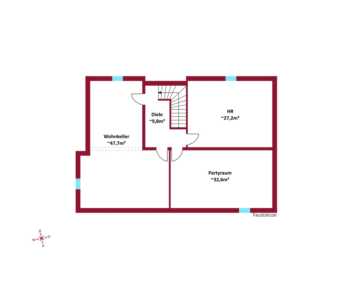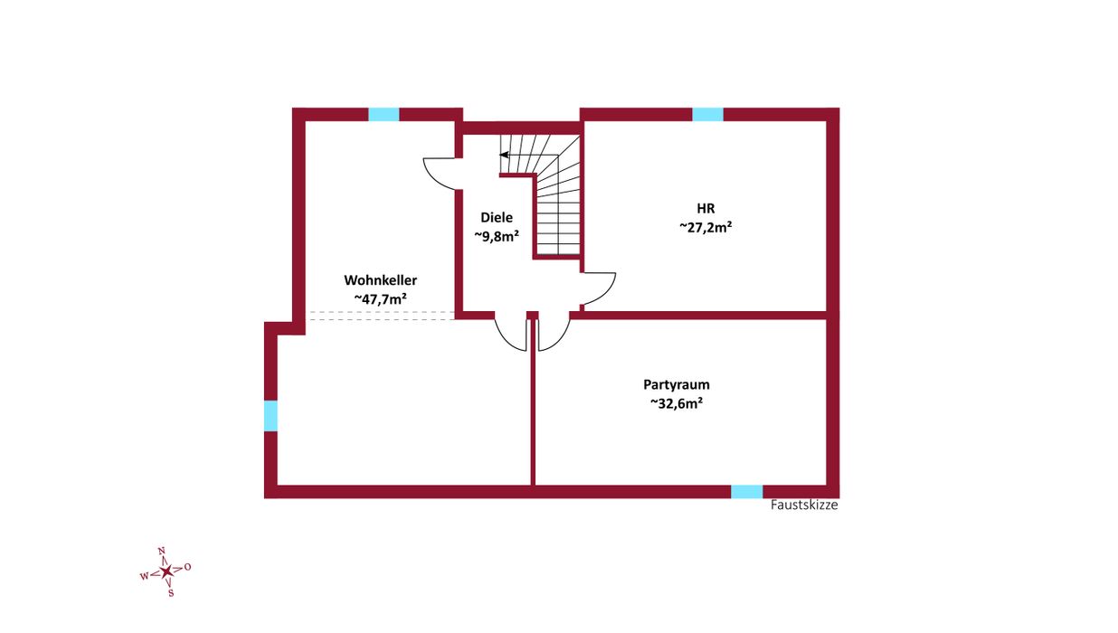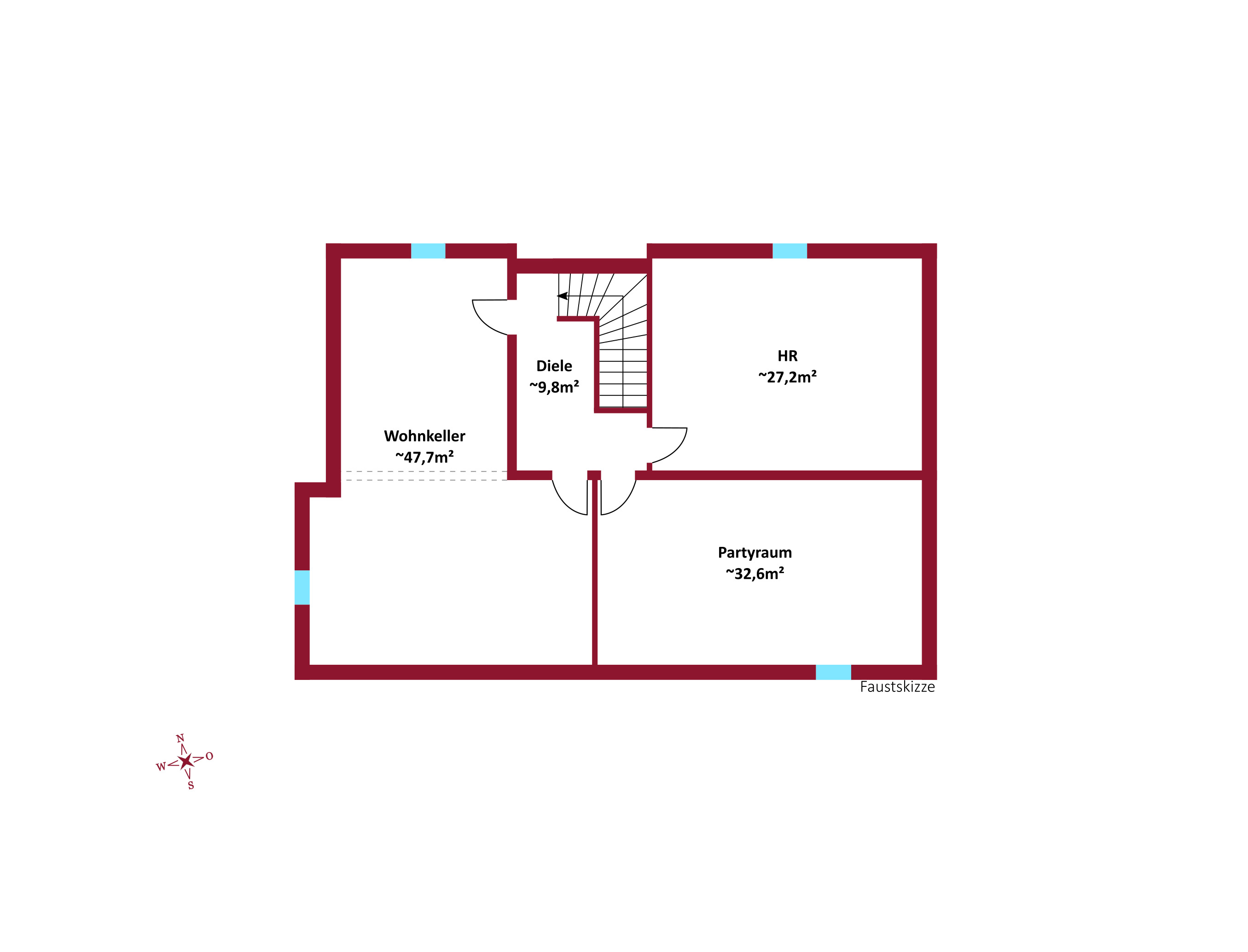 Im Kellergeschoss stehen Ihnen zurzeit 3 separate Räume zur Verfügung, die durch eine angepasste Raumtrennung individuell gestaltet werden können.