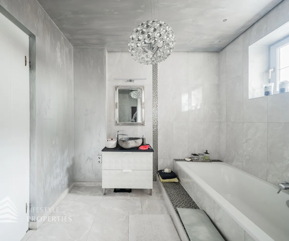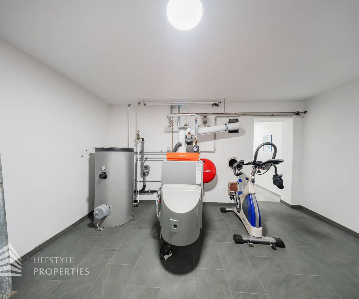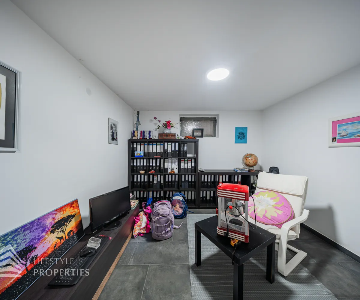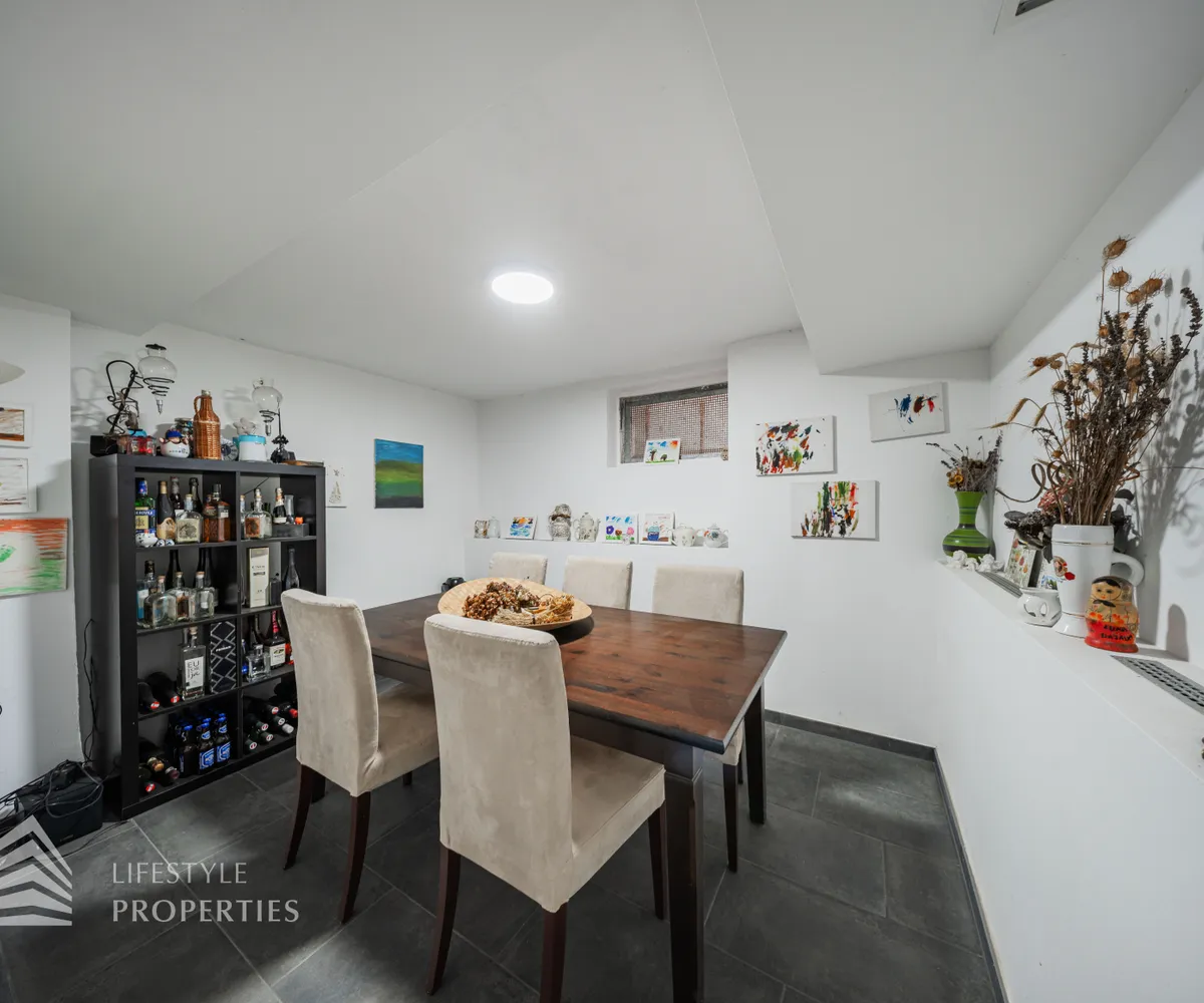 Die Villa erstreckt sich über drei Etagen. Im Kellergeschoss befinden sich ein stilvoll gestalteter Whiskey- und Zigarrenraum, ein Büro, ein Waschraum mit Dusche und WC, ein Abstellraum sowie eine kleine Werkstatt. Eine elegante Holztreppe führt in das Erdgeschoss, das zwei Schlafzimmer, eine moderne und im Kaufpreis inbegriffene Küche, ein separates Esszimmer sowie ein großzügiges Wohnzimmer mit rund 35 m² umfasst. Vom Wohnzimmer aus gelangt man direkt auf eine rund 23 m² große Terrasse, die zum Verweilen einlädt. Ein Windfang sowie eine praktische Speisekammer runden das Erdgeschoss ab. Im Obergeschoss befinden sich drei weitere Schlafzimmer, eine offene Galerie sowie ein helles Badezimmer mit WC.