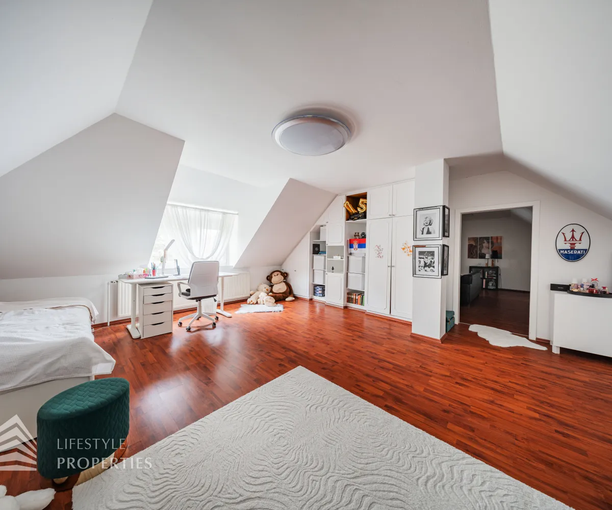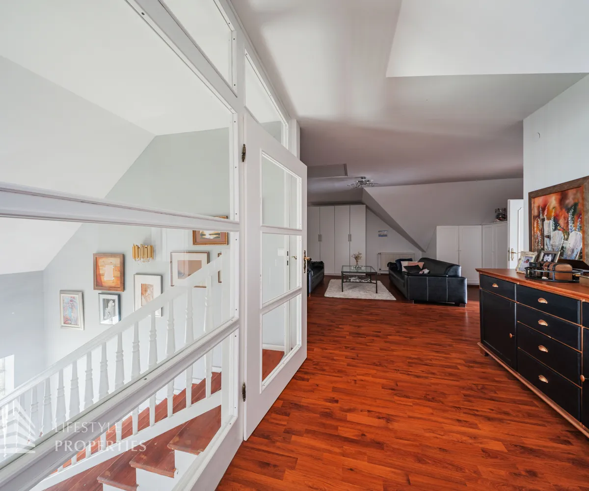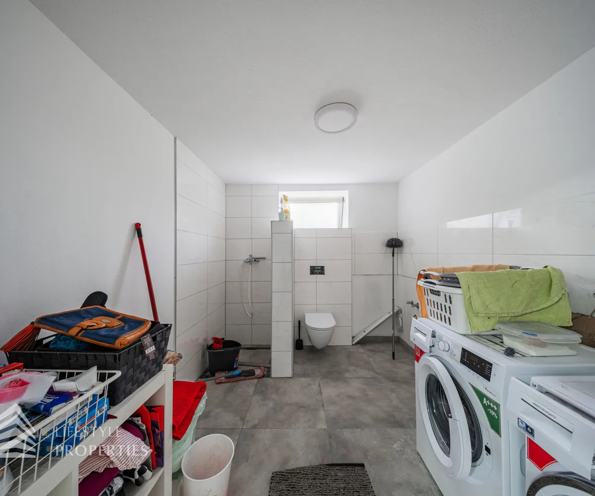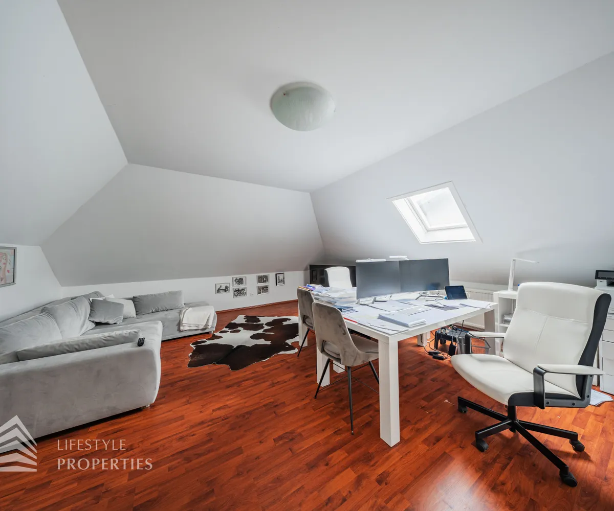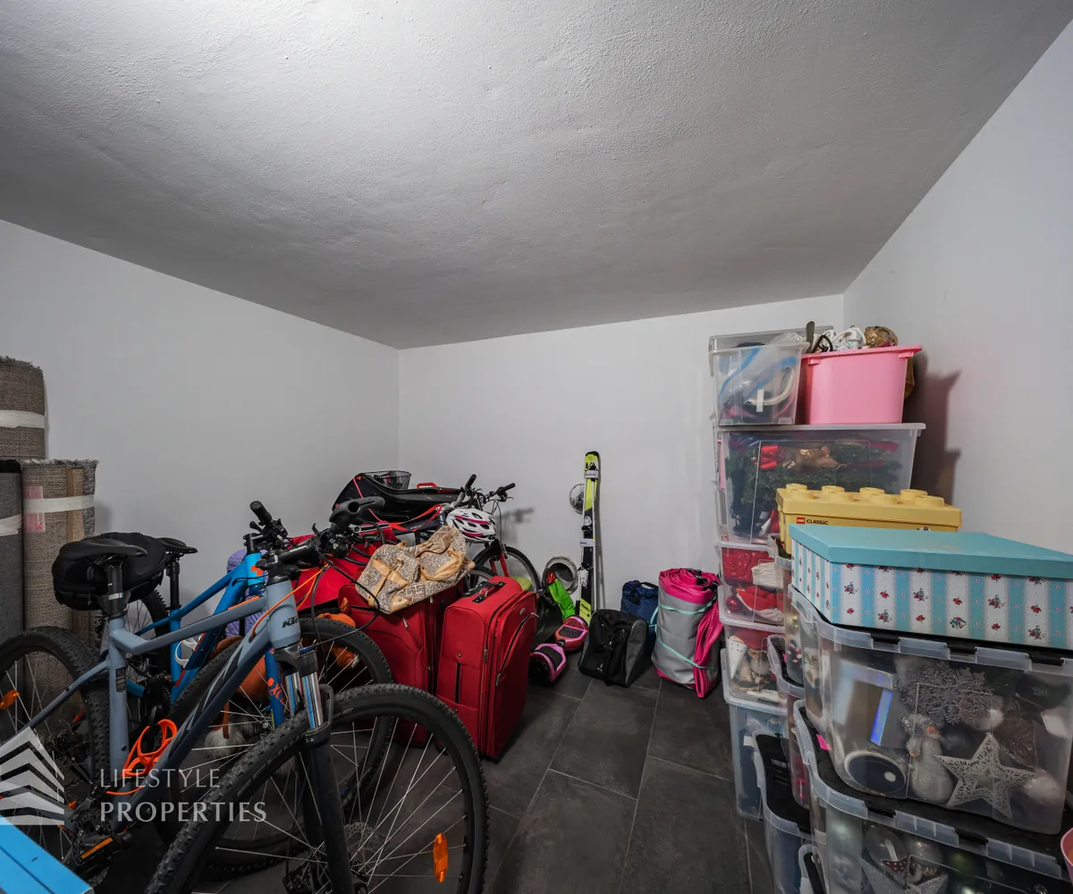 Die Villa erstreckt sich über drei Etagen. Im Kellergeschoss befinden sich ein stilvoll gestalteter Whiskey- und Zigarrenraum, ein Büro, ein Waschraum mit Dusche und WC, ein Abstellraum sowie eine kleine Werkstatt. Eine elegante Holztreppe führt in das Erdgeschoss, das zwei Schlafzimmer, eine moderne und im Kaufpreis inbegriffene Küche, ein separates Esszimmer sowie ein großzügiges Wohnzimmer mit rund 35 m² umfasst. Vom Wohnzimmer aus gelangt man direkt auf eine rund 23 m² große Terrasse, die zum Verweilen einlädt. Ein Windfang sowie eine praktische Speisekammer runden das Erdgeschoss ab. Im Obergeschoss befinden sich drei weitere Schlafzimmer, eine offene Galerie sowie ein helles Badezimmer mit WC.
