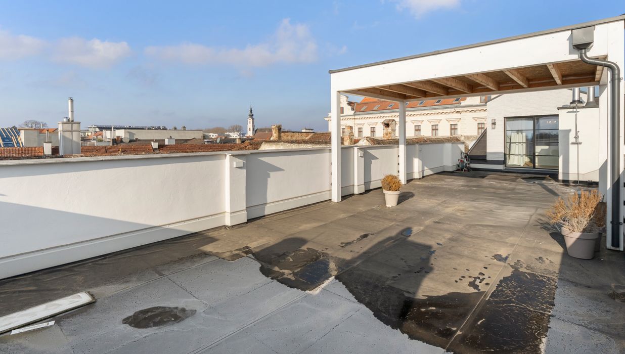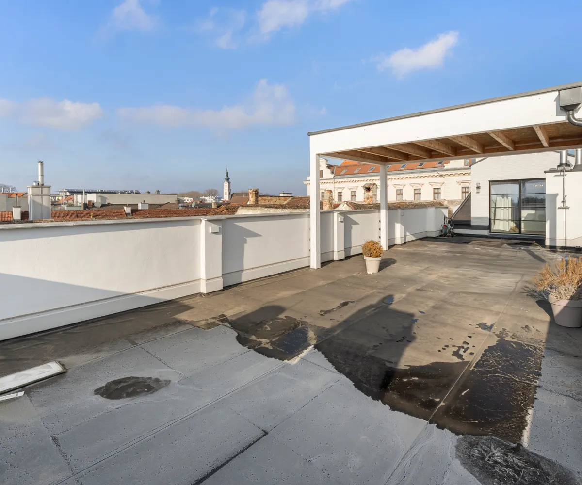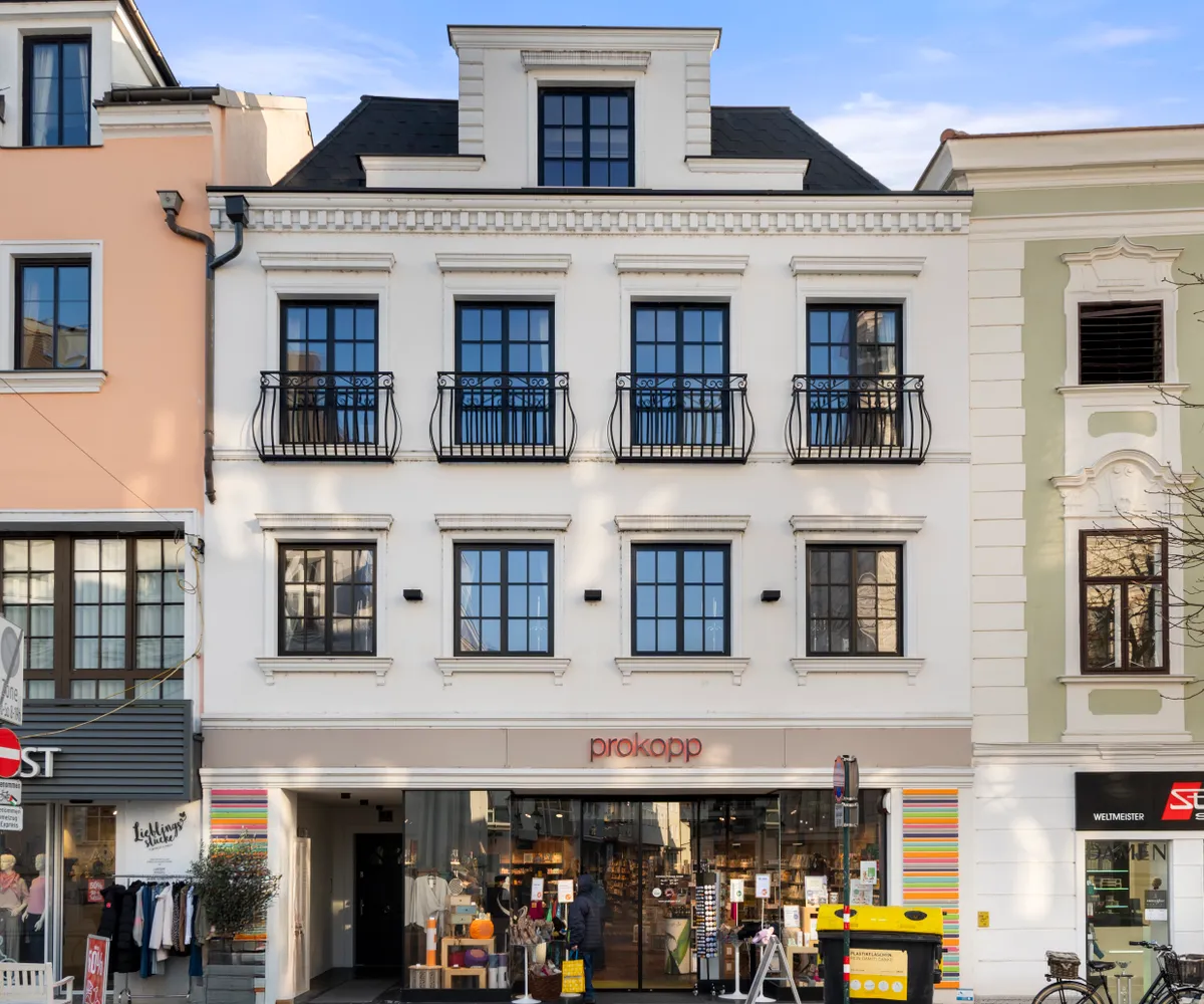 Ein besonderes Merkmal der Liegenschaft sind die außergewöhnlichen Freiflächen in zentraler Innenstadtlage. Die großzügige Dachterrasse mit rund 91 m² bietet einen freien Panoramablick über den Hauptplatz bis in Richtung Donau. Ergänzt wird das Angebot durch einen privaten Innenhof im 1. Obergeschoss sowie eine weitere Terrasse im 2. Obergeschoss, die geschützte Rückzugsorte zu unterschiedlichen Tageszeiten ermöglichen.