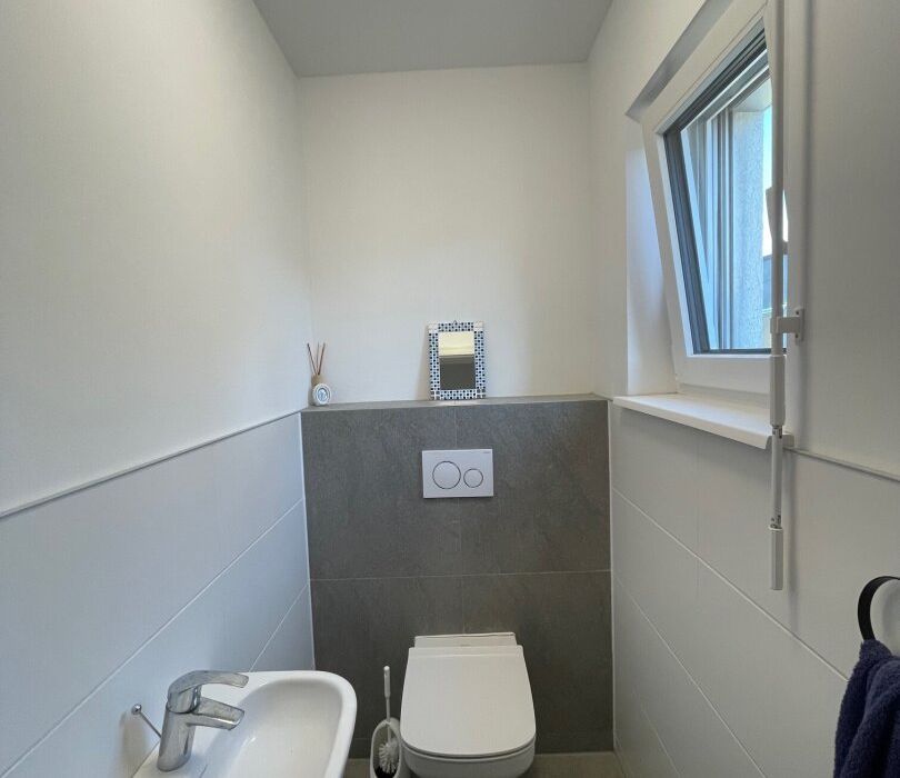 Die Außenanlage ist zum Teil noch nicht ganz fertig. Es fehlt die Einfahrt, der Vorplatz und ein überdachter Abstellplatz.
