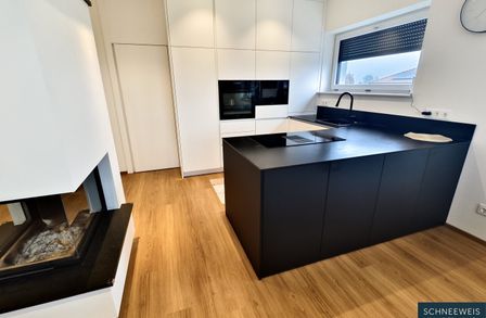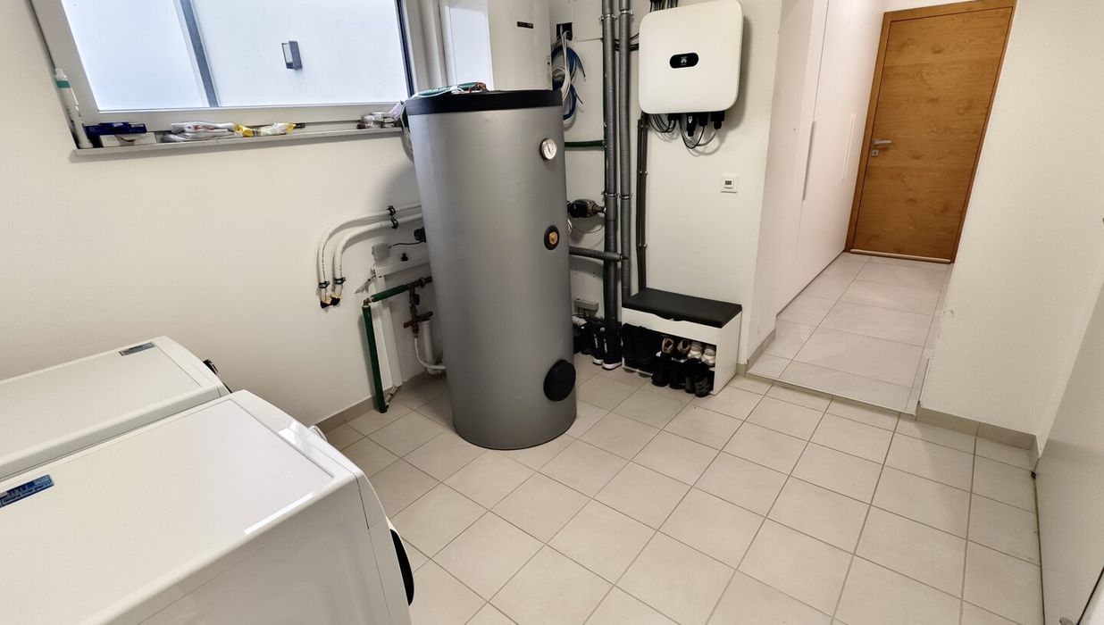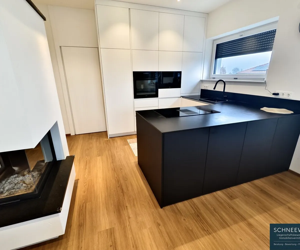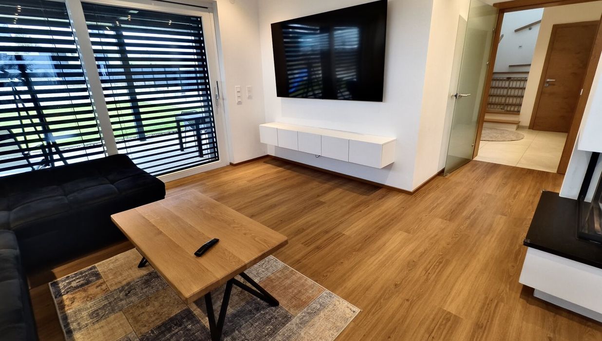 Das Wohnzimmer mit behaglichem Kaminofen befindet sich unmittelbar angrenzend an den Wohn-Essbereich sowie an die neuwertige Einbauküche mit AEG-Markengeräten. Beheizt wird das Haus mittels Luftwärmepumpe. Elegante Vinylböden und Fliesen sorgen für eine stimmige Raumoptik und vermitteln insgesamt ein hochwertiges Wohnambiente. Im Obergeschoss befinden sich zwei Kinderzimmer sowie ein großzügiges Schlafzimmer mit Ausgang auf den Balkon und angrenzendem Schrankraum. Ein Badezimmer mit Dusche sowie eine separate Toilette ergänzen diese Wohnebene.