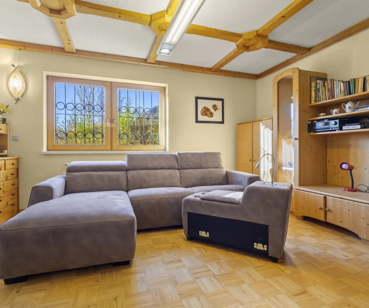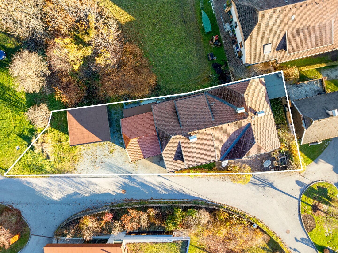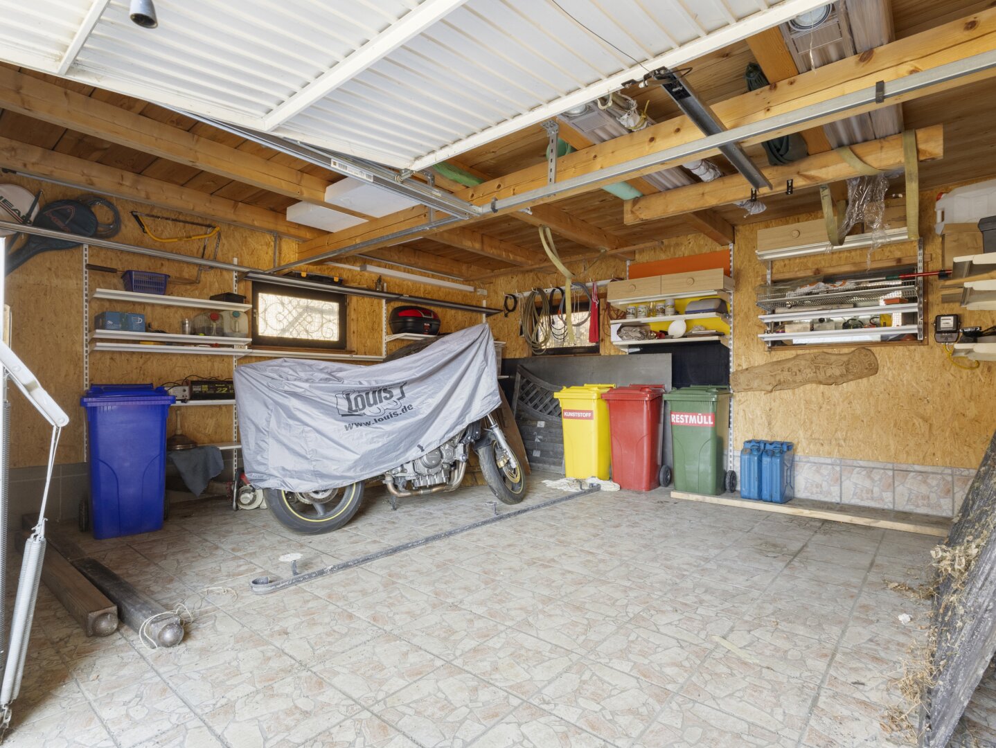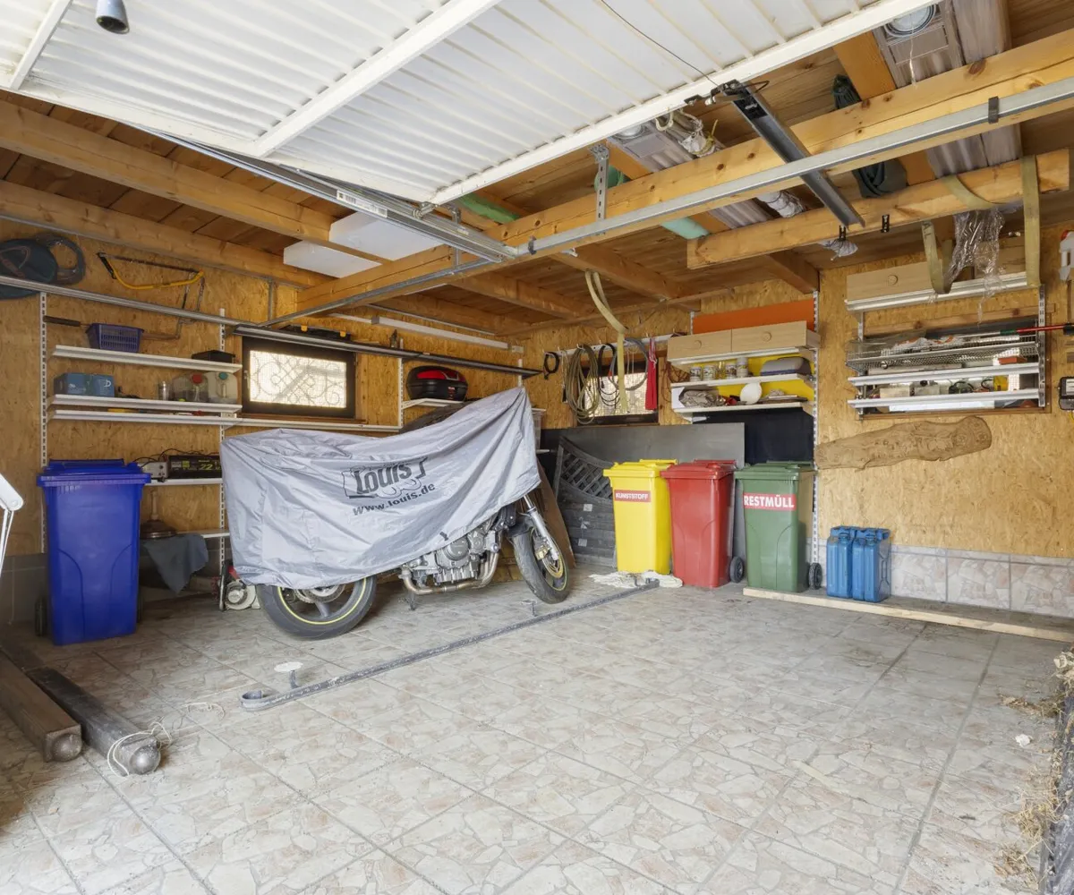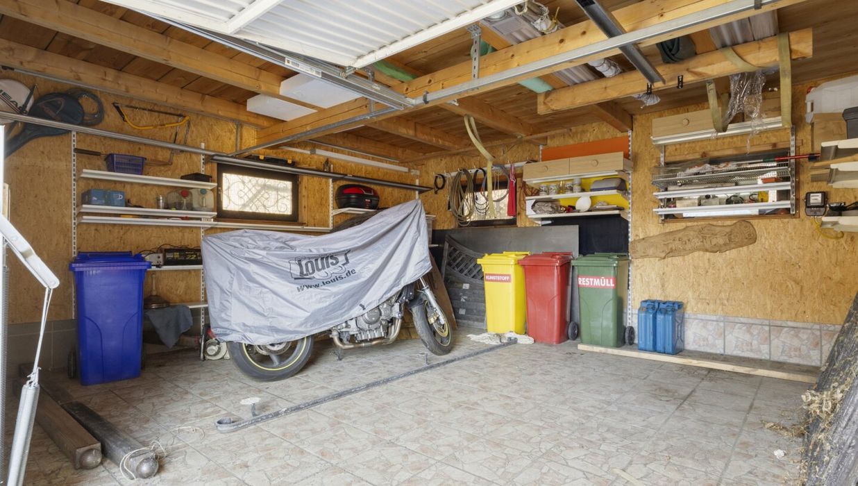 Direkt an den nördlichen Teil des Hauses am Neubestand schließt eine Doppelgarage (ca. 31,93m²) mit einem kleinen Dachboden an, dessen Dach im Jahr 2018 neu eingedeckt wurde. Durch regelmäßige Instandhaltungen befinden sich die Wohnhäuser in einem guten und soliden Zustand. Vor dem Haus befindet sich eine Terrasse mit einem kleinen Garten zum Entspannen.