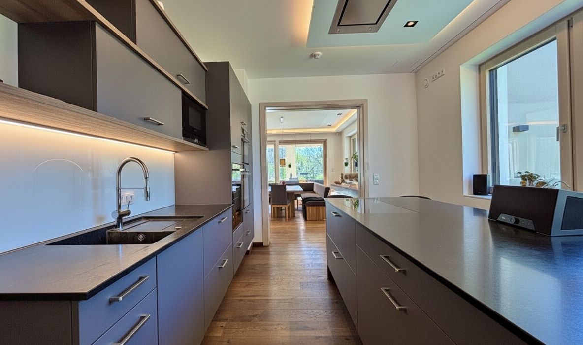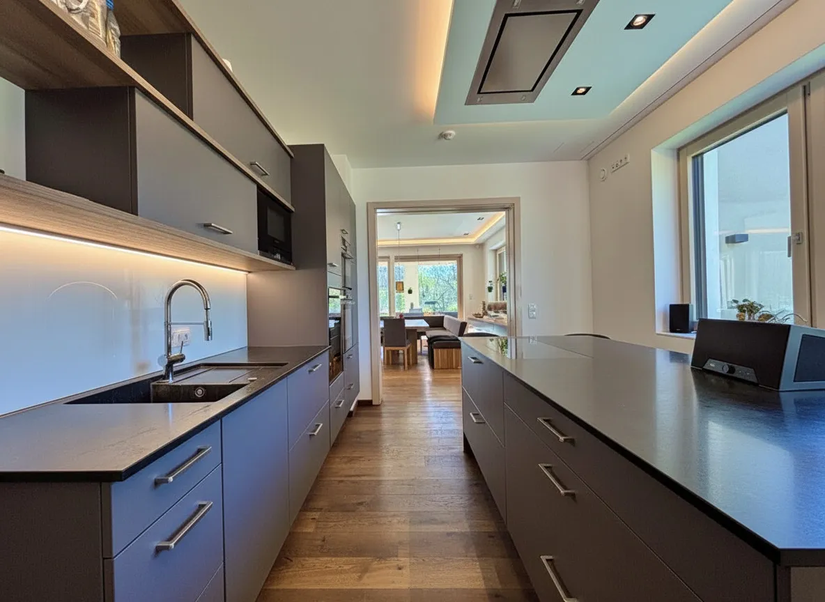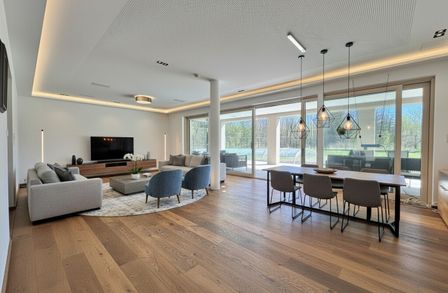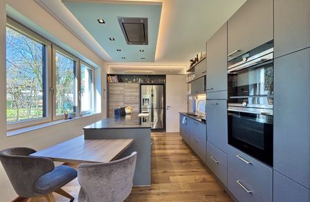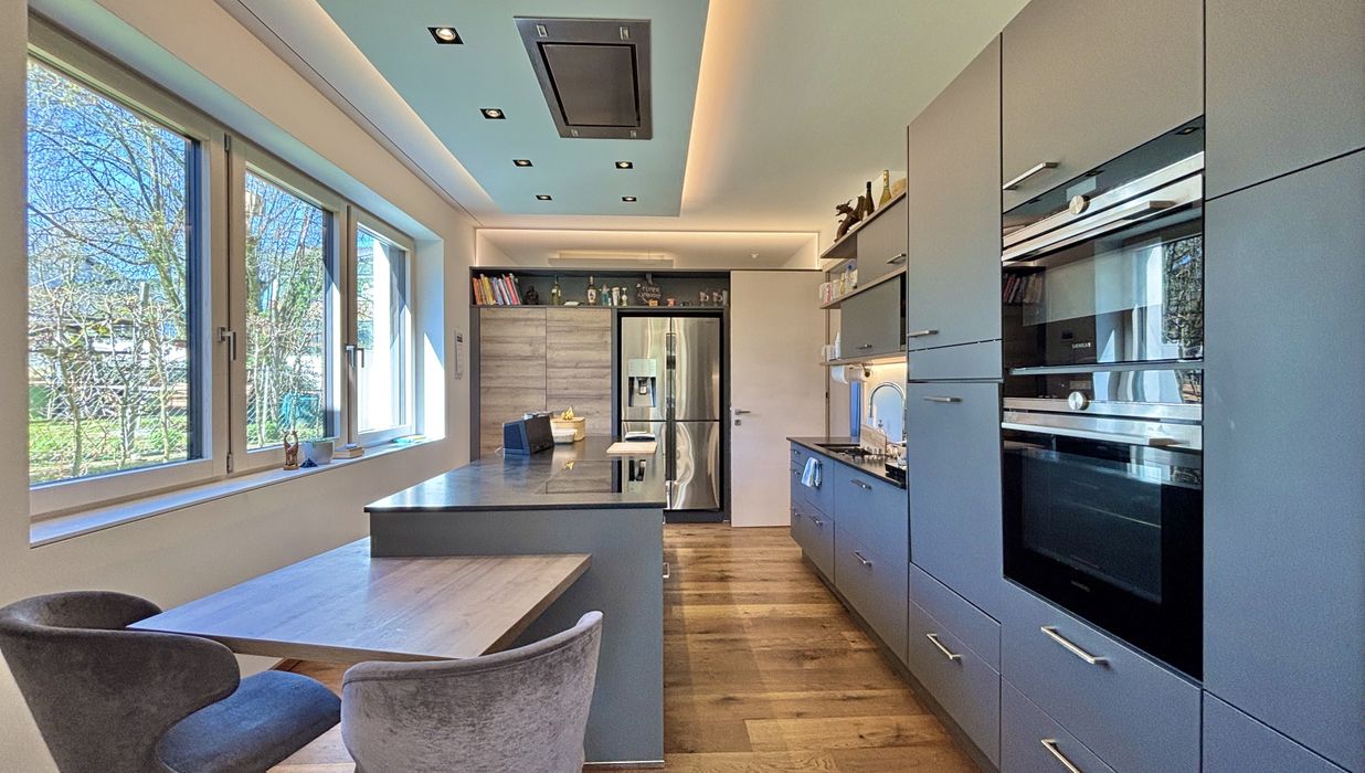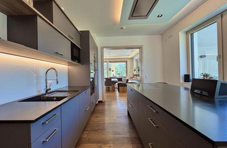 Herzstück dieser Ebene ist der weitläufige Wohn- und Essbereich mit offenem Raumkonzept , der durch seine Helligkeit und Großzügigkeit beeindruckt. Die hochwertige Küche mit angrenzender Speis erfüllt höchste Ansprüche an Design und Funktionalität. Ein zusätzliches Zimmer bietet sich ideal auch als Homeoffice an.