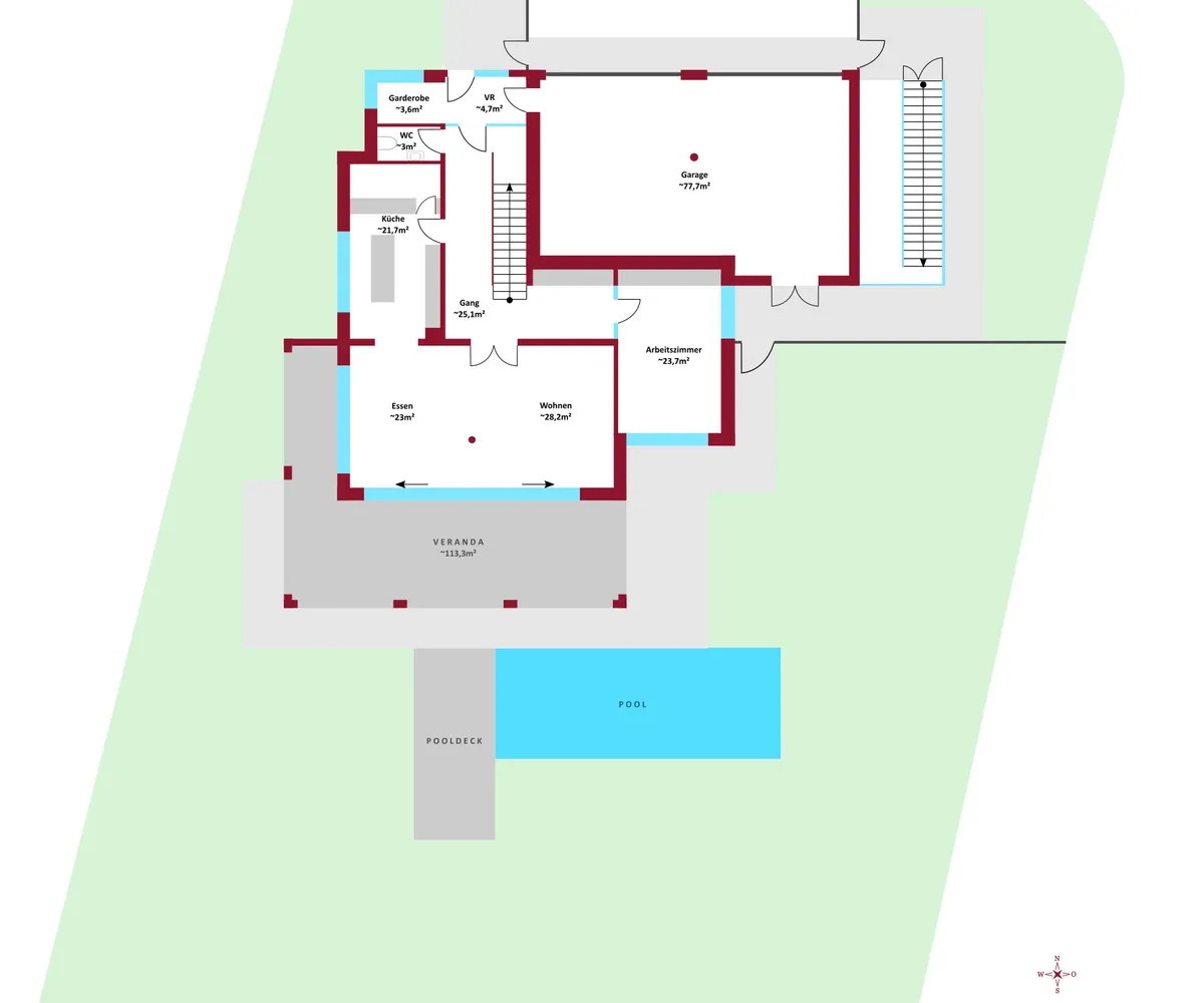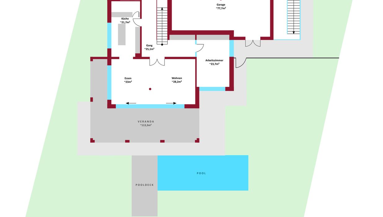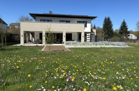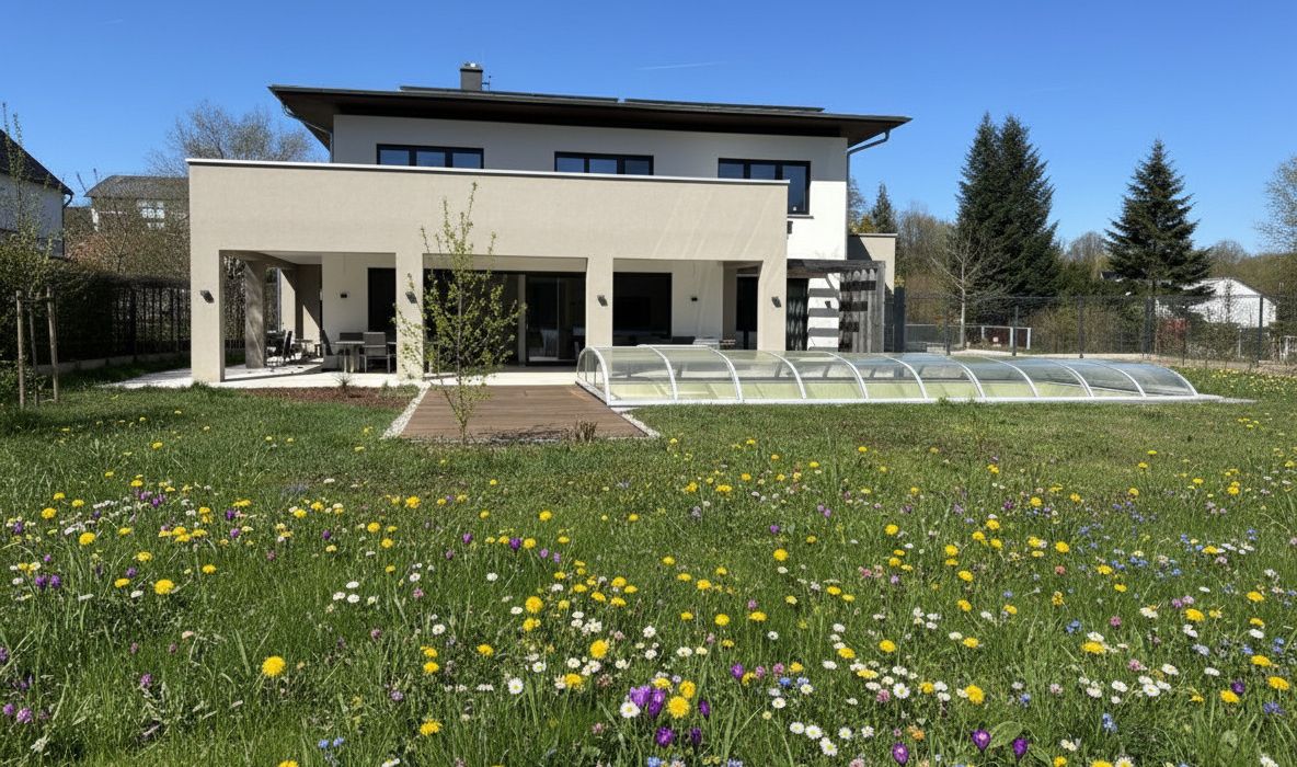 Auf diesem großzügigen Grundstück von rund 919 m² (Bauland), ergänzt durch beeindruckende 6.252 m² idyllisches Grünland , entfaltet sich ein privates Paradies, das Raum zum Durchatmen, Träumen und Gestalten bietet. Diese außergewöhnliche Villa lässt keine Wünsche offen - vom freundlichen Wohnbereich in Südwestlage mit der Möglichkeit einer Wohnraumerweiterung (z. B. durch einen Wintergarten) bis zu einem besonderen Außenbereich mit Pool - für entspannte Sonnenstunden, lange Sommerabende mit Freunden oder einfach beim Kaffee mit Blick ins Grüne.