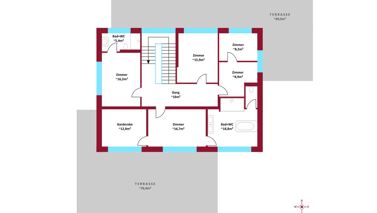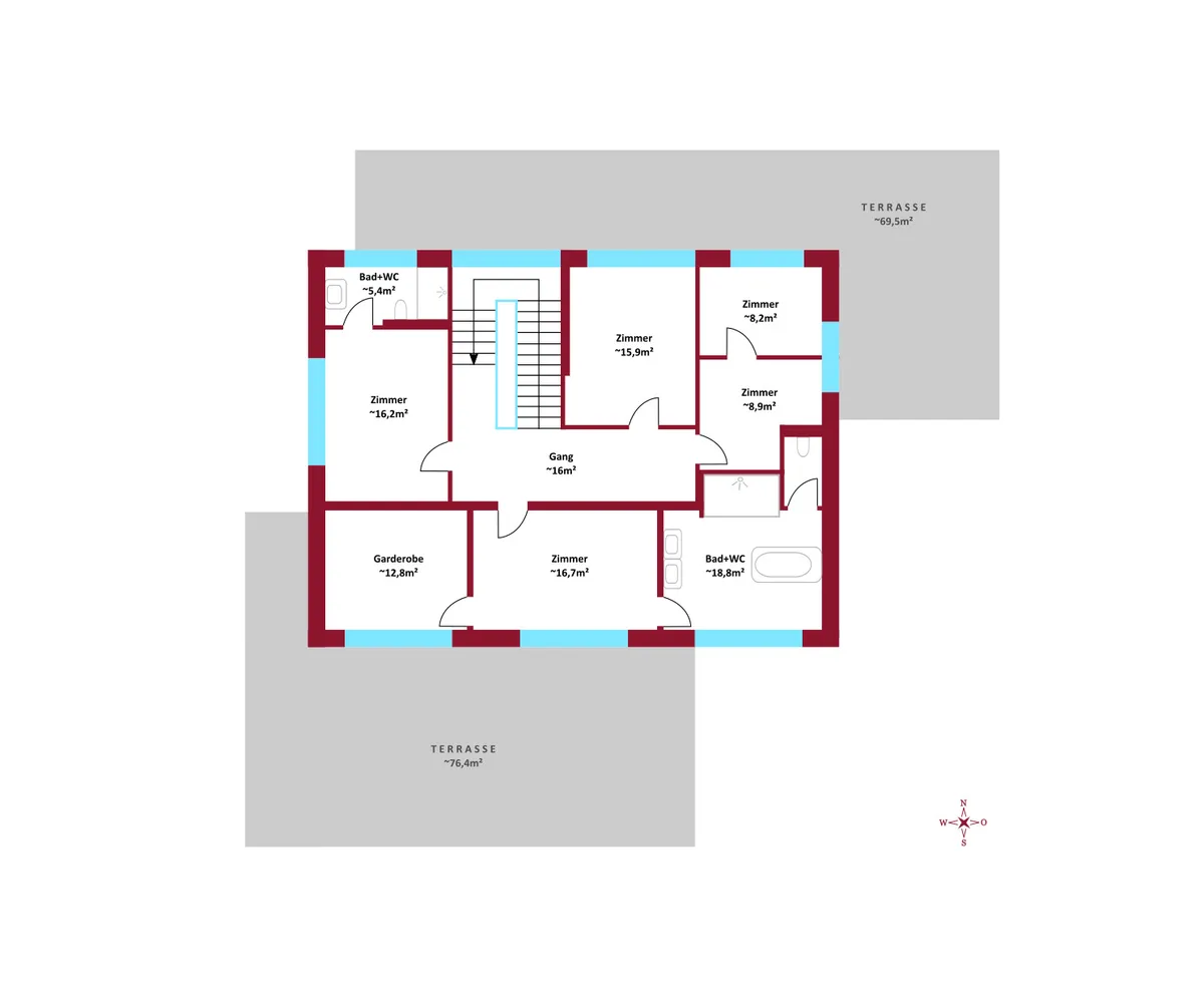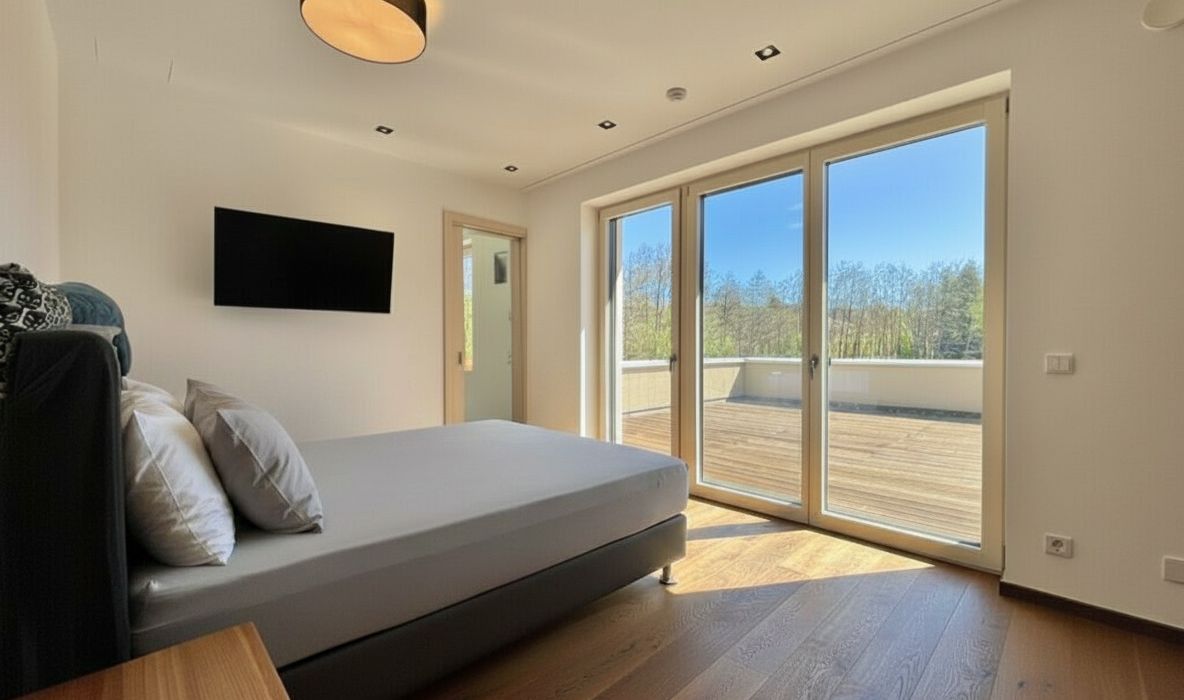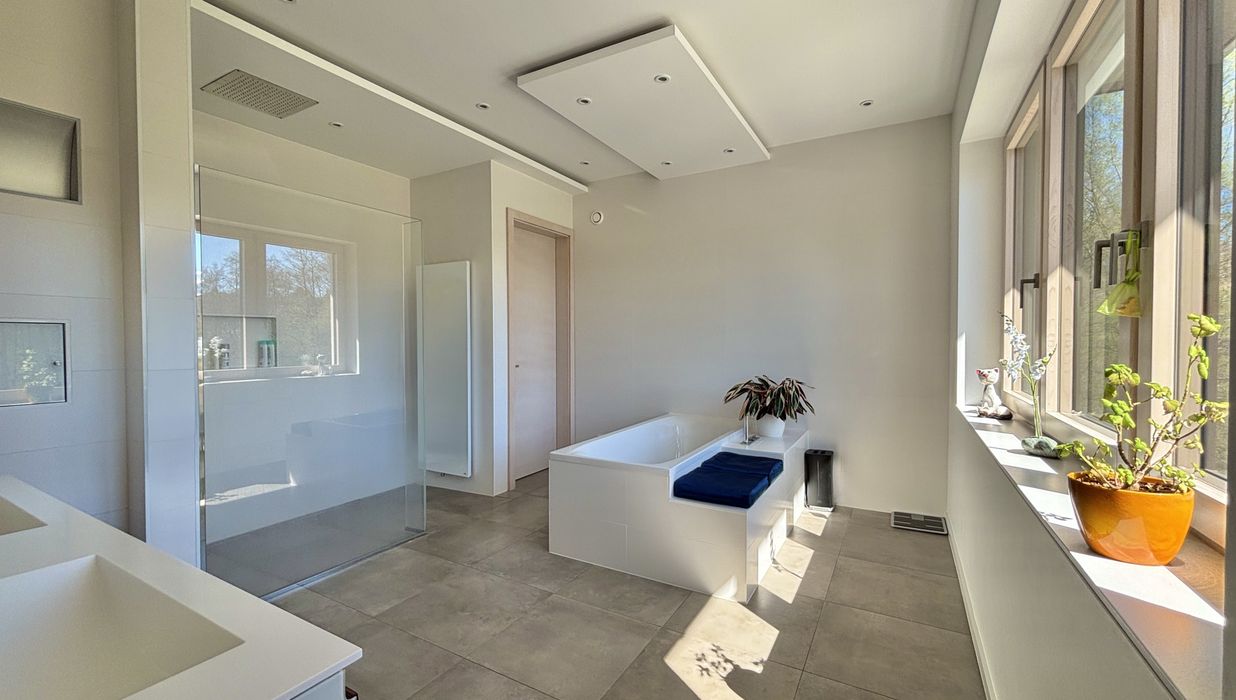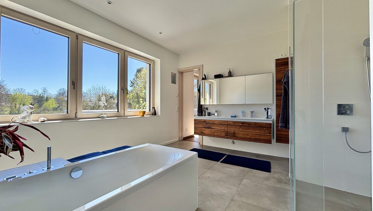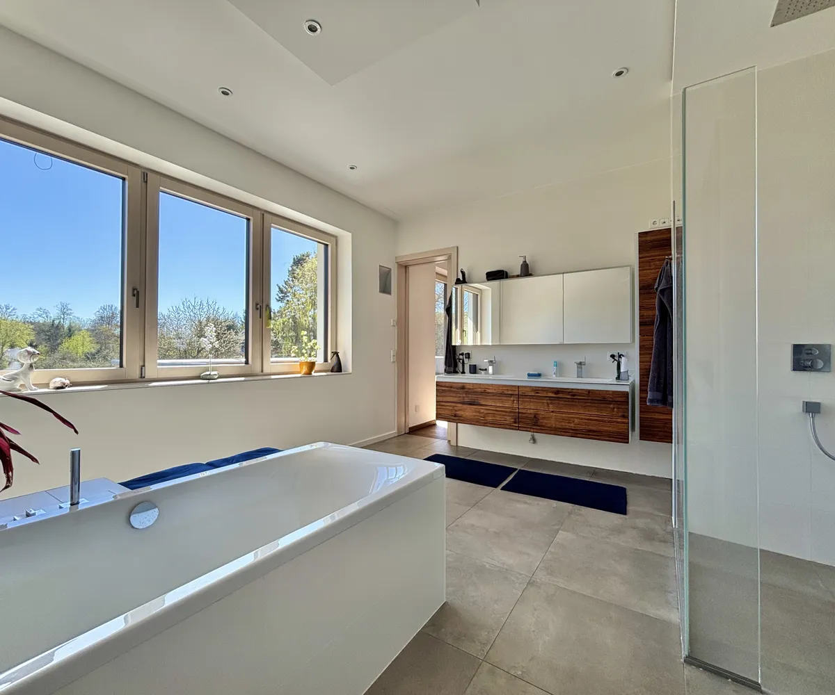 Obergeschoss (ca. 119 m²) – Rückzugsort mit Komfort und Privatsphäre : Im Obergeschoss erwartet der großzügige Masterbedroom mit direkten Zugang zum Ankleidezimmer und zu einer Terrasse mit vorbereitetem Whirlpool-Anschluss – perfekt für entspannte Stunden mit Ausblick. Das zweite Schlafzimmer eignet sich ideal als Gäste- oder Kinderzimmer. Beide Schlafzimmer sind klimatisiert und sorgen ganzjährig für ein angenehmes Raumklima. Es bestehen zusätzlich noch zwei kleinere Zimmer, diese könnten baulich auch zu einem größeren Zimmer zusammengelegt werden. Zwei stilvolle Badezimmer bieten höchsten Komfort: ein großzügiges Masterbad mit freistehender Badewanne, Dusche und separatem WC sowie ein Gästebadezimmer mit Dusche und WC. Ergänzt wird diese Ebene durch einen Hauswirtschaftsraum mit Waschmaschinenanschluss.