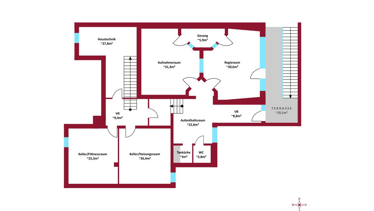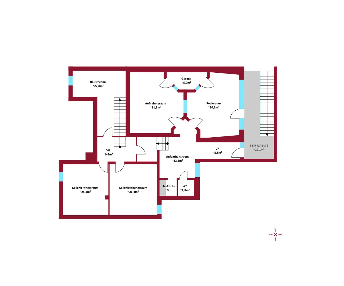 Ein weiteres absolutes Highlight ist das professionell ausgestattete Tonstudio mit separatem Eingang (ca. 105 m²) . Dieses umfasst den Regieraum, den Aufnahmebereich, den Gesangsraum, sowie eine kleine Küche und Sanitäranlagen. Durch den repräsentativen Eingang eignet sich das Studio nicht nur für private kreative Projekte, sondern auch hervorragend zur externen Vermietung oder gewerblichen Nutzung. Optional könnte man auch ein HOME-CINEMA einrichten.