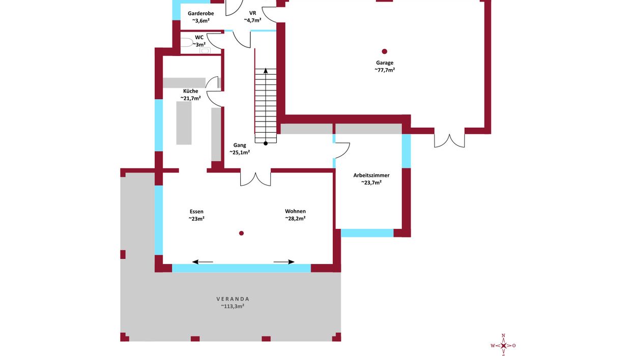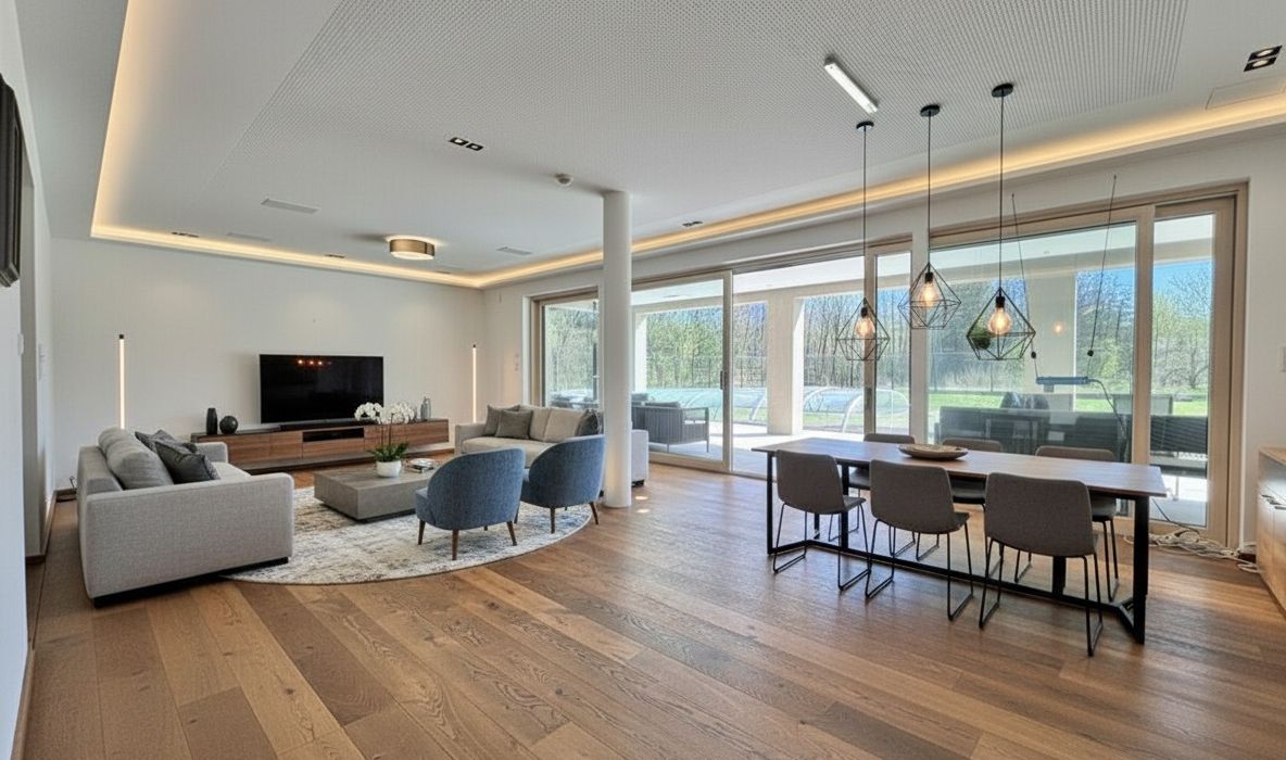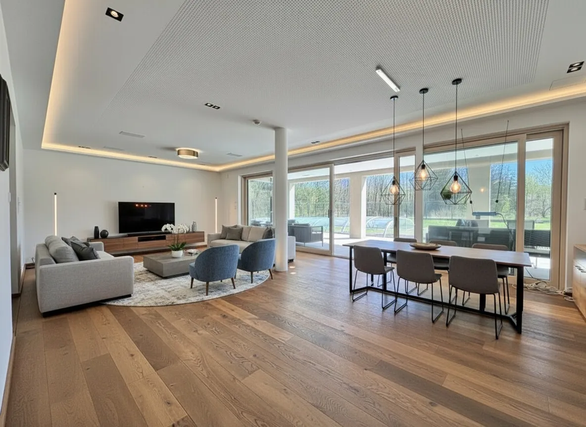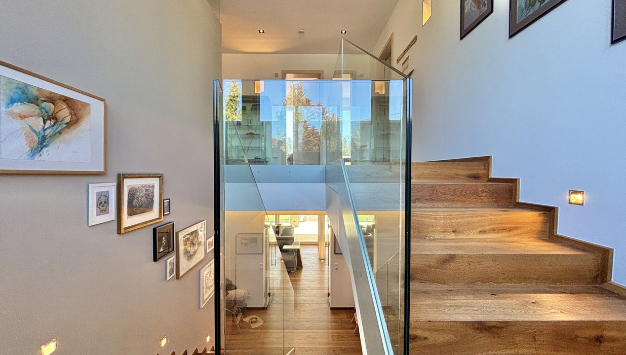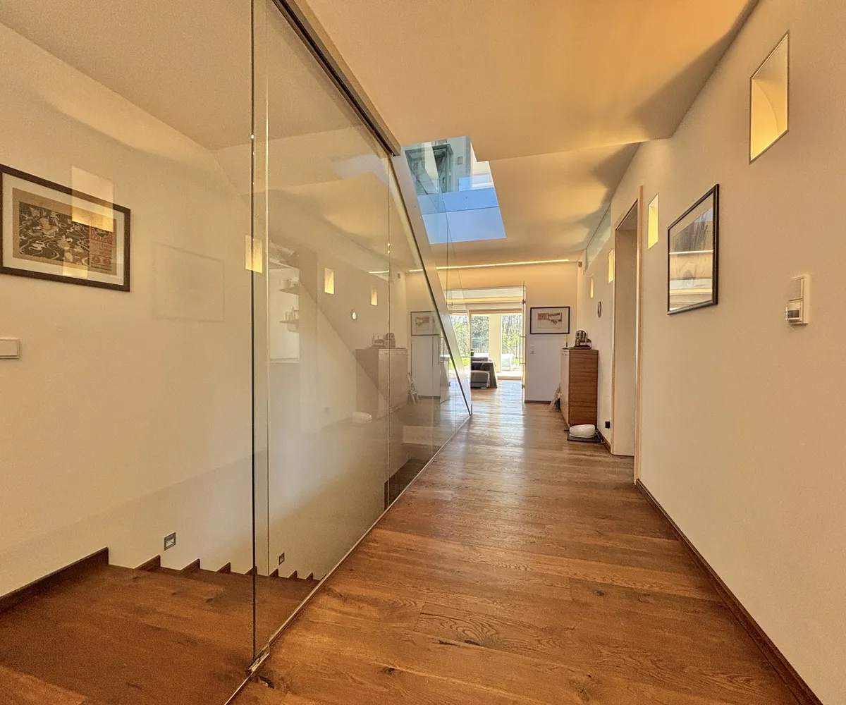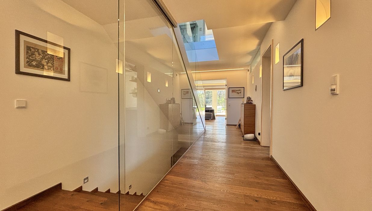 Hauptgeschoss (ca. 133 m²) – Wohnen, Leben & Genießen auf höchstem Niveau : Die Wohnebene empfängt Sie mit einem großzügigen hohen Eingangsbereich, der durch elegante Glaselemente und hochwertige Materialien sofort ein Gefühl von Exklusivität vermittelt. Edler Eichenboden (Country Vulcano der Fa. Mafi), hohe Räume, verdeckte Türenbelege sowie außenliegende Beschattung unterstreichen den modernen Wohnkomfort.