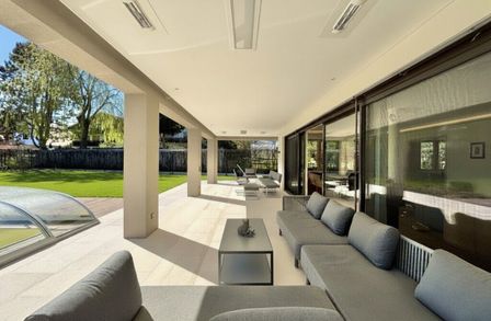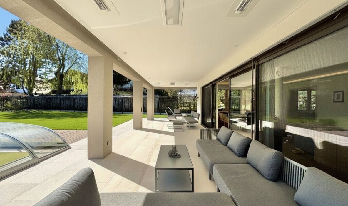 Der Außenbereich verwandelt sich in eine private Wohlfühloase: Ein großzügiger Pool (ca. 10 x 4 m) mit Wärmepumpe , Außendusche, stilvolle Loungebereiche laden zum Entspannen ein. In den Decken integrierte Heizstrahler ermöglichen auch an kühleren Tagen angenehme Stunden im Freien. Der Garten mit Altbaumbestand (Obstbäumen wie Walnuss-, Himbeer- und Kornelkirschenpflanzen etc. ) schafft eine natürliche Atmosphäre und bietet Raum für Erholung und Genuss.