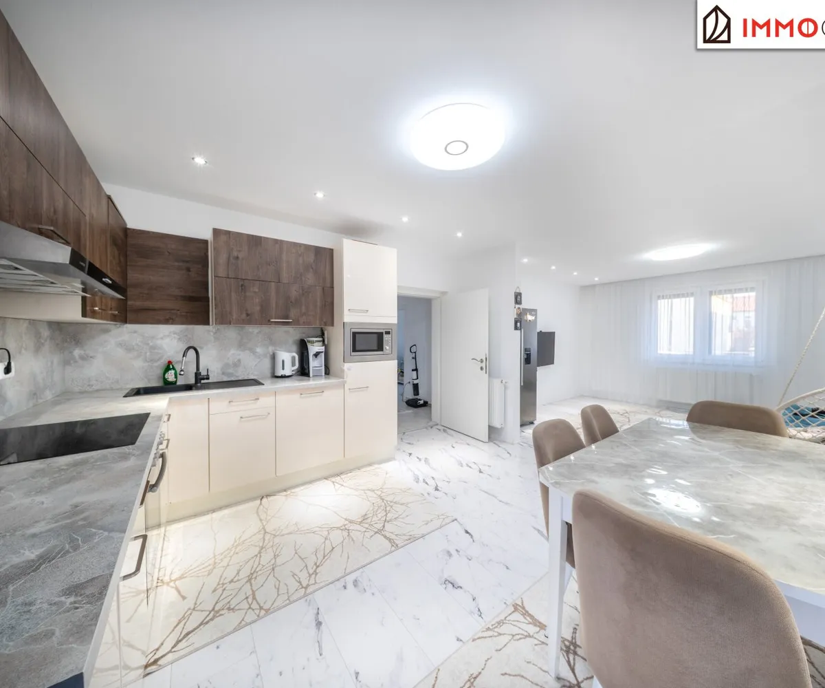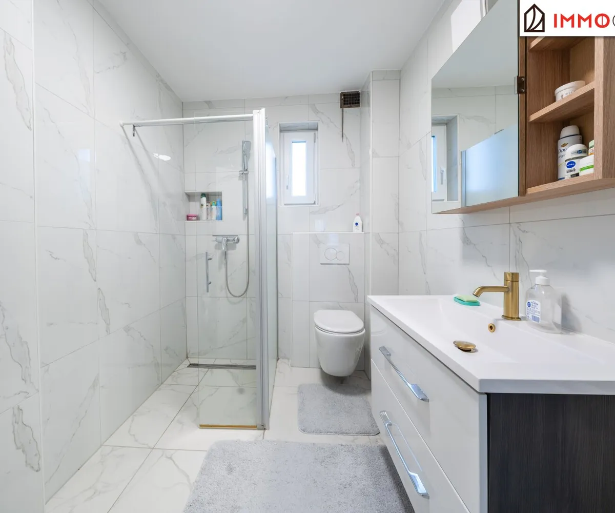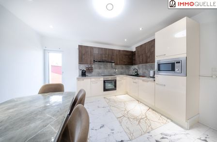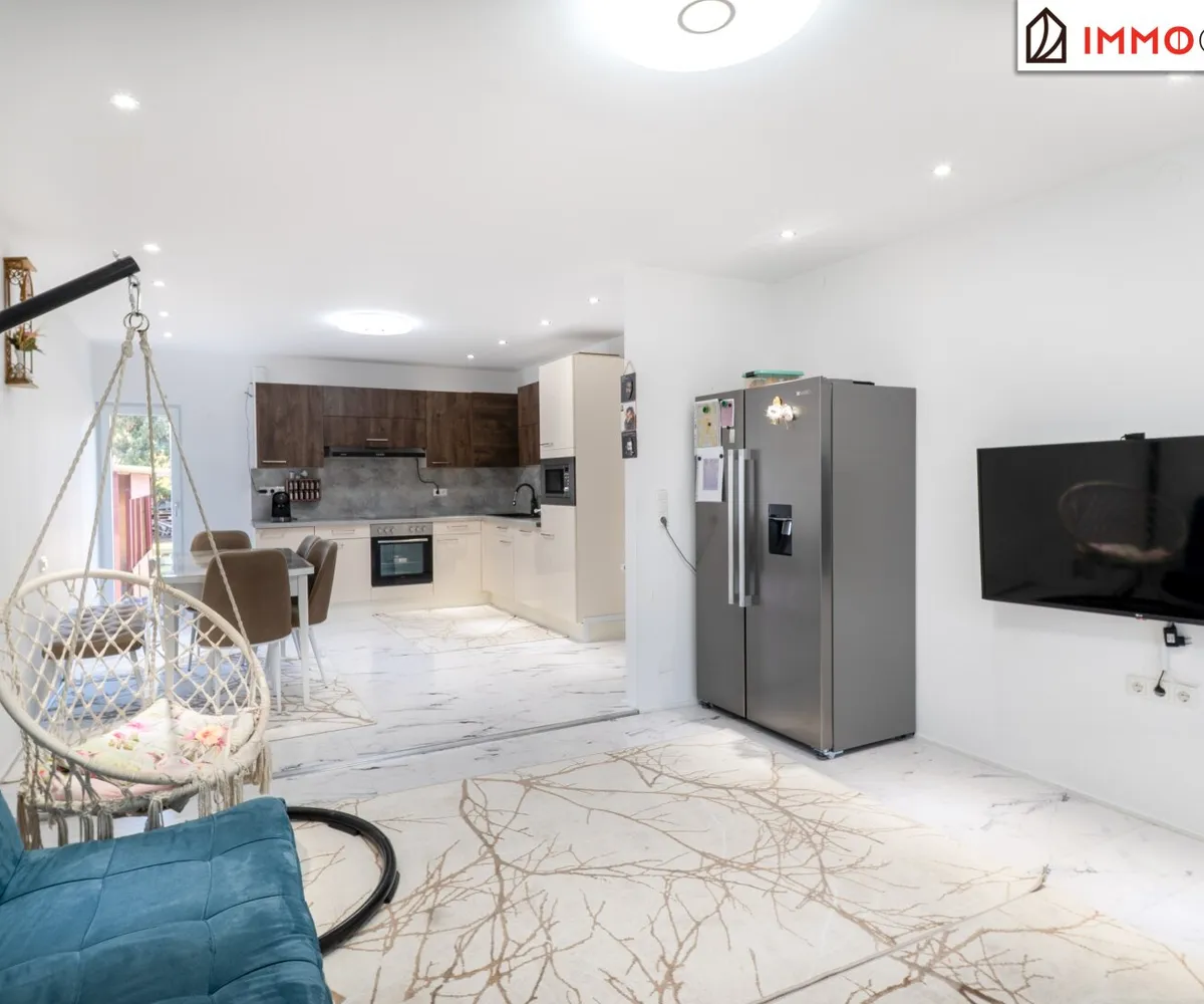 Rechts neben der Treppe eröffnet sich das Badezimmer mit Dusche, WC und Fenster - angenehm dimensioniert und lichtdurchflutet. Geradeaus gelangen Sie in das Herzstück des Hauses: die große Küche mit integriertem Essbereich. Hier trifft Funktionalität auf Geselligkeit. Die Einbauküche bietet ausreichend Platz zum Kochen, während der direkte Ausgang in den Garten eine wunderbare Verbindung zwischen Innen- und Außenraum schafft.