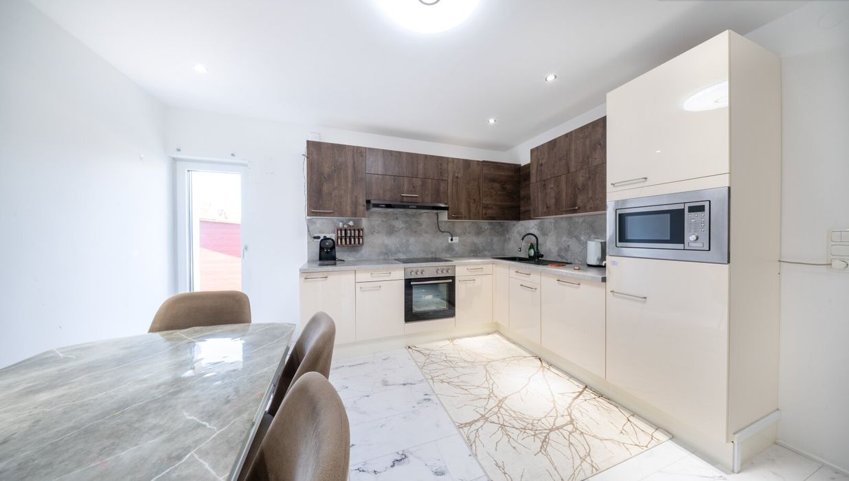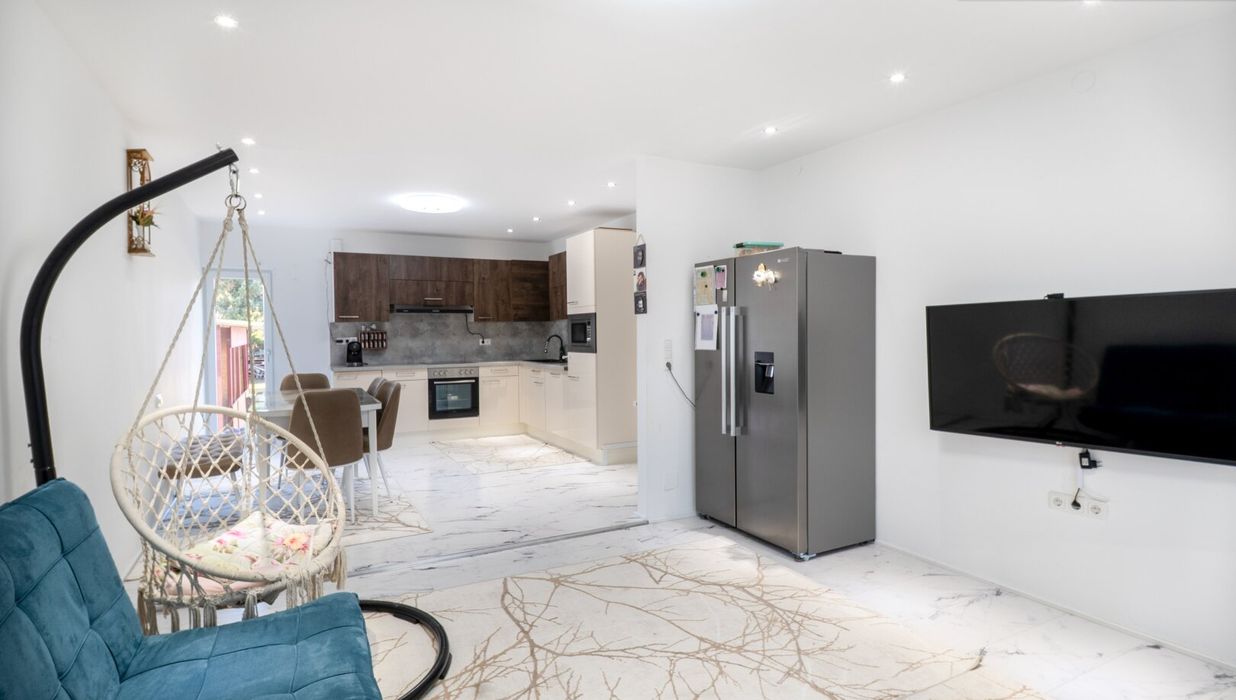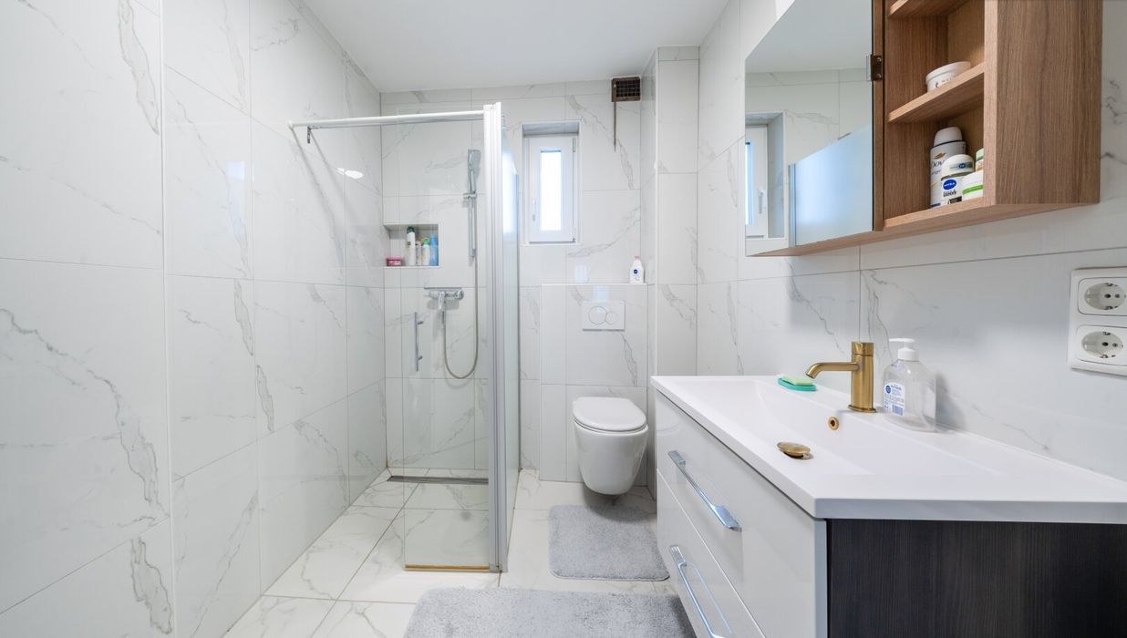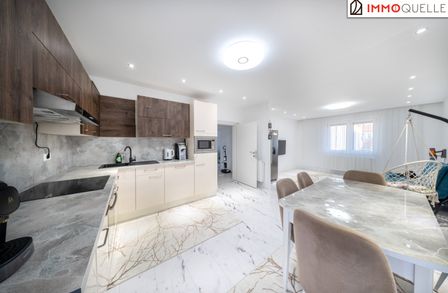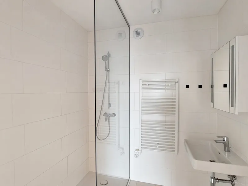 Rechts neben der Treppe eröffnet sich das Badezimmer mit Dusche, WC und Fenster - angenehm dimensioniert und lichtdurchflutet. Geradeaus gelangen Sie in das Herzstück des Hauses: die große Küche mit integriertem Essbereich. Hier trifft Funktionalität auf Geselligkeit. Die Einbauküche bietet ausreichend Platz zum Kochen, während der direkte Ausgang in den Garten eine wunderbare Verbindung zwischen Innen- und Außenraum schafft.