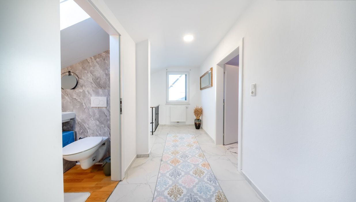 Bereits beim Betreten des Hauses empfängt Sie ein einladender Vorraum. Von hier aus führt ein praktischer Gang durch das Erdgeschoss und verbindet alle Räume auf angenehme Weise. Zur linken Seite öffnet sich das großzügige Wohnzimmer - ein Raum für gemeinsame Abende, Gespräche und entspannte Stunden. Gegenüber befindet sich die Treppe ins Obergeschoss sowie in den Vollkeller