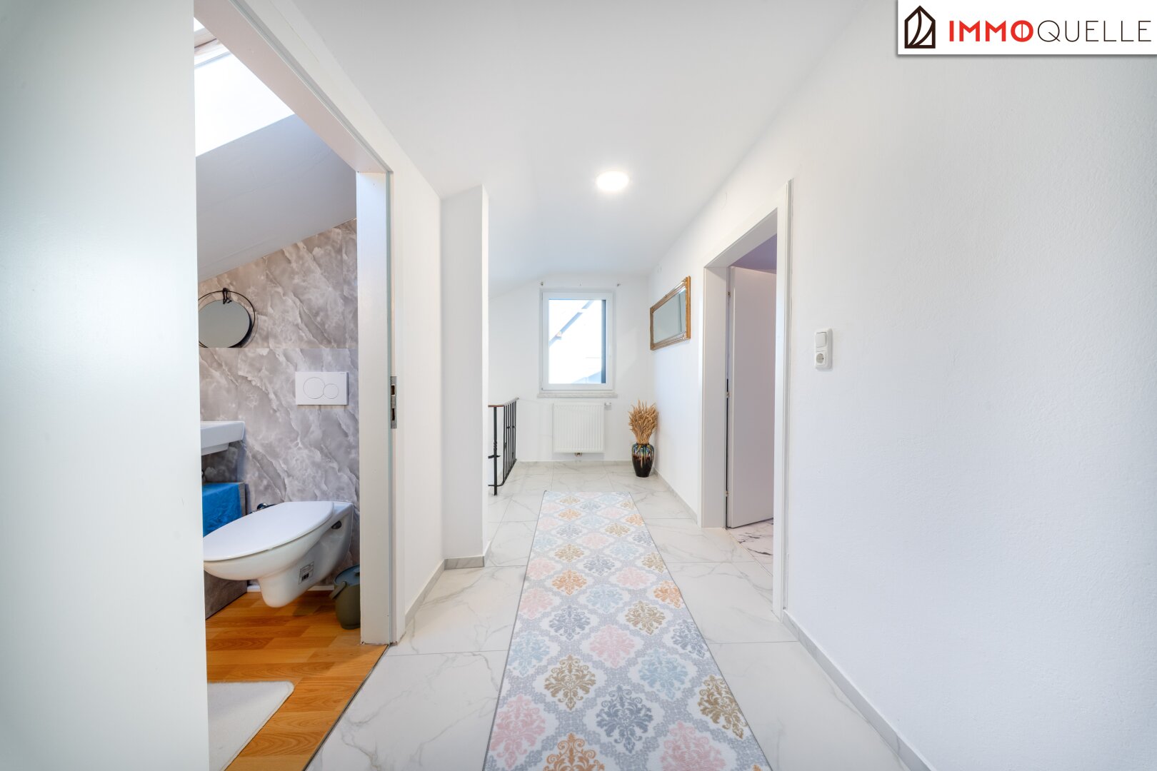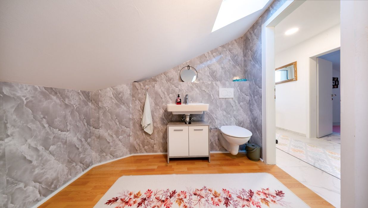 Im Obergeschoss setzt sich die durchdachte Raumaufteilung fort. Ein heller Gang verbindet alle Räume. Zur linken Seite befindet sich das großzügige Kinderzimmer, lichtdurchflutet und vielseitig nutzbar. Rechts liegt ein separates WC mit Waschbecken, von dem aus ein praktischer Abstellraum erreichbar ist. Geradeaus betreten Sie das große Elternschlafzimmer - ein Rückzugsort mit direktem Zugang zur rund 25 m² großen, westlich ausgerichteten Terrasse. Hier genießen Sie die Abendsonne und den Blick in den eigenen Garten.