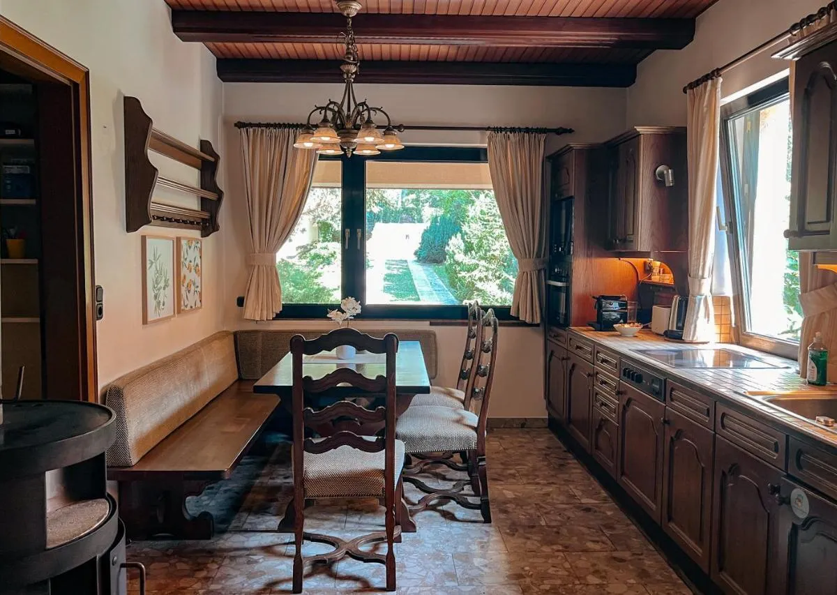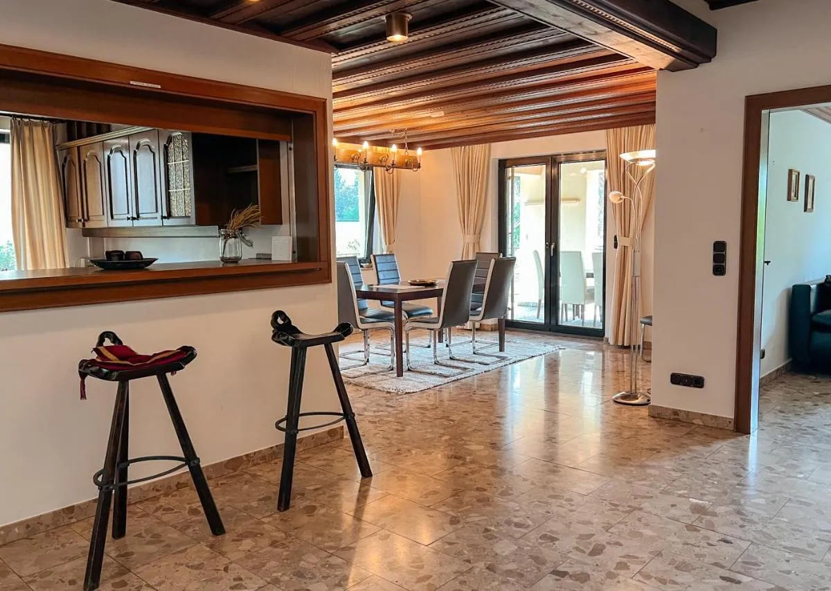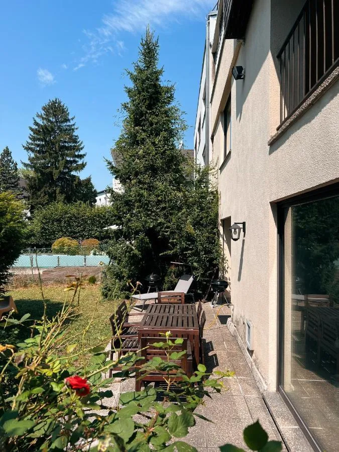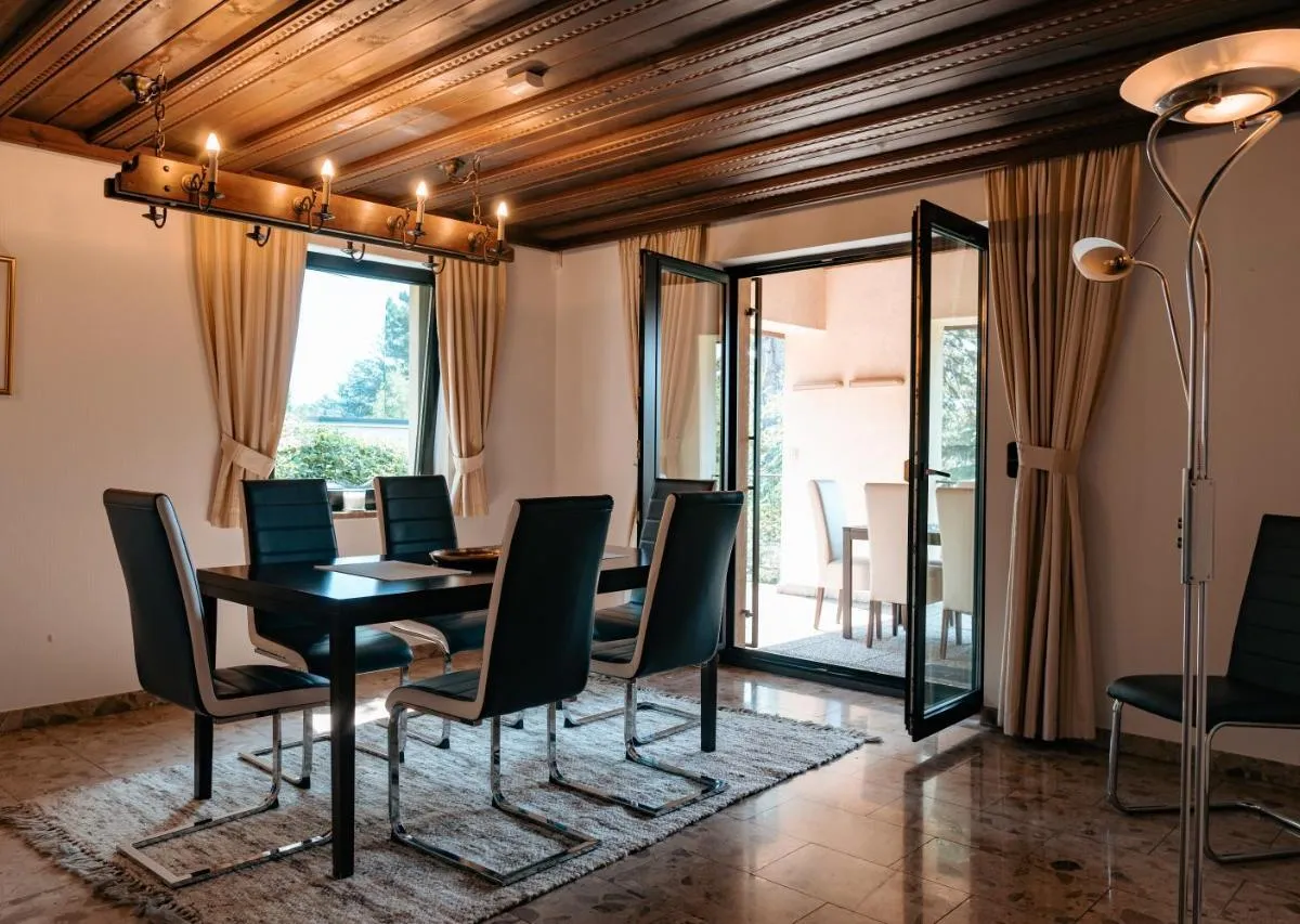 Von Essbereich gibt es einen direkten Zugang auf die überdachte Terrasse und den Garten.