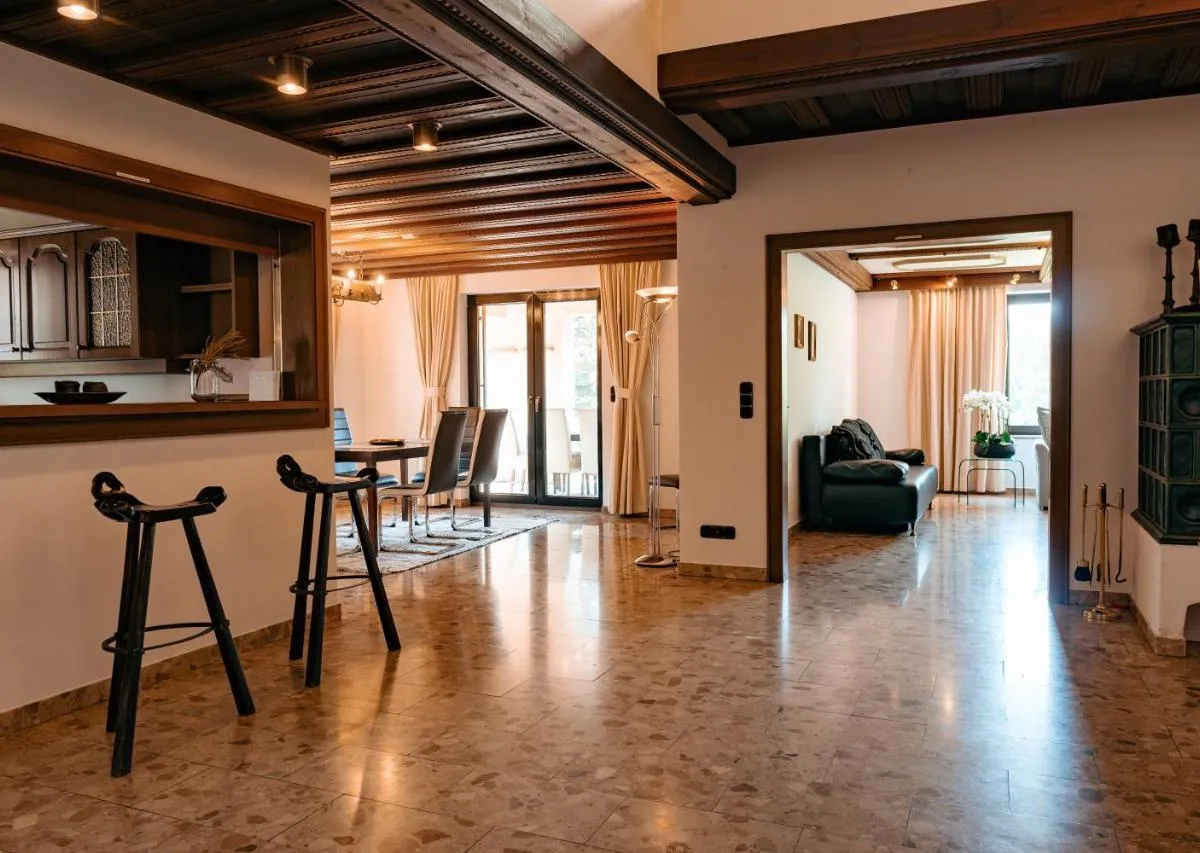 Im Erdgeschoss befindet ich der Eingangsbereich mit Abstellraum, WC und Schlaf/Arbeitszimmer, dann öffnet sich der Eingangsbereich in den großen Wohnbereich mit Küche, Bar, Essplatz und Wohnzimmer samt offenem Kamin.