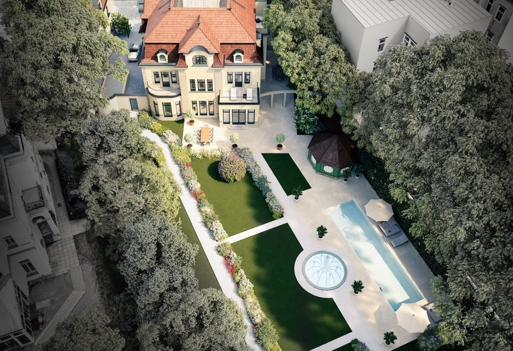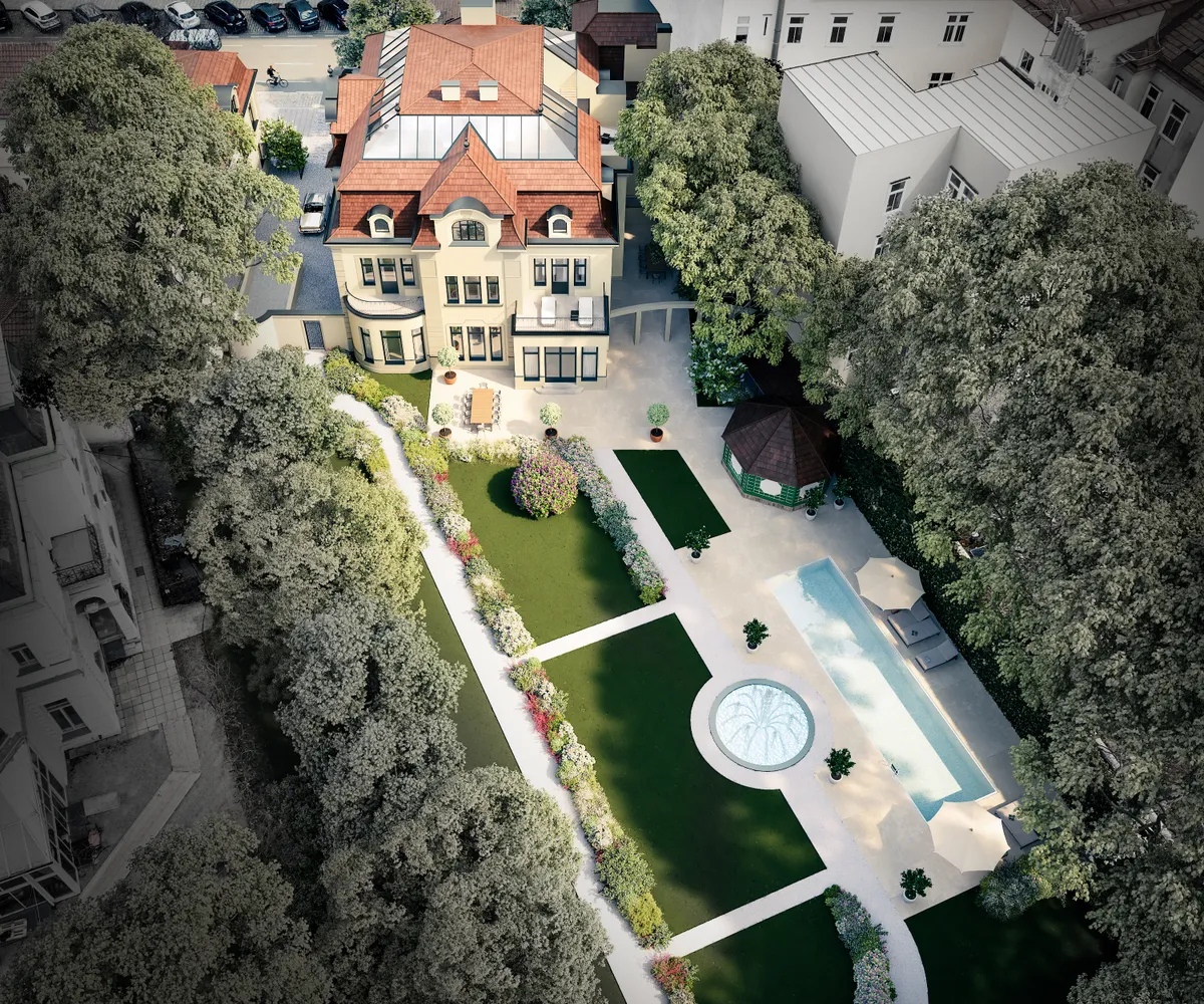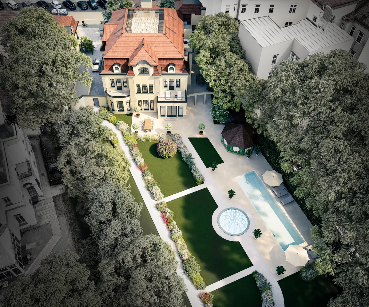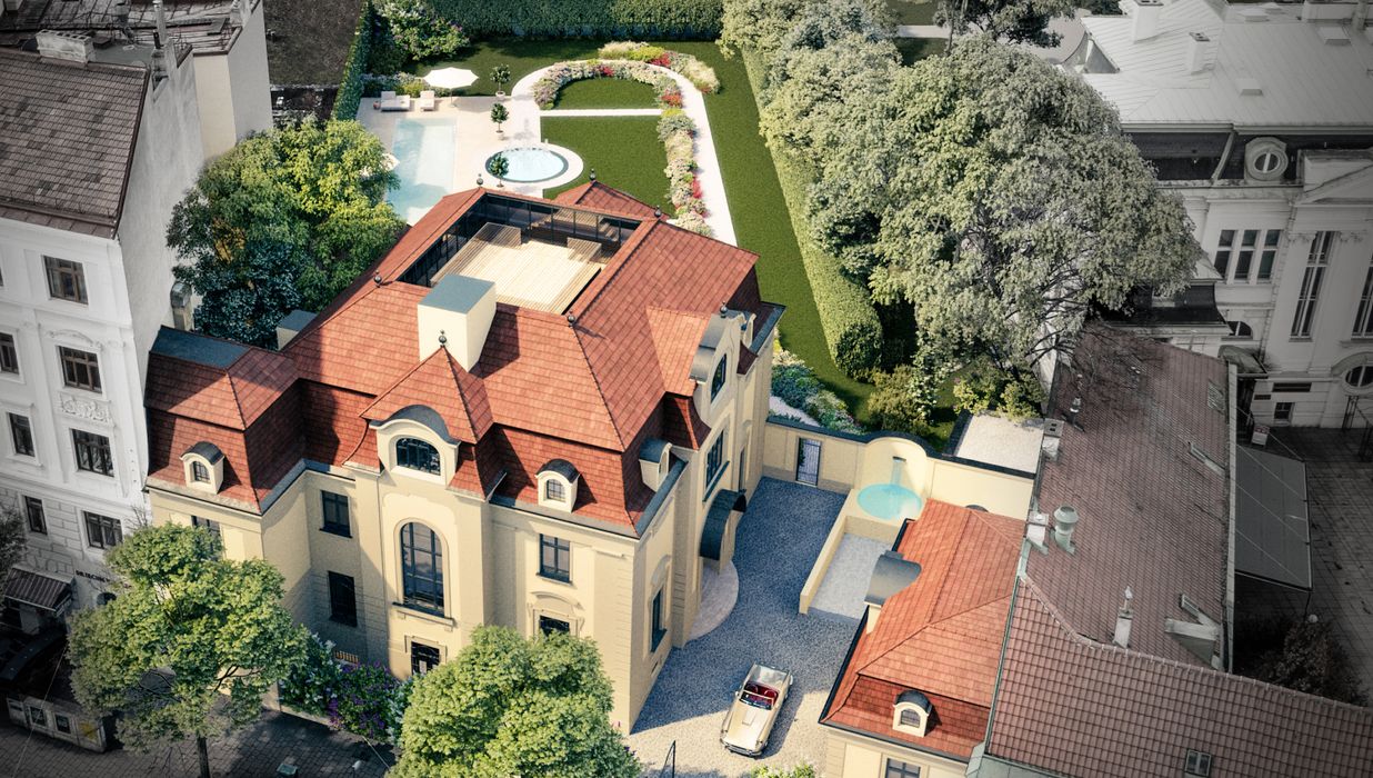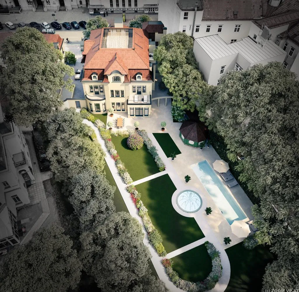 Die Immobilie beeindruckt durch ihr großes Entwicklungspotential. Eine aktuelle Planung zum Aus- und Umbau umfasst eine Erweiterung auf insgesamt vier Stockwerke mit einer unglaublichen Nutzfläche von ca. 1.455 m². Es sollen dabei luxuriöse Wohnbereiche, ein Wellnessbereich mit Pool, Sauna und Fitnessbereich sowie eine Tiefgarage inklusive KFZ-Aufzug entstehen.