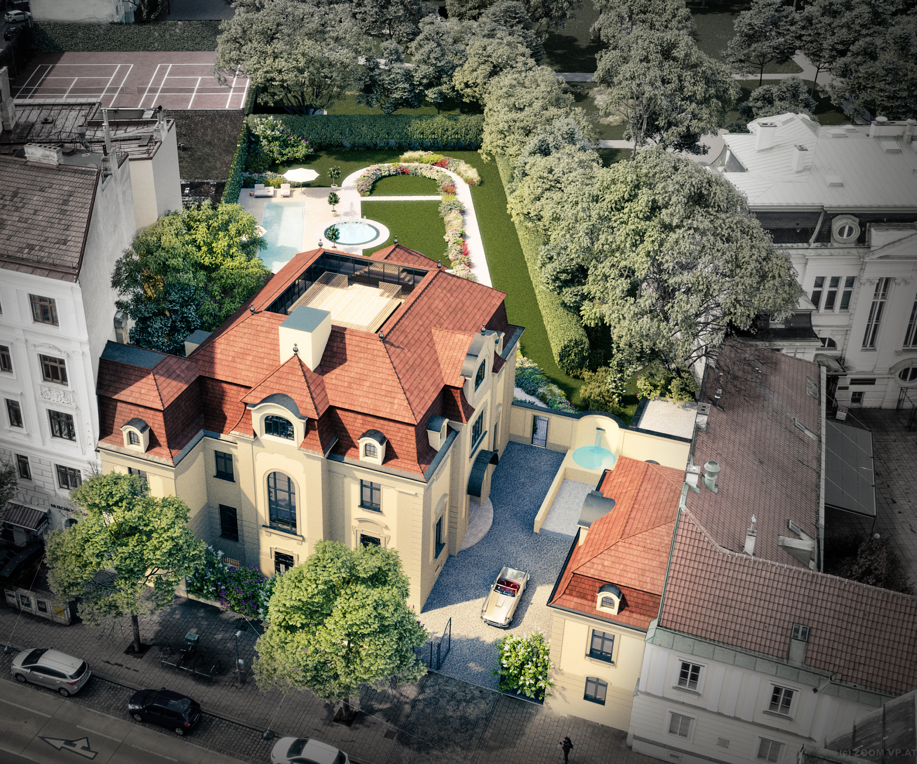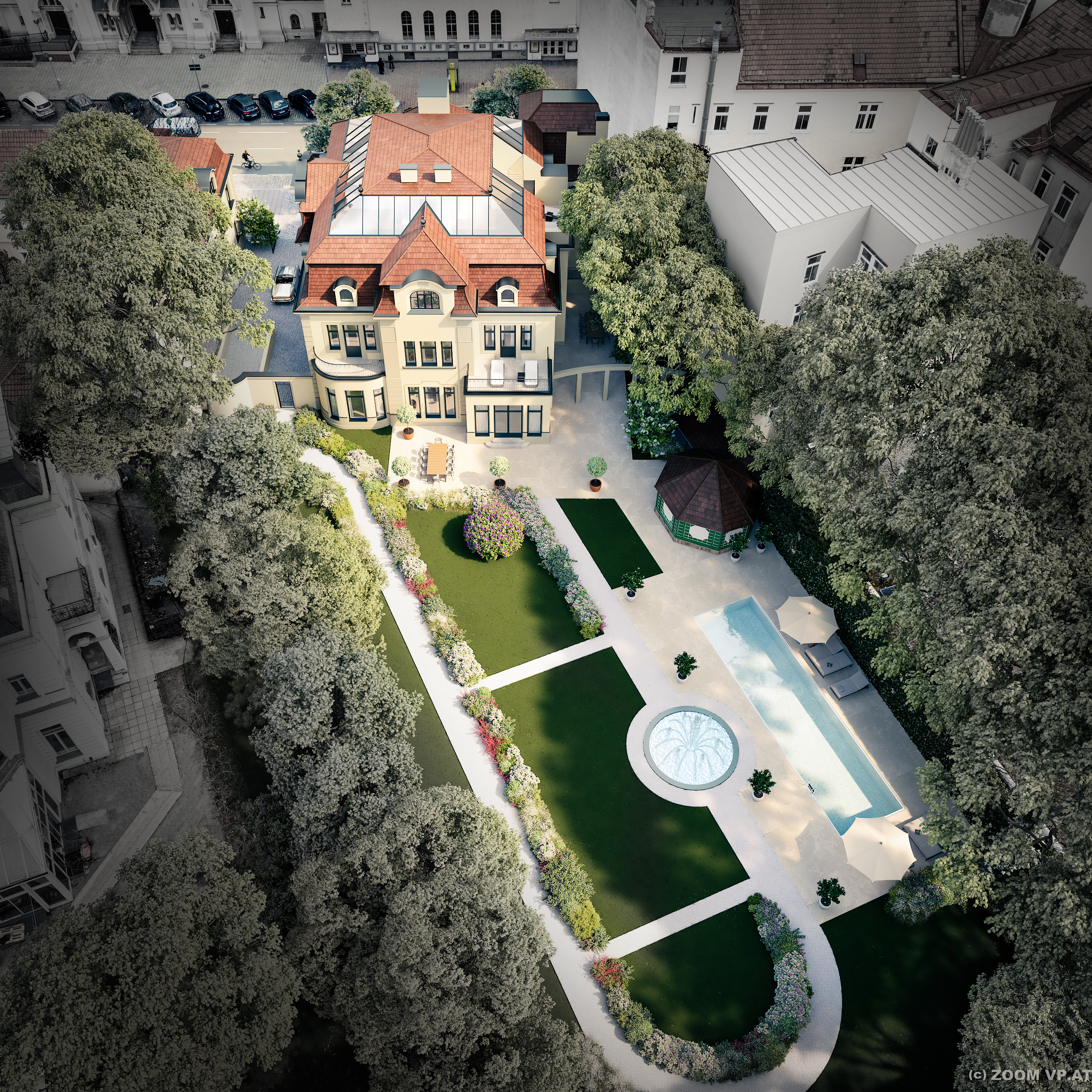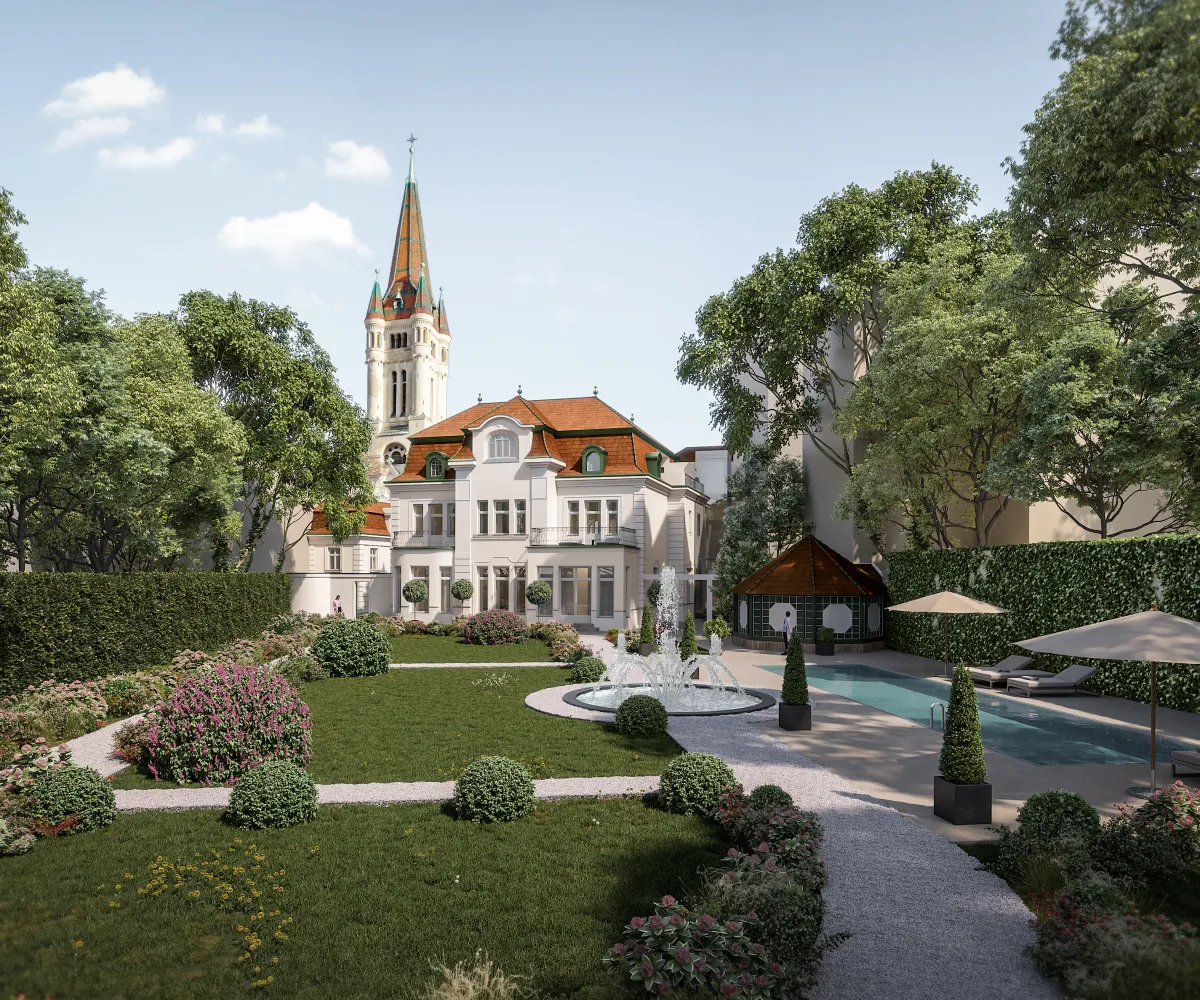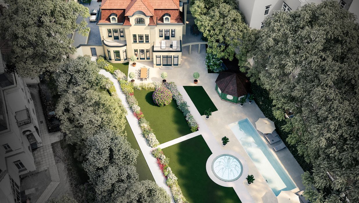 Die Immobilie beeindruckt durch ihr großes Entwicklungspotential. Eine aktuelle Planung zum Aus- und Umbau umfasst eine Erweiterung auf insgesamt vier Stockwerke mit einer unglaublichen Nutzfläche von ca. 1.455 m². Es sollen dabei luxuriöse Wohnbereiche, ein Wellnessbereich mit Pool, Sauna und Fitnessbereich sowie eine Tiefgarage inklusive KFZ-Aufzug entstehen.